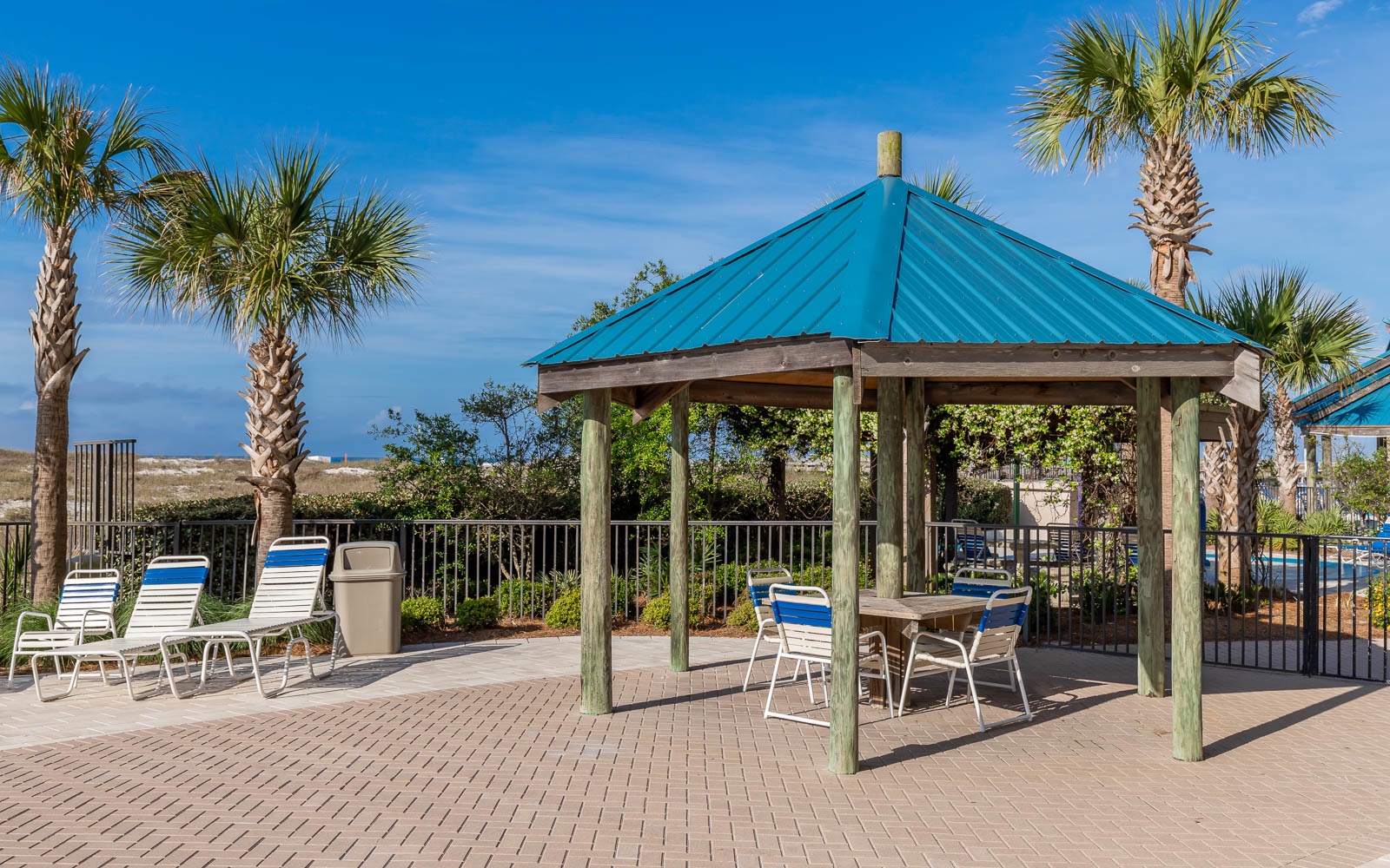 Outdoor amenities include direct beach access via a dedicated walkway, a Gulf-front zero-entry outdoor pool surrounded by lounge seating, and a children’s splash pad with shaded pavilion seating nearby. A picnic area with grilling stations allows guests to prepare meals and enjoy outdoor dining close to the pool area.
