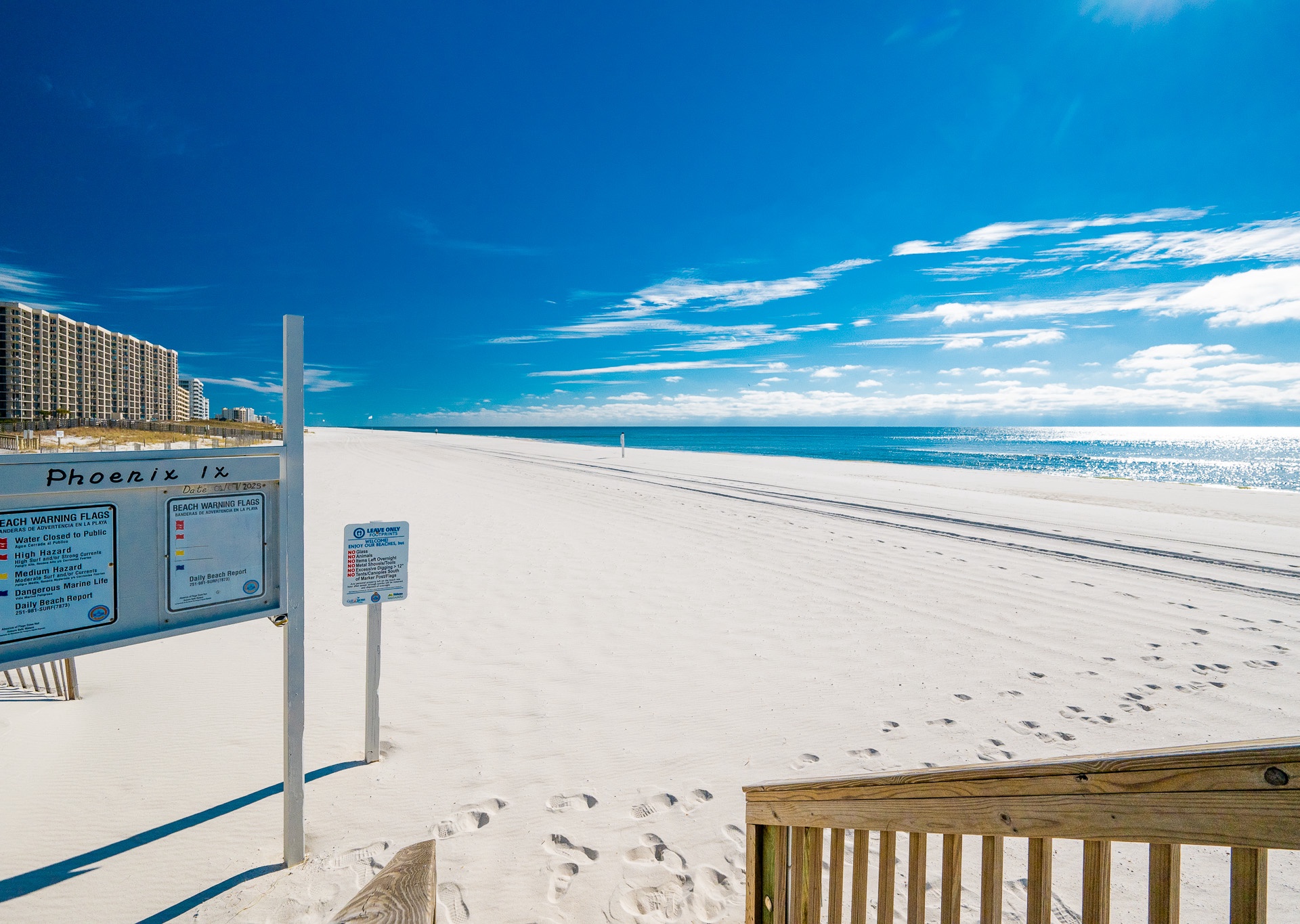 Phoenix IX is a beachfront condo located on the eastern end of Orange Beach near the Alabama–Florida border, offering a quieter stretch of sugar-white sand and convenient access to Orange Beach, Perdido Key, and nearby Gulf Shores. Positioned along miles of scenic shoreline, Phoenix IX provides a relaxed coastal setting with expansive views of both the Gulf of Mexico and the bay.
