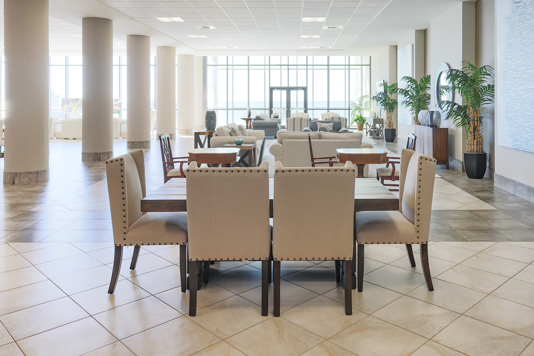 Even if it’s raining, you don’t have to miss out on the fun. Inside, you’ll find luxurious multi-level lobbies leading to a huge indoor pool, multiple bubbling hot tubs, an inviting sauna, a fun game room, and a beautiful multi-level fitness center. There’s even completely covered, glassed-in parking, so it’s easy to explore all of Orange Beach and Gulf Shores and then head back home to your beachfront retreat.