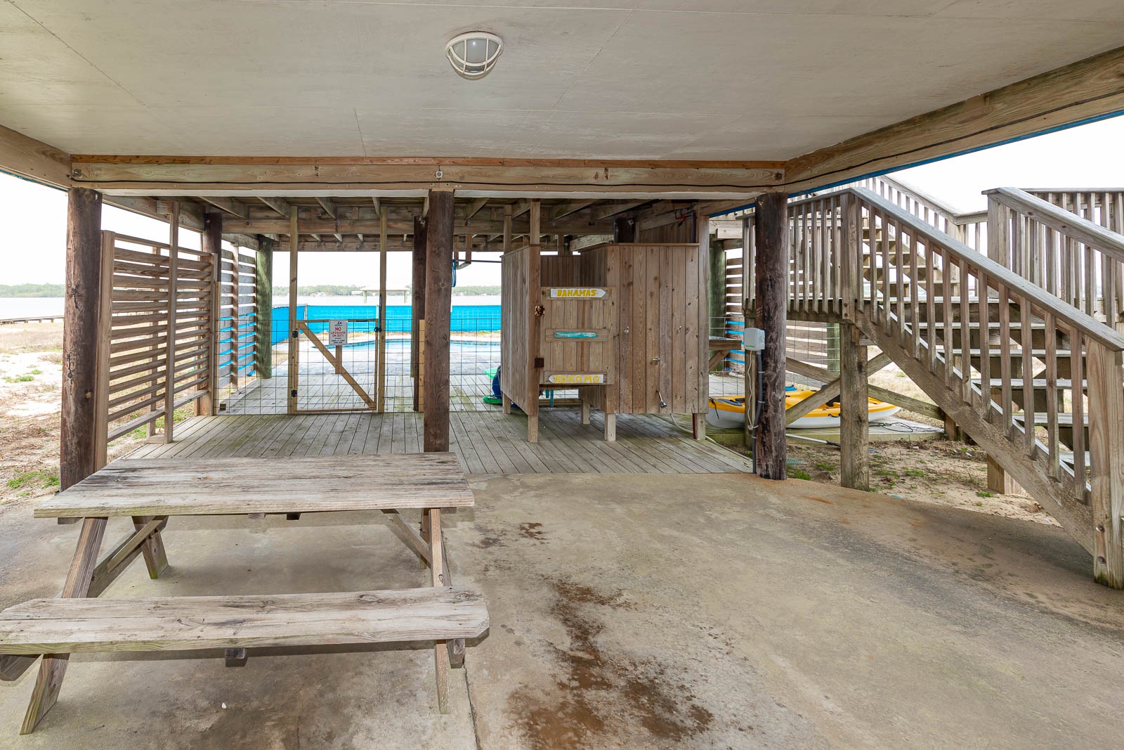 At Blue Lagoon Escape it’s all about the outdoor space. Enjoy your coffee on the covered deck watching wildlife in the lagoon and eat your breakfast al fresco at the outdoor dining table. Dip your toes in the water on your own sandy beach, or slip a rented kayak, paddle board, or boat into the water along a private pier. The covered pier even features a ladder to step down into the lagoon for a dip and a picnic table perfect for snack breaks. Wash off the sand in the outdoor shower before floating in the private lagoon-front pool.