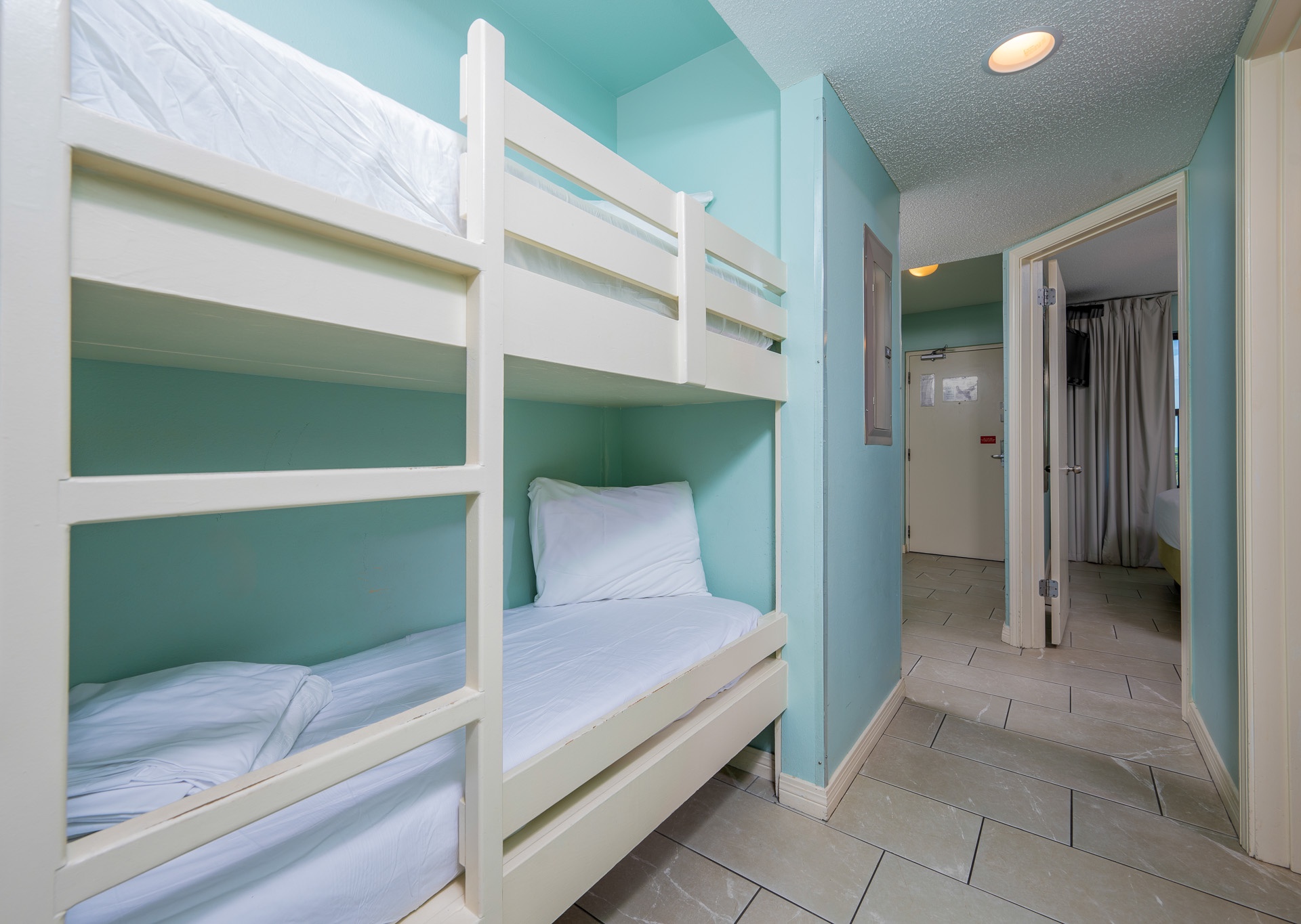 The suite features a full-size kitchen, fully equipped for your cooking needs, and a separate living room to relax after a day of fun in the sun. The private bedroom includes a cozy king-size bed with an en-suite bathroom, while the hallway features built-in bunk beds perfect for small children. An additional half bath adds extra convenience for your stay.