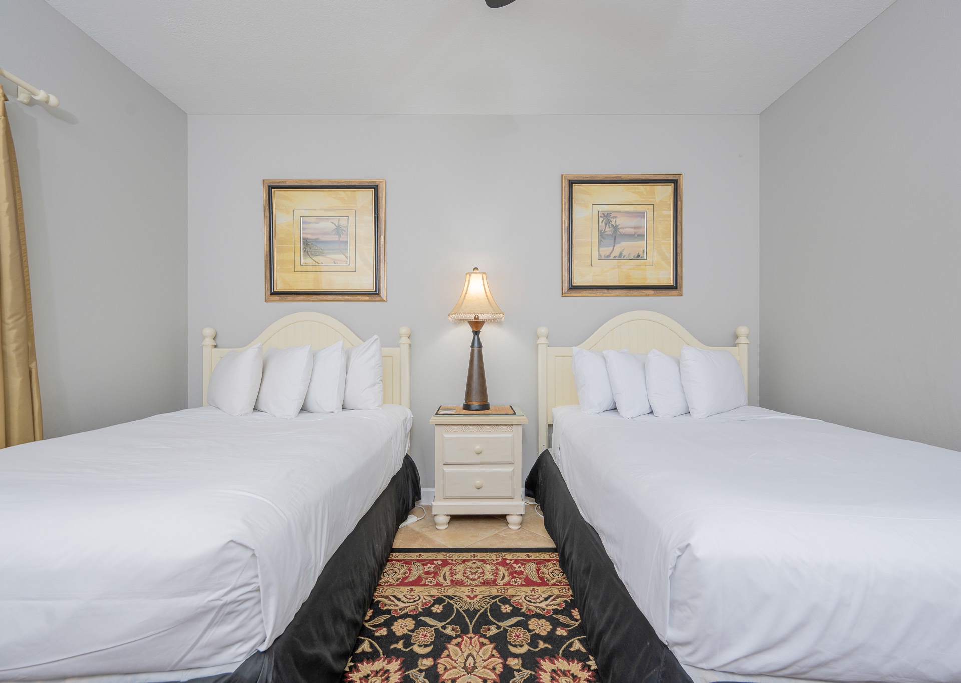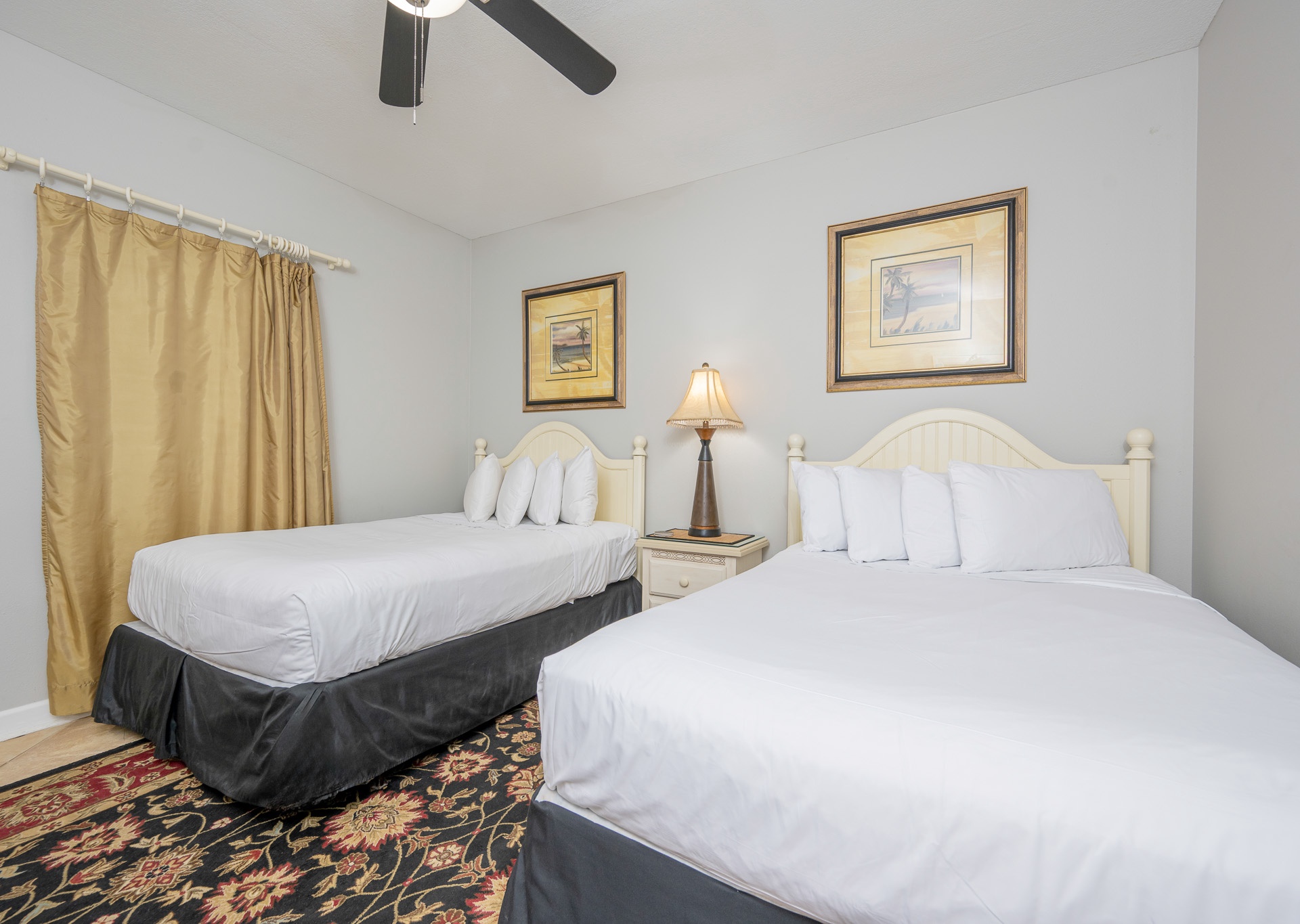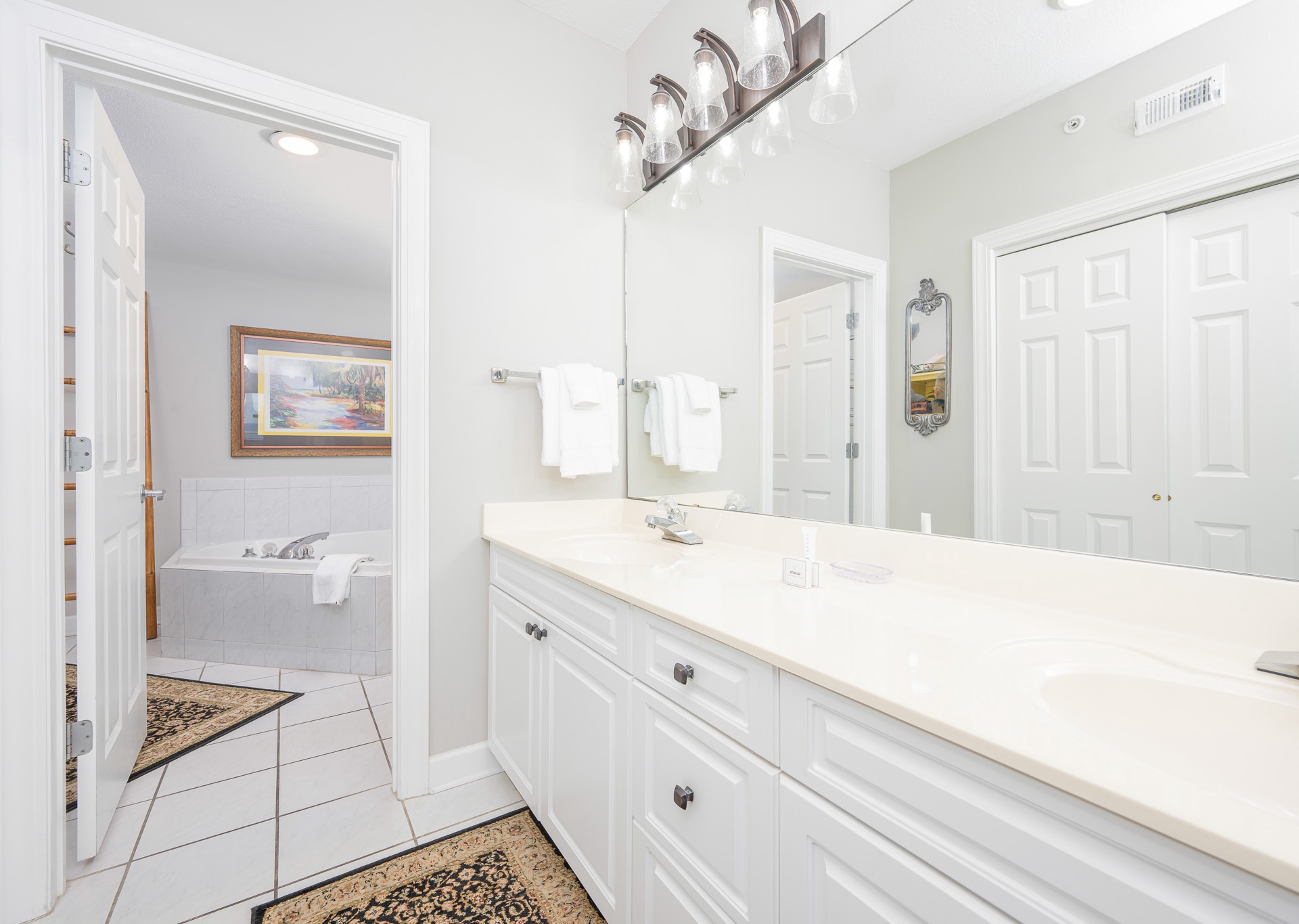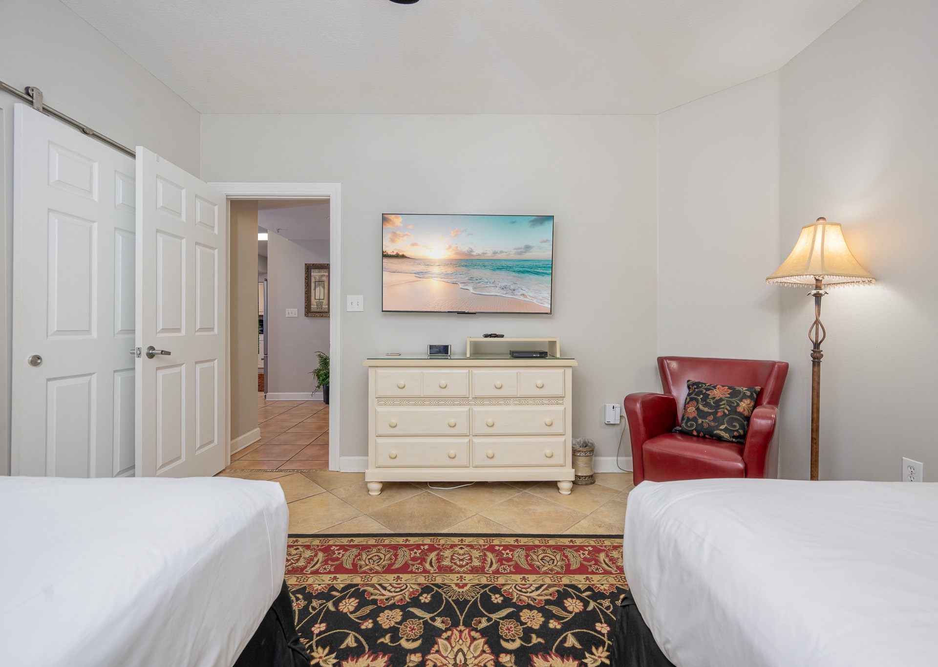 • 3rd Bedroom: Two full-size beds, flat-screen TV, access to third bathroom with single vanity and tub/shower combo