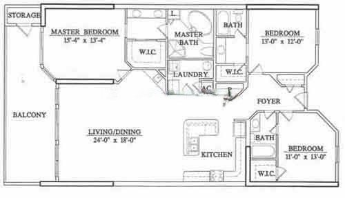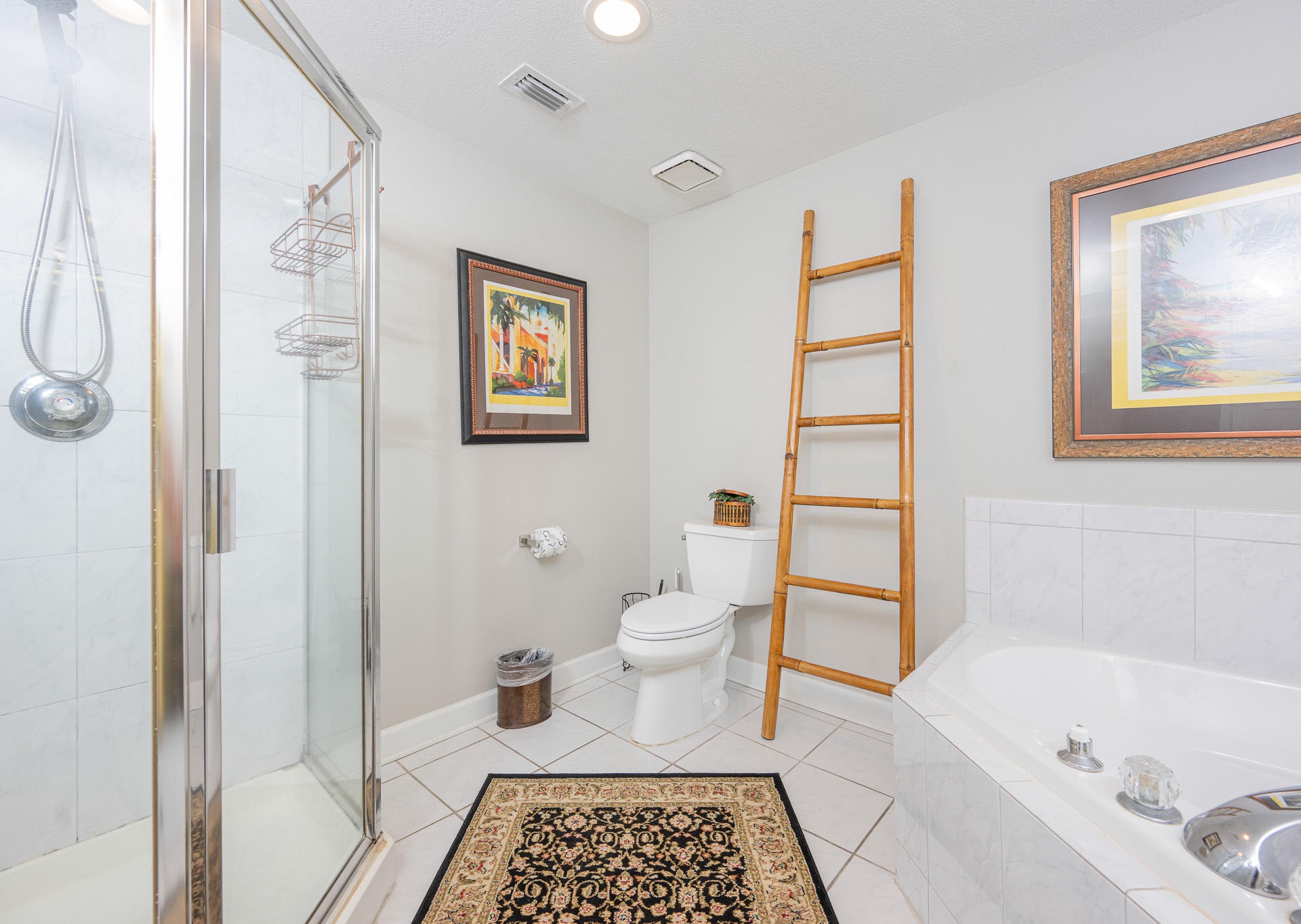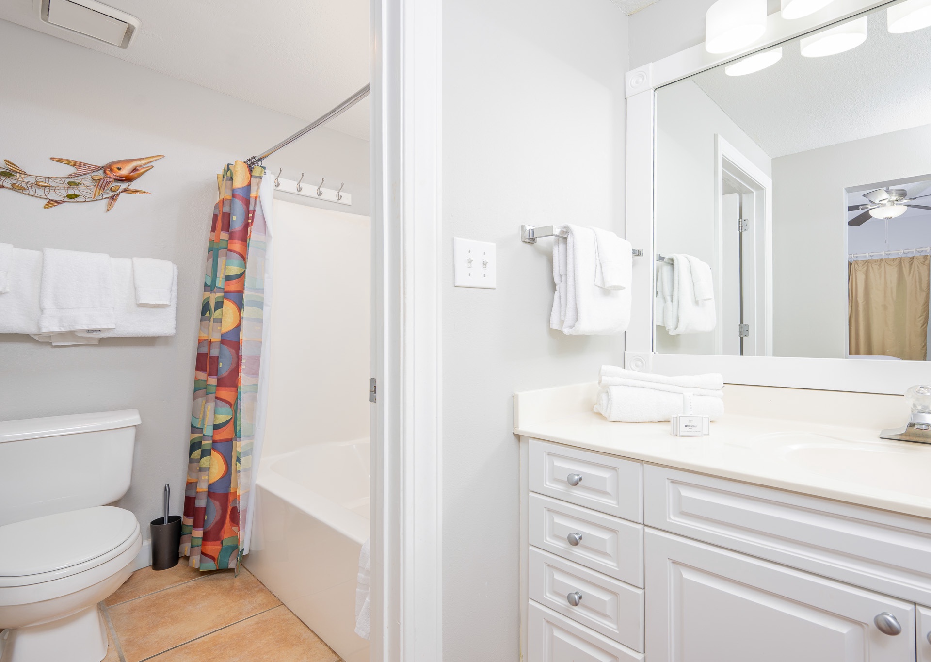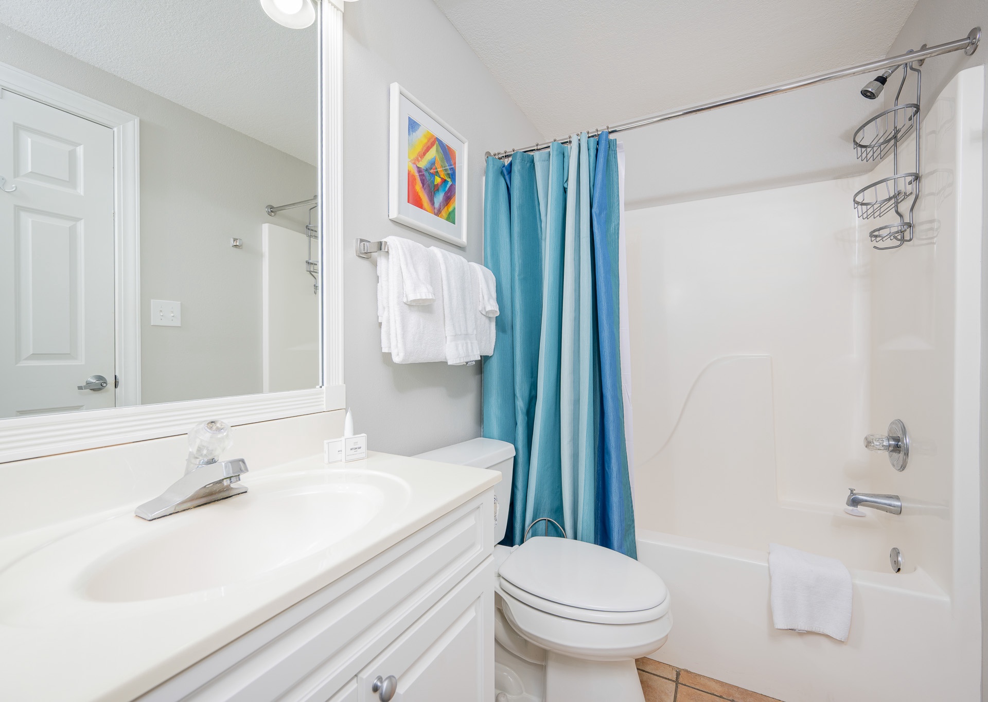• 3rd Bedroom: Two full-size beds, flat-screen TV, access to third bathroom with single vanity and tub/shower combo