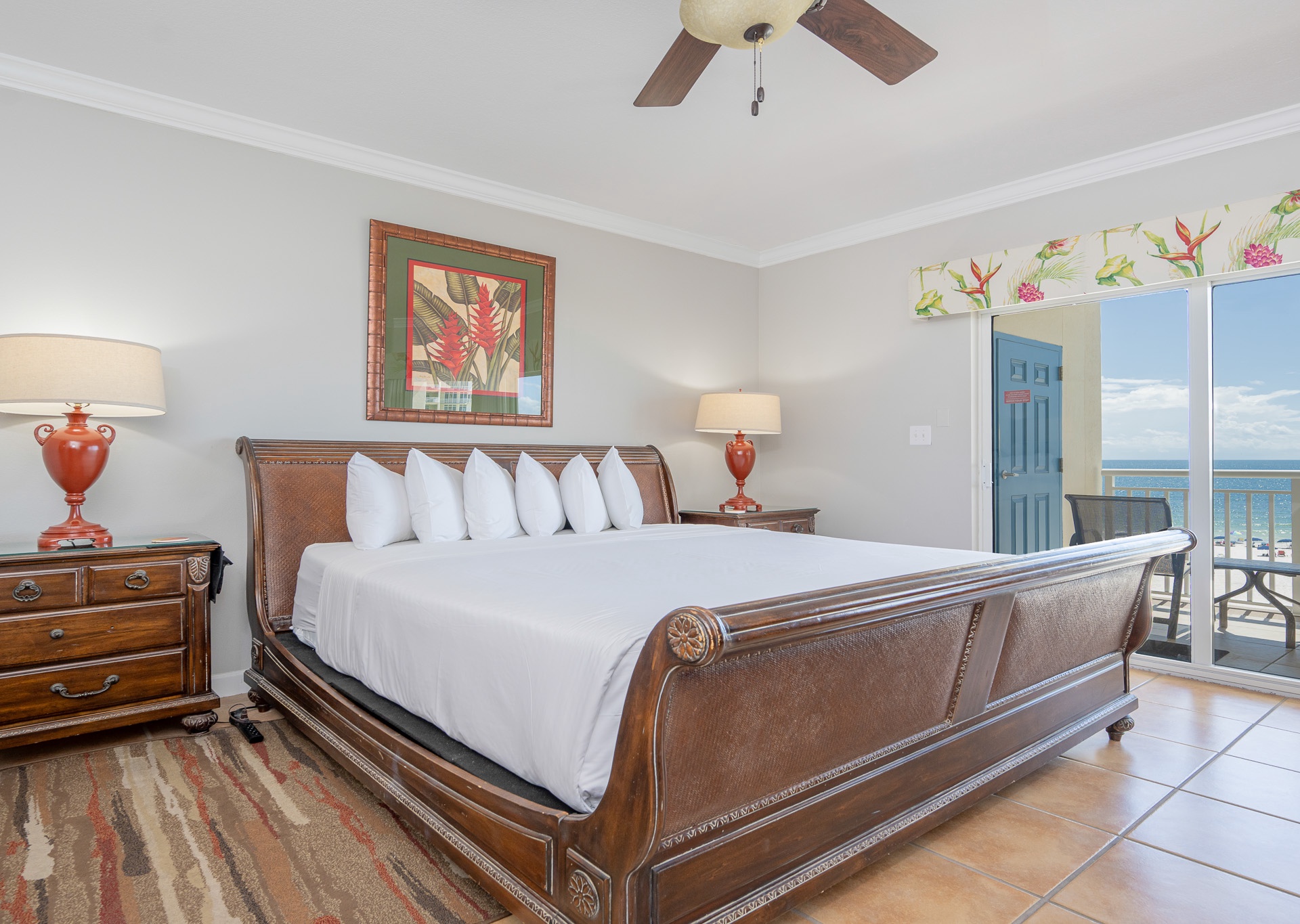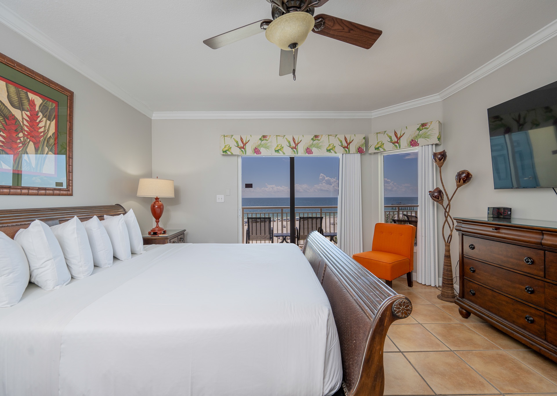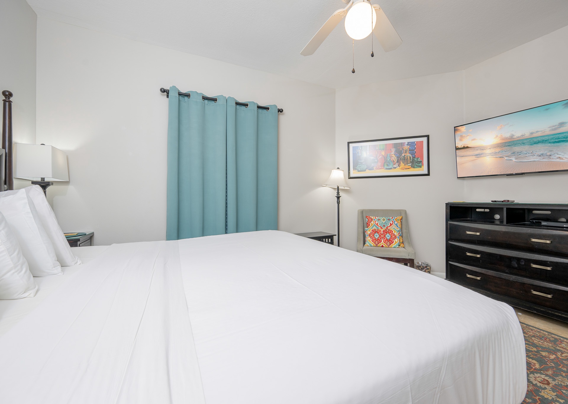 • 2nd Bedroom: King bed, flat-screen TV, private bath with single vanity and tub/shower combo with private water closet