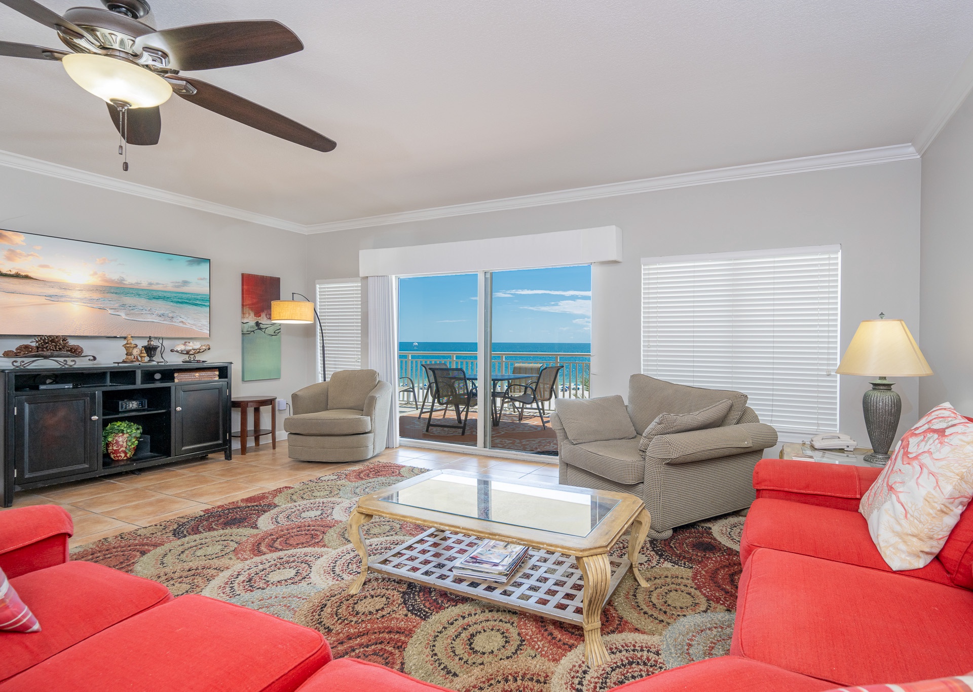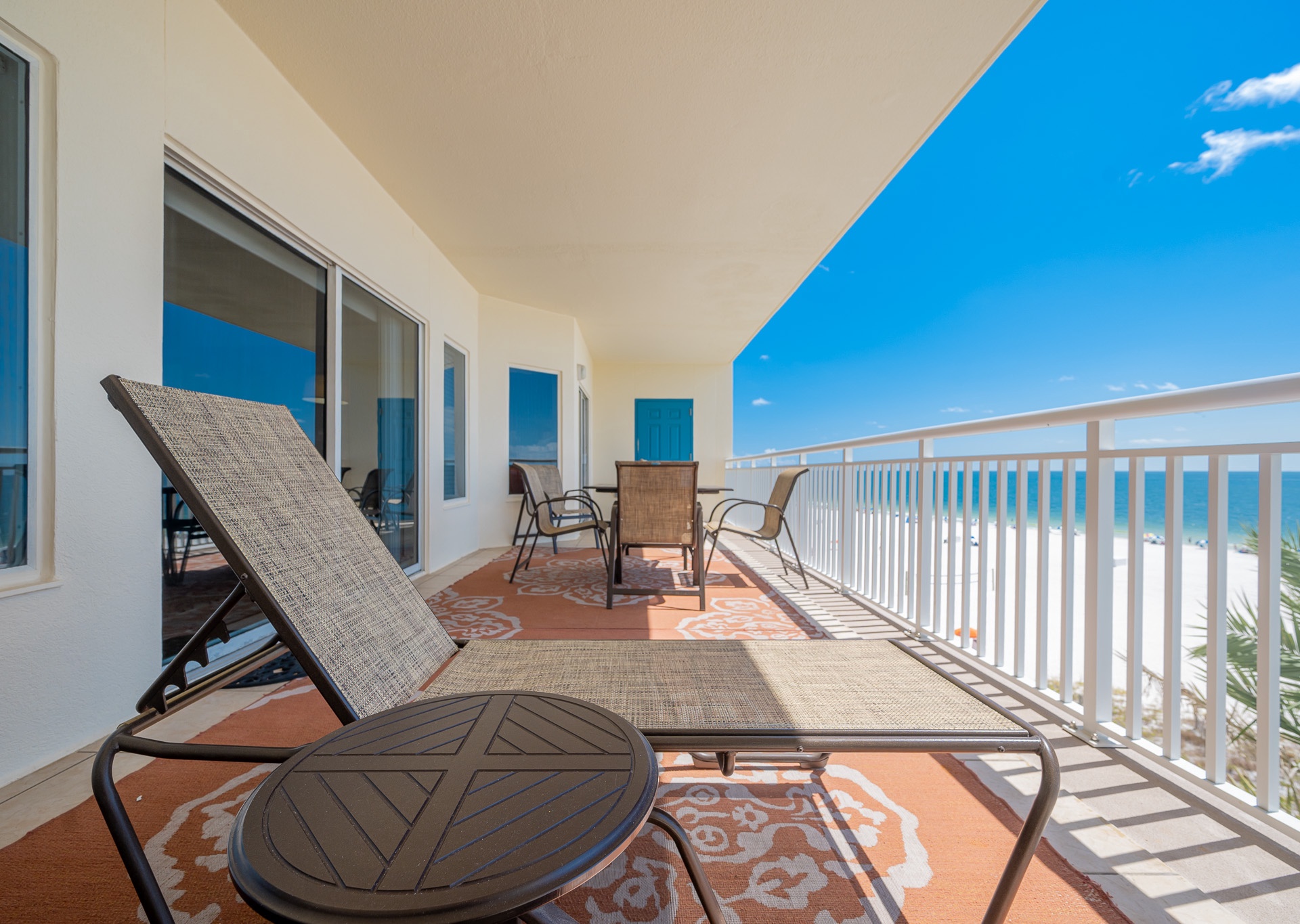 The open living area features comfortable furnishings and leads directly to a spacious Gulf-front balcony—perfect for enjoying the sea breeze and sunsets. The balcony includes plenty of seating, a dining table, and a chaise lounge for relaxing outdoors.