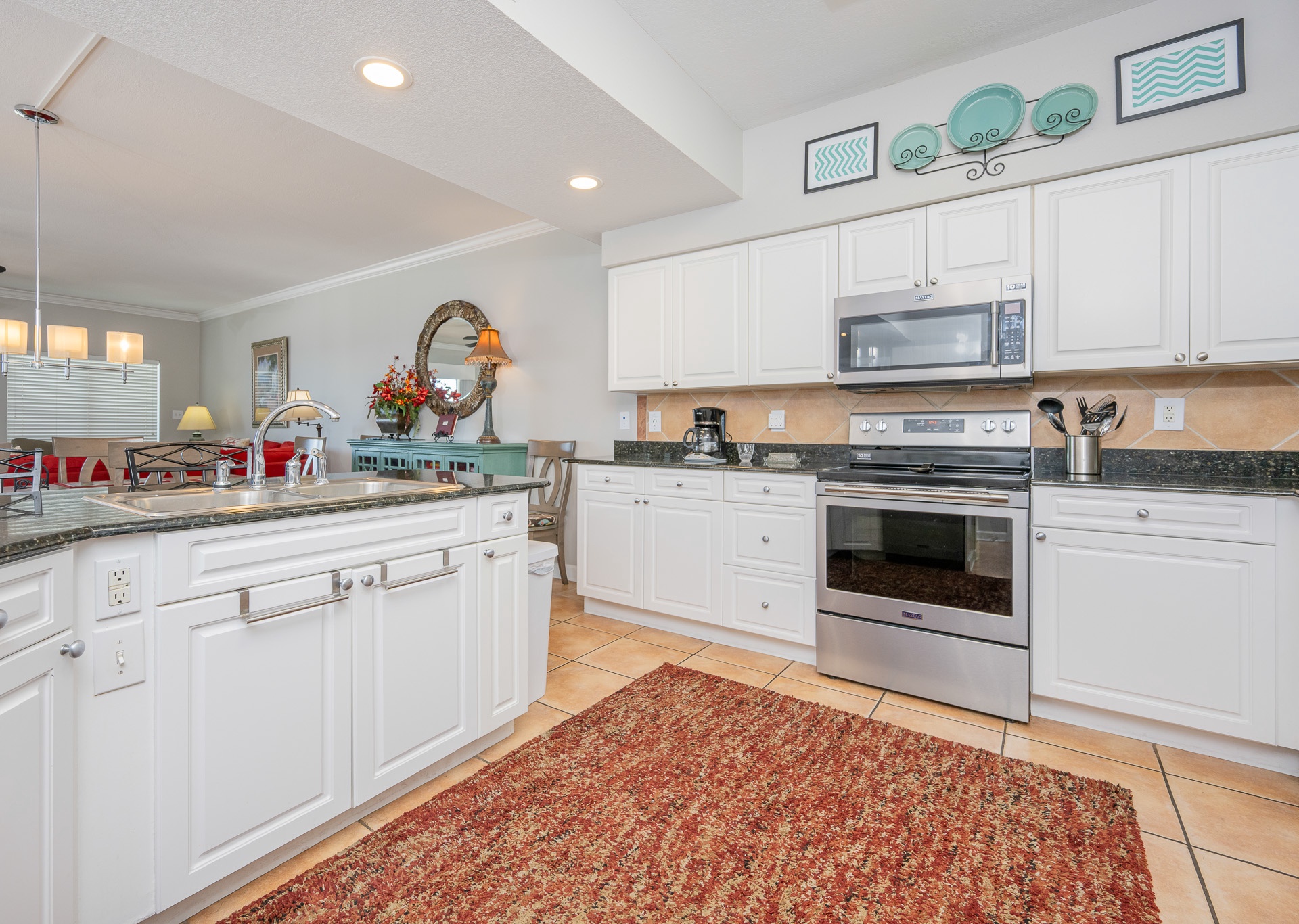 • Kitchen: White cabinetry, black granite countertops, stainless steel appliances, and fully equipped for all your culinary needs