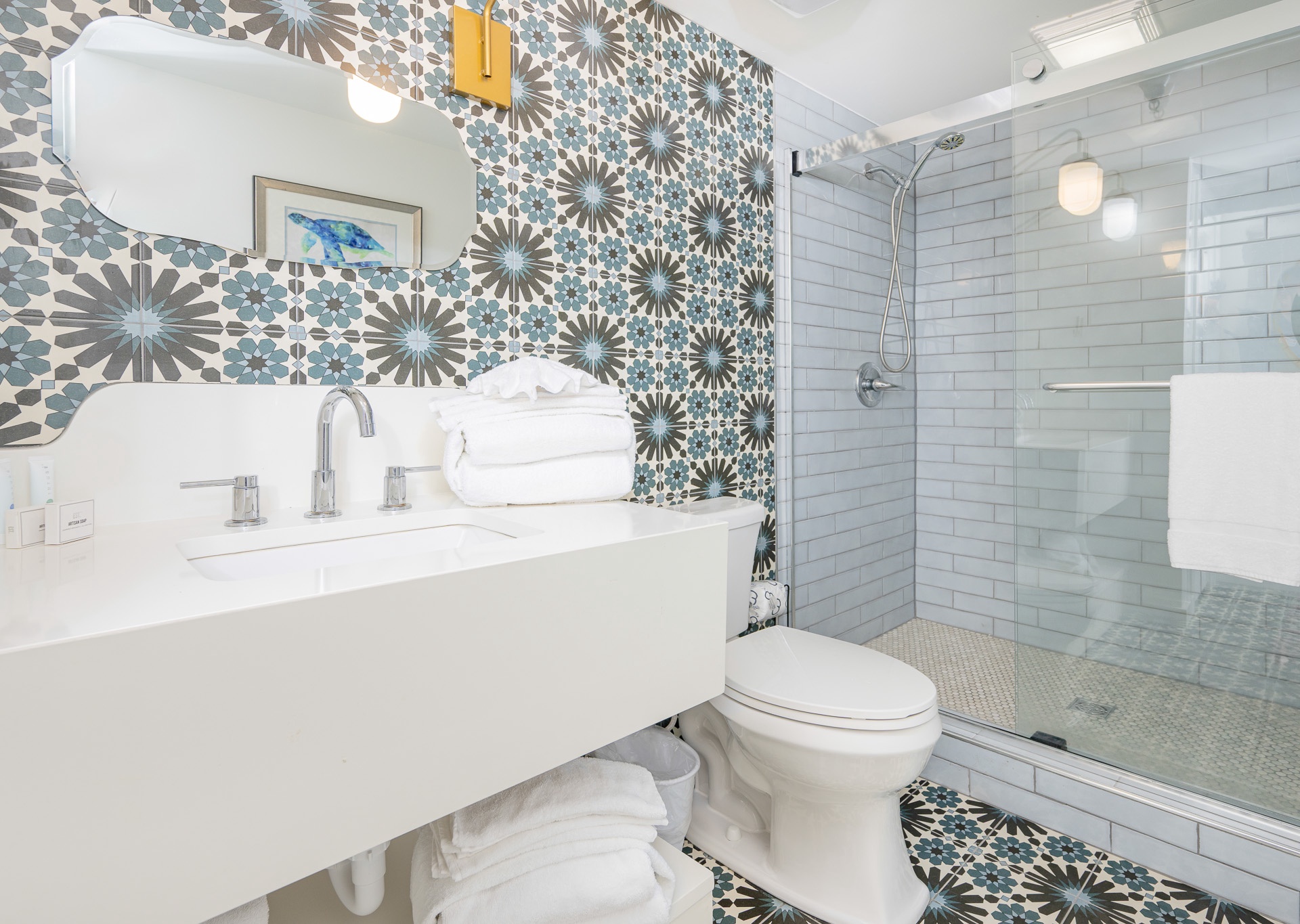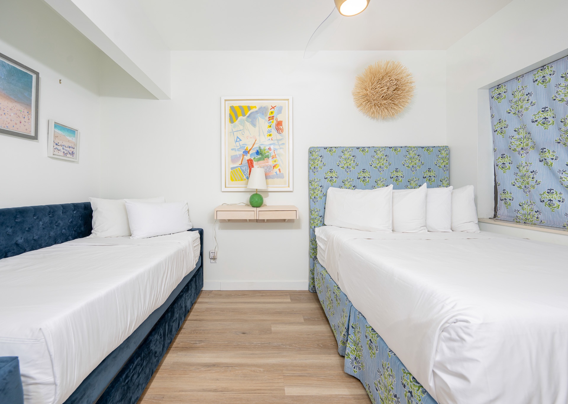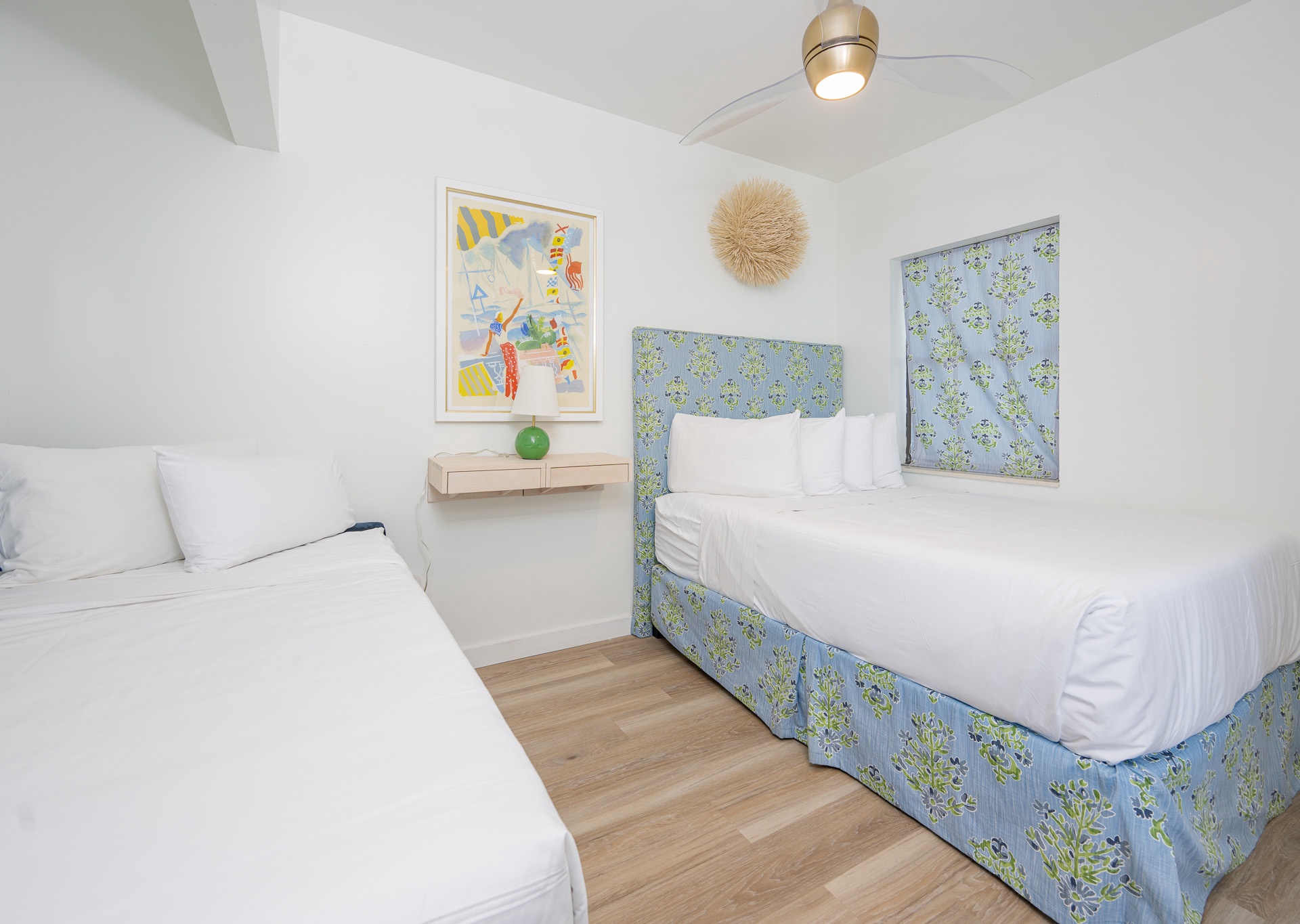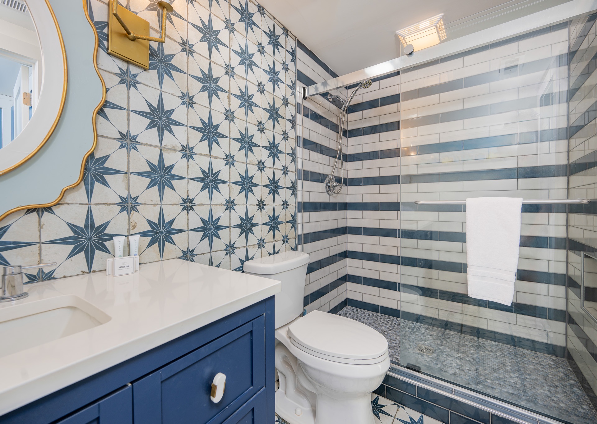 The third bedroom is perfectly set up for extra guests or kids, with a full-size bed, twin bed, and a pull-out trundle. The third bathroom features another large walk-in shower with glass doors and upscale finishes.