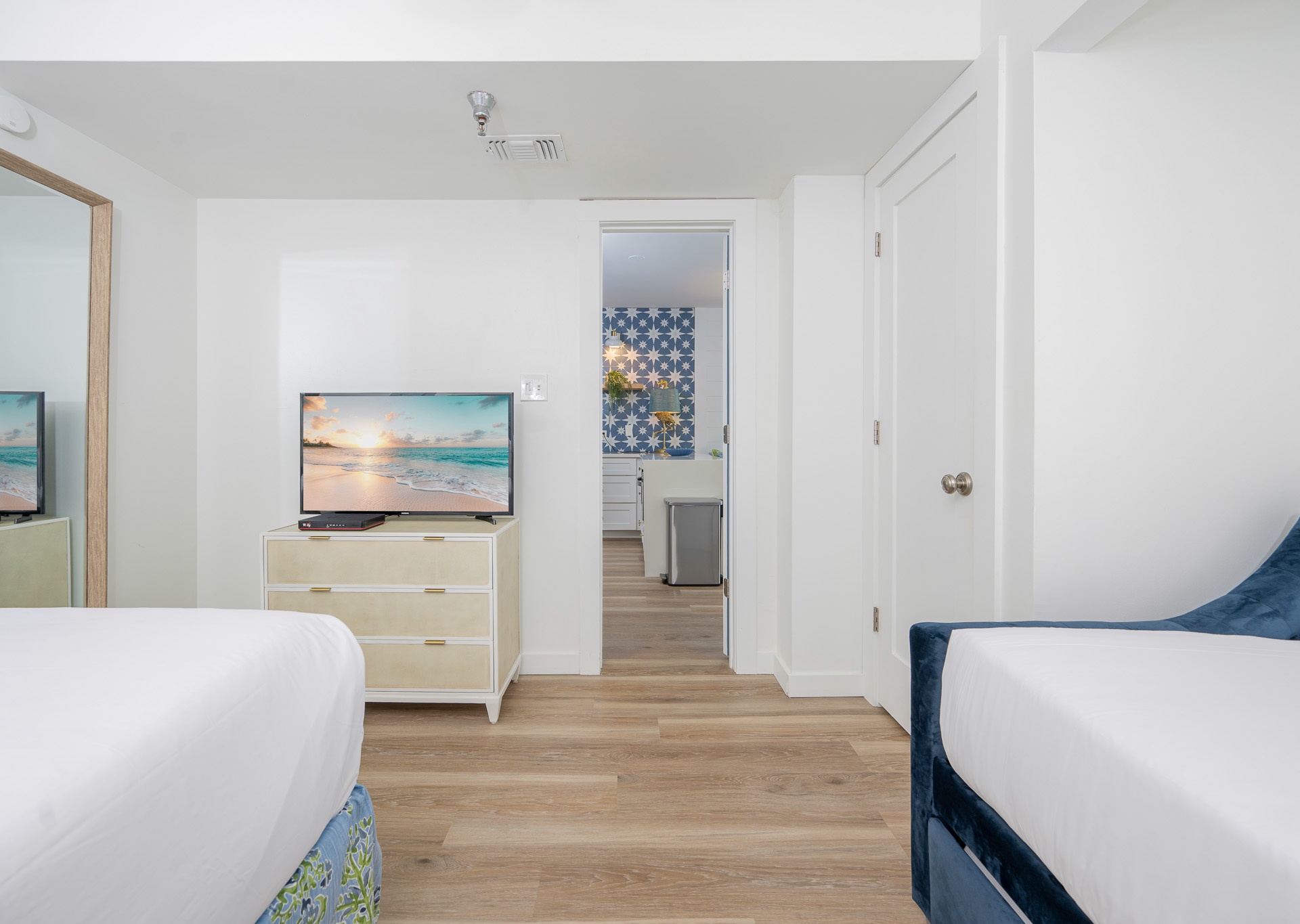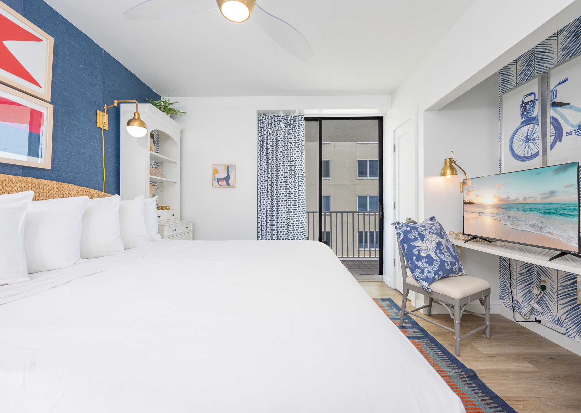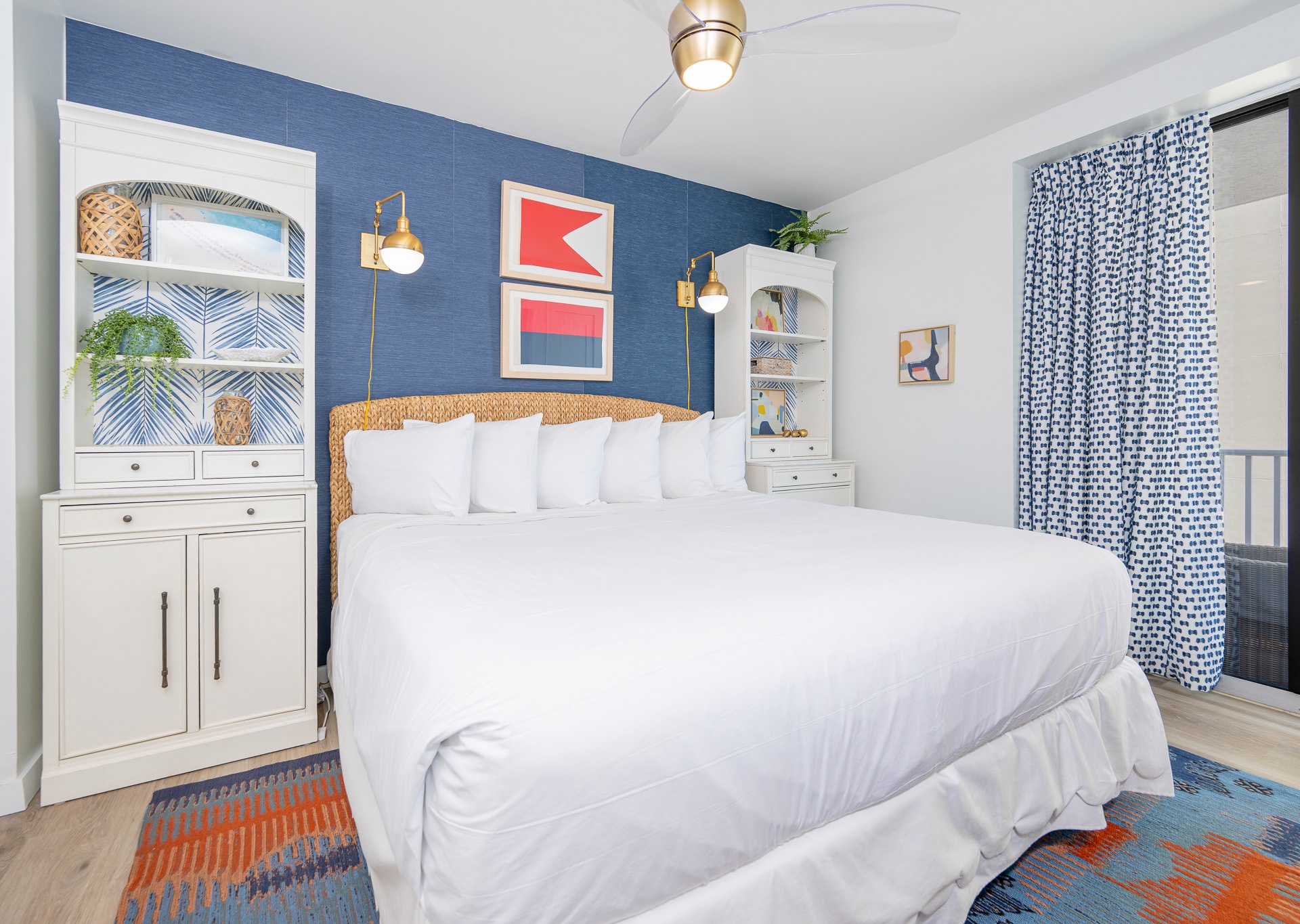 The second bedroom also includes a king-size bed, access to the balcony, and its own bathroom with a walk-in tiled shower, gorgeous vanity, and updated lighting. A flat screen TV, desk area, and ceiling fan complete the room, offering both comfort and convenience.