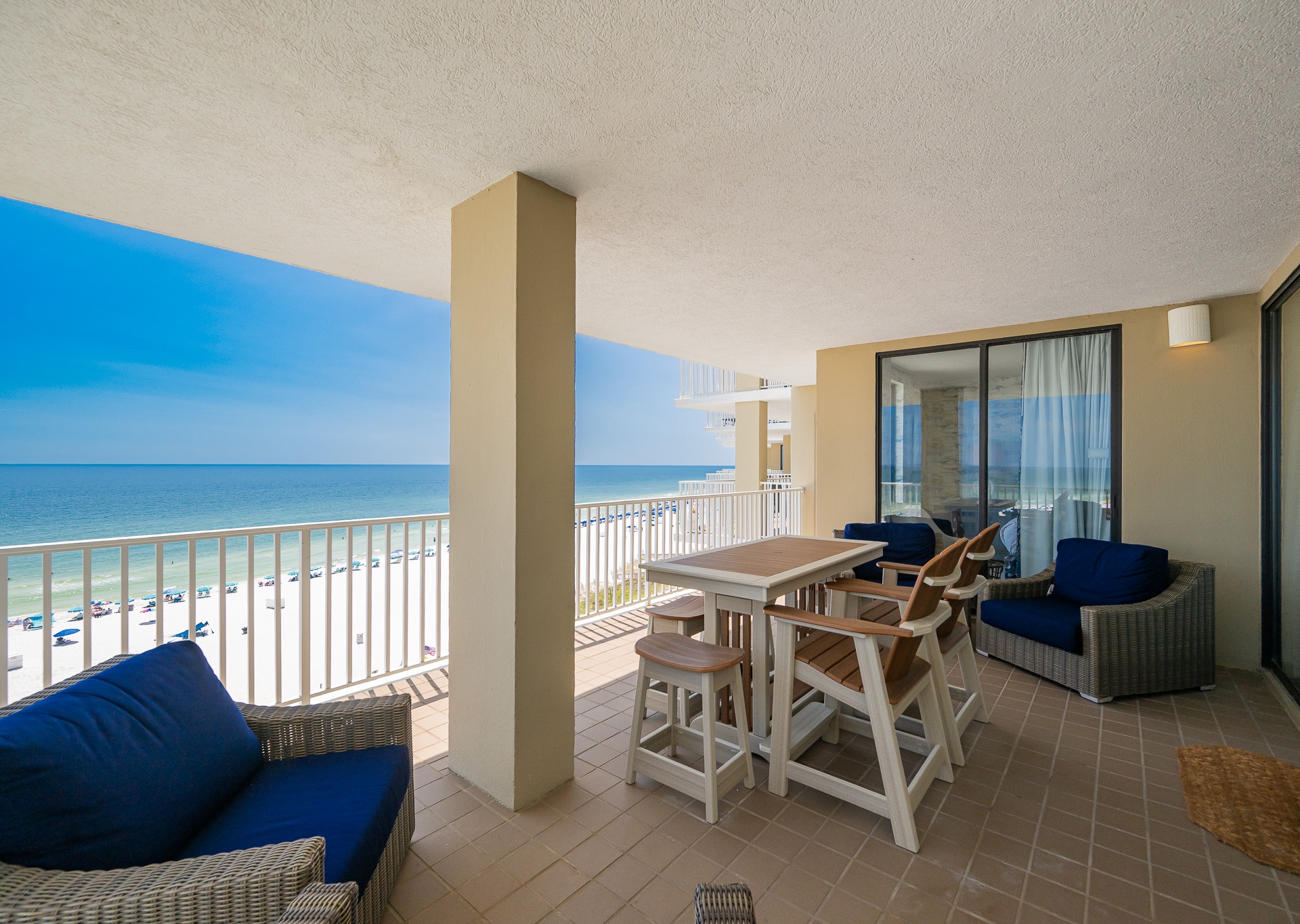 The living and dining areas are framed by floor-to-ceiling windows, filling the space with natural light and offering expansive Gulf views. Step out onto the large, private balcony, complete with plush, cushioned furniture, including a comfortable outdoor sofa, the perfect spot to relax and enjoy the gulf breeze.
