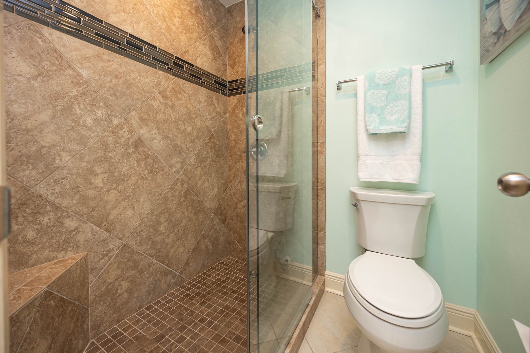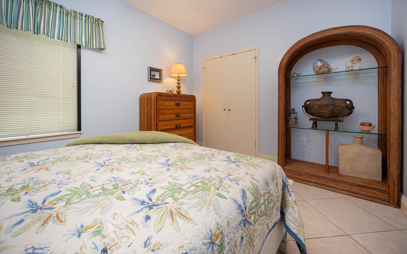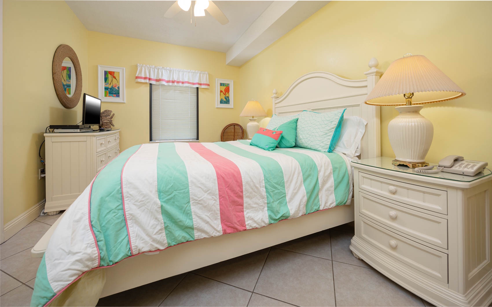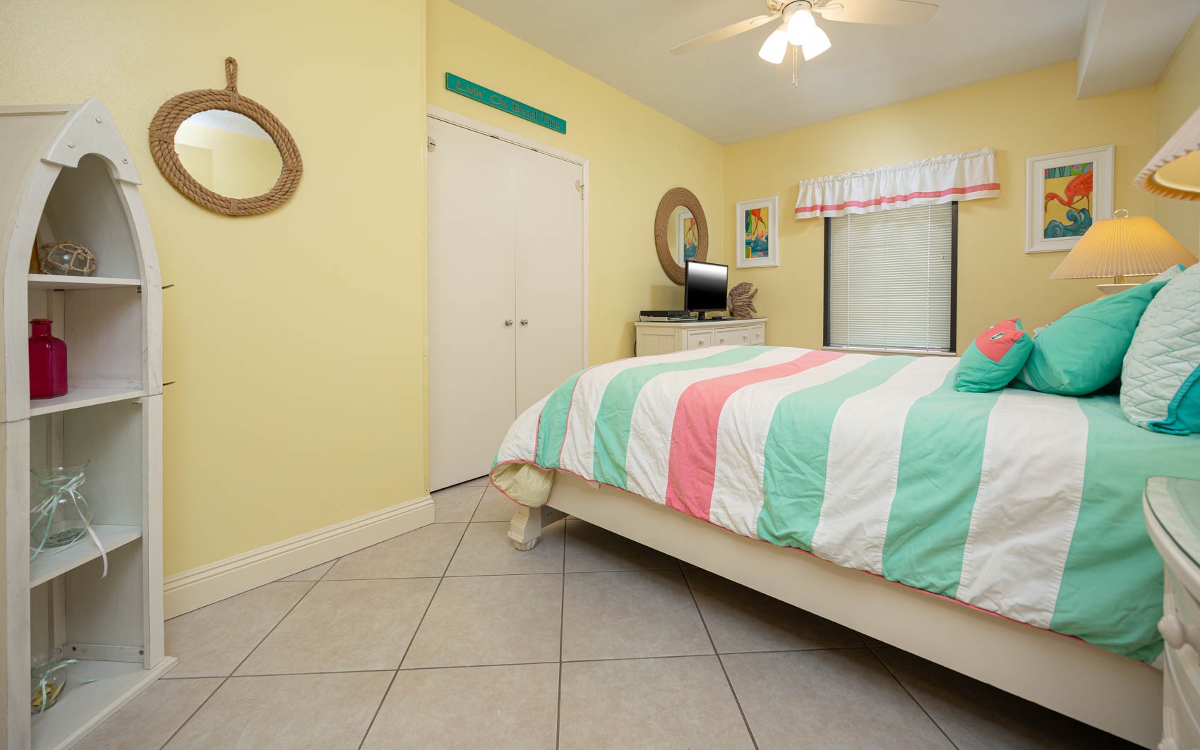 Down the hall a second bedroom offers a queen-size bed with plenty of storage in the dresser, nightstands, and closet, as well as another Samsung HDTV and DVD player. The beach decor continues in this room, as well as in the third bedroom that offers yet another queen-size bed with its own ample storage in its dresser, nightstands, and closet. The second full bathroom off the hallway has been updated with a steel tub/shower combination with tub to ceiling tiled surround.