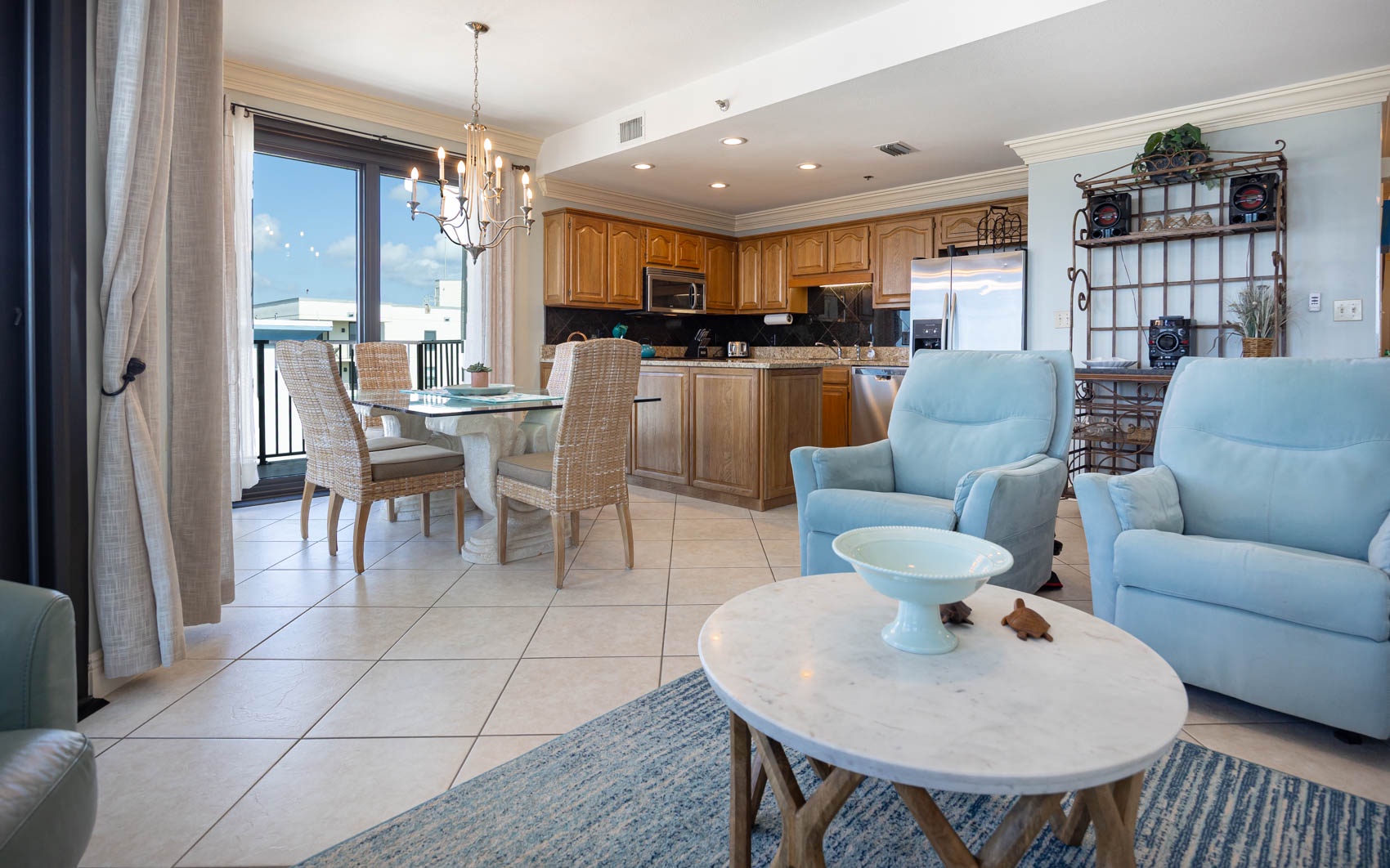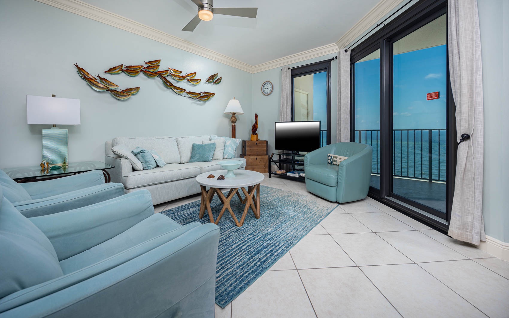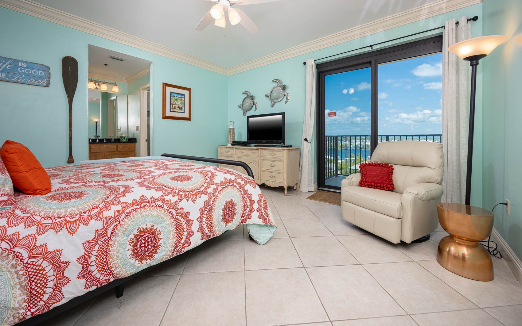 The newly renovated master bedroom offers a king-size bed, Vizio HDTV, DVD player, and stunning beach-themed artwork. Have your morning coffee on the balcony that offers a beautiful view of Cotton Bayou. Inside, cozy up with a book or just relax in the comfy leather recliner. The master bath vanity is separate from the spacious tiled floor to ceiling walk-in shower with glass sliding door. The master walk-in closet will easily handle all your beach getaway items.