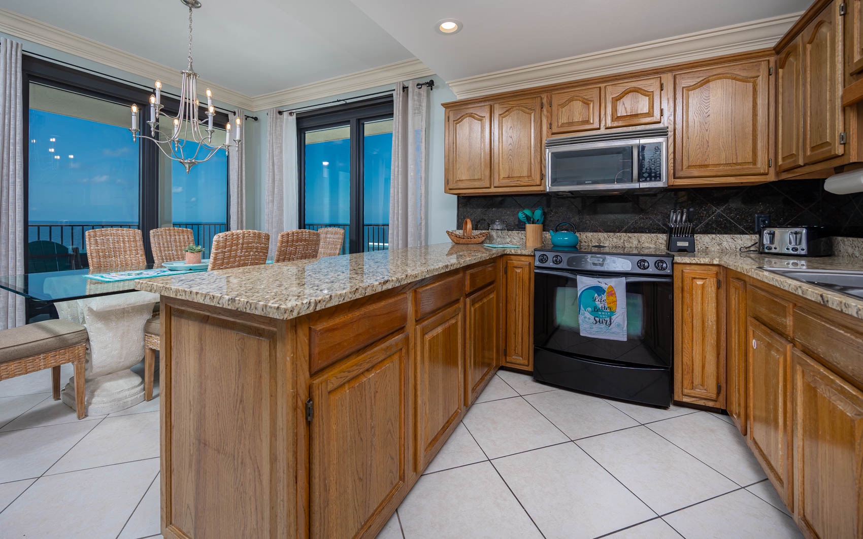 You can continue to enjoy this spectacular view while relaxing in the contemporary living room with its high crown-molded ceilings, ample seating, and Samsung LED HDTV and DVD player. Should you be lured into the updated kitchen equipped with all you need to cook the meal of your choice, you can then seat yourself at the dining room table for six that offers the same fantastic views.