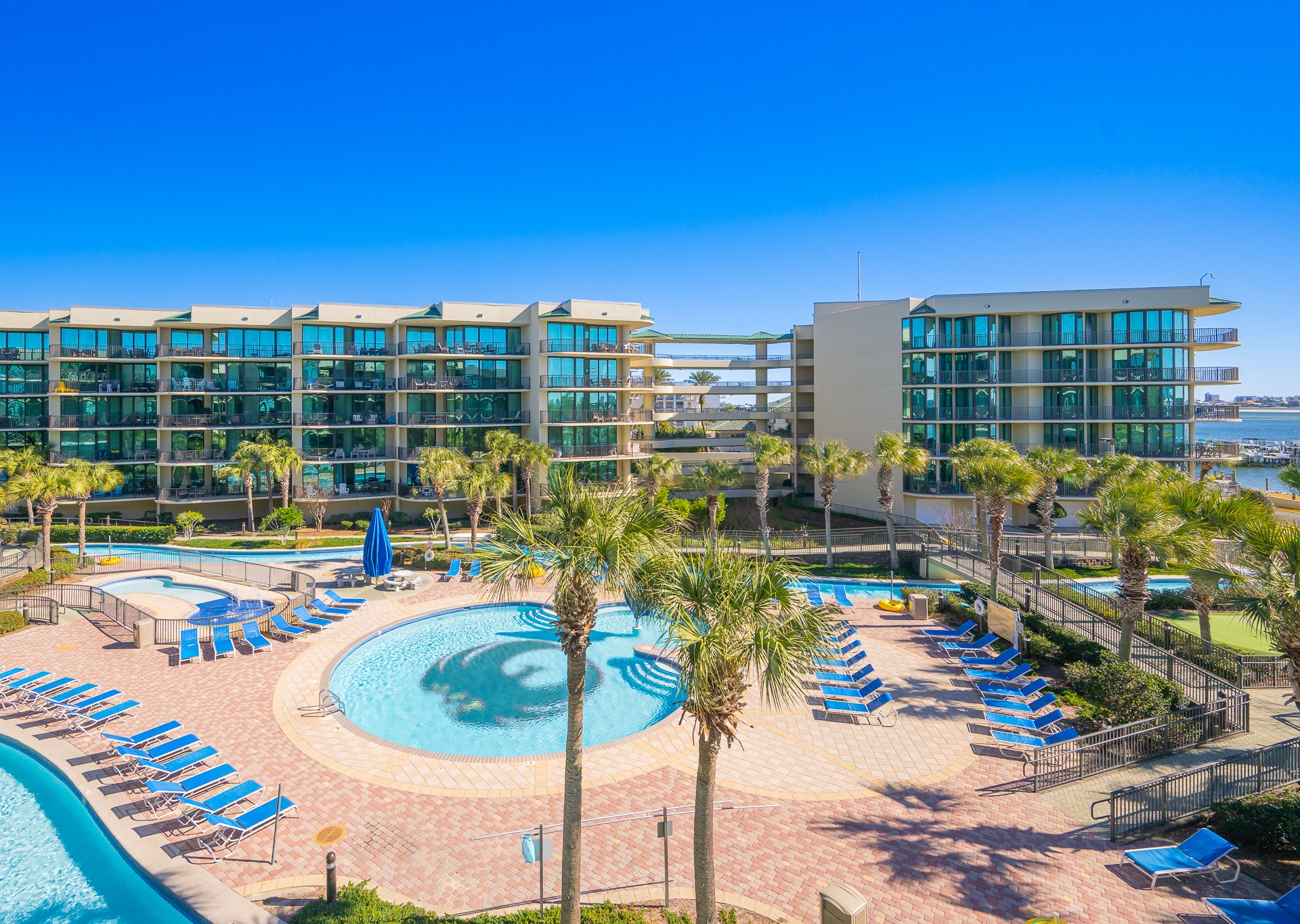 Phoenix on the Bay features several luxury amenities including: indoor and outdoor pools, kiddie pool, lazy river, slide, marina, boat slips, boat launch, sauna, steam room, hot tubs, fitness center, putting green, tennis court, pickleball court, basketball, covered parking, and barbeque grills.