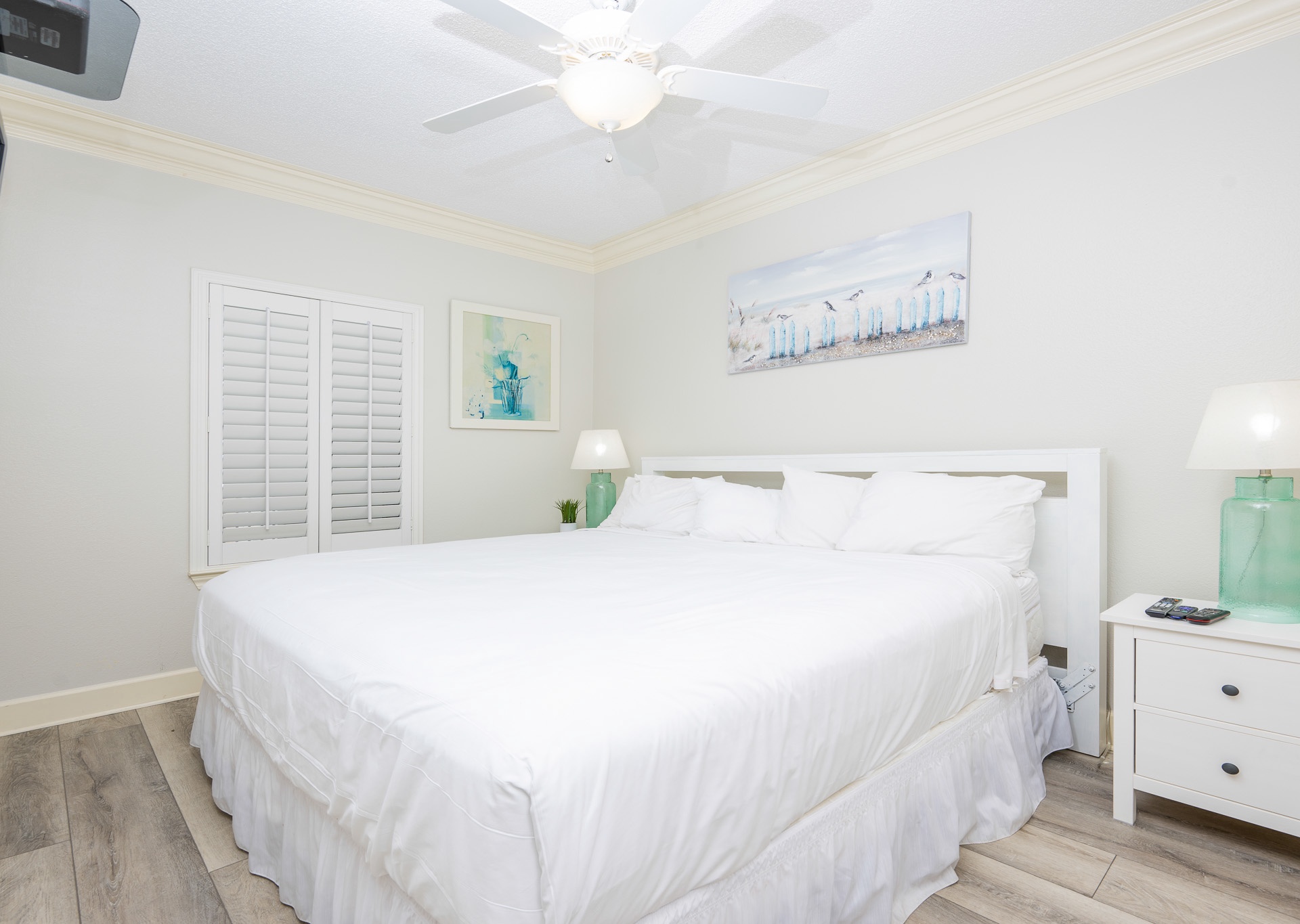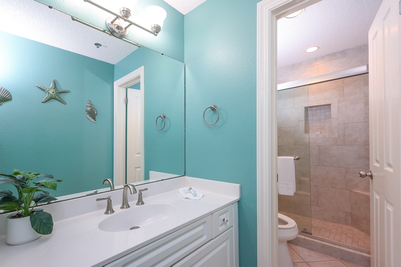The master bedroom also has a gulf view, unlike some 3-bedroom floor plans. It has a king bed with a superior mattress. After a restful night’s sleep, what a view when you first wake up. The master bath also has a new walk-in shower.