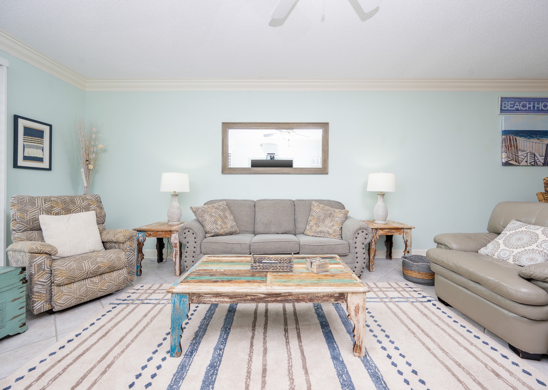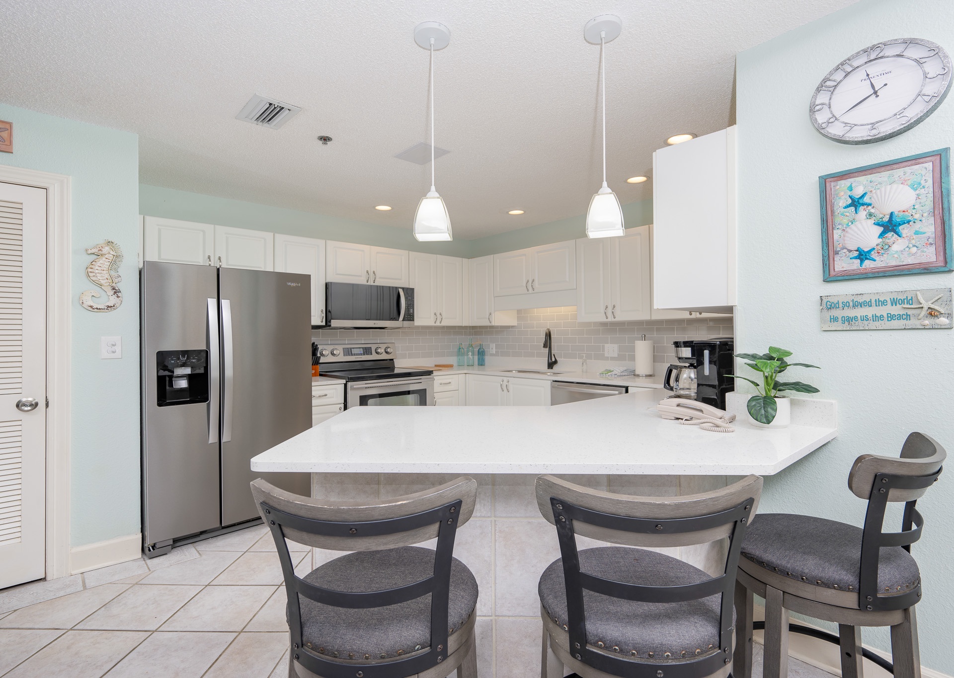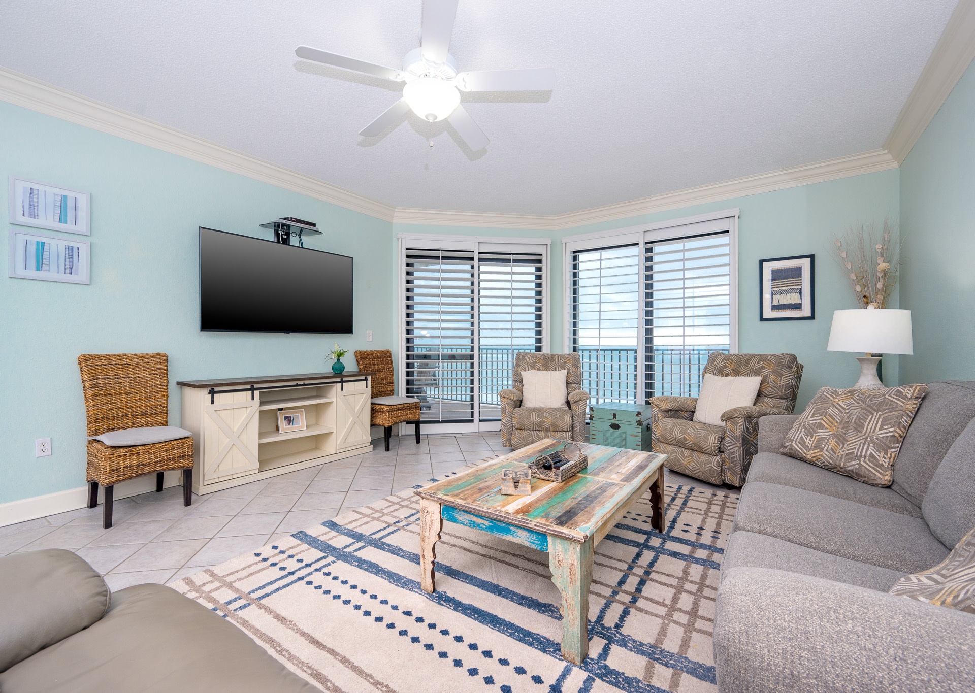 The great room also will not disappoint. The gathering area with nine-foot ceilings, has new premium furniture: a Best Craft pull-out sleeper sofa with excellent support, two Lazy Boy recliners, a comfy, large leather chair, The large wall mounted TV with cable and streaming services has a front mounted audio system. (All four TVs are wall mounted and streaming ready along with 2 DVDs) [And don’t forget the beautiful gulf views right outside. The 11th floor gives an expansive view of the gulf. The deck has new upscale furniture for your outdoor eating or viewing pleasure.