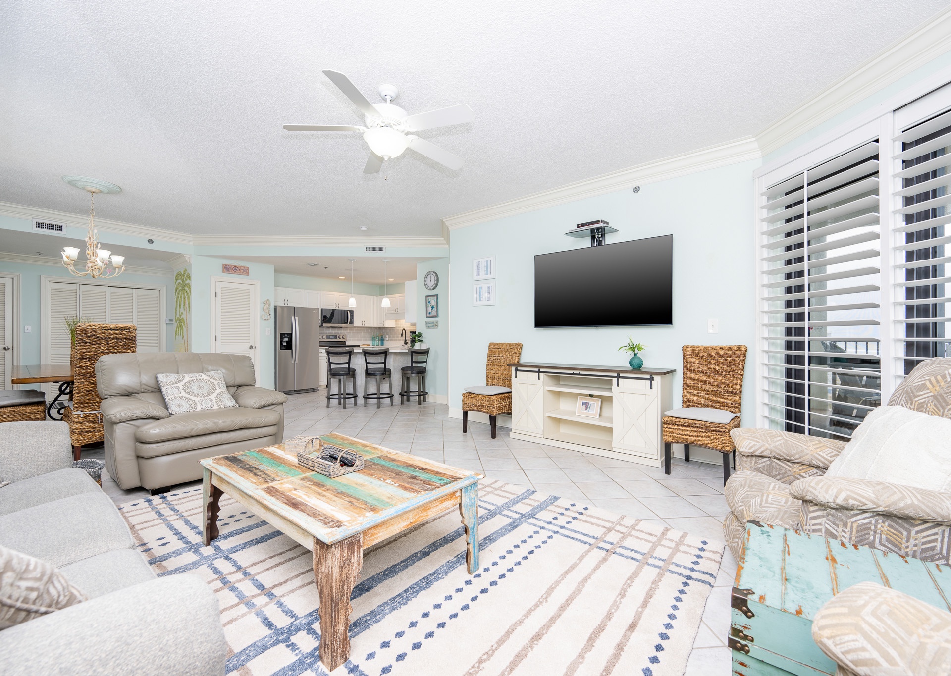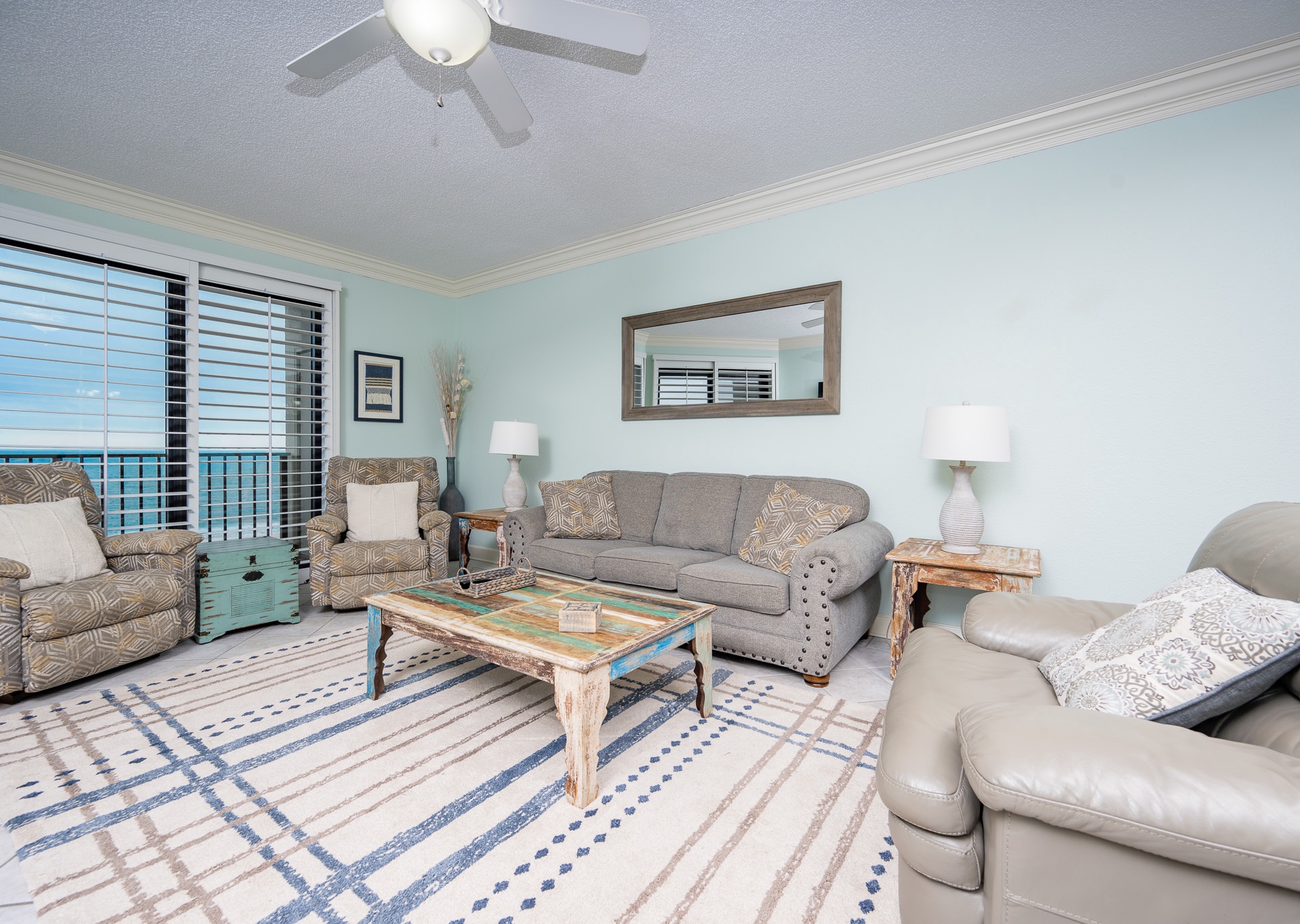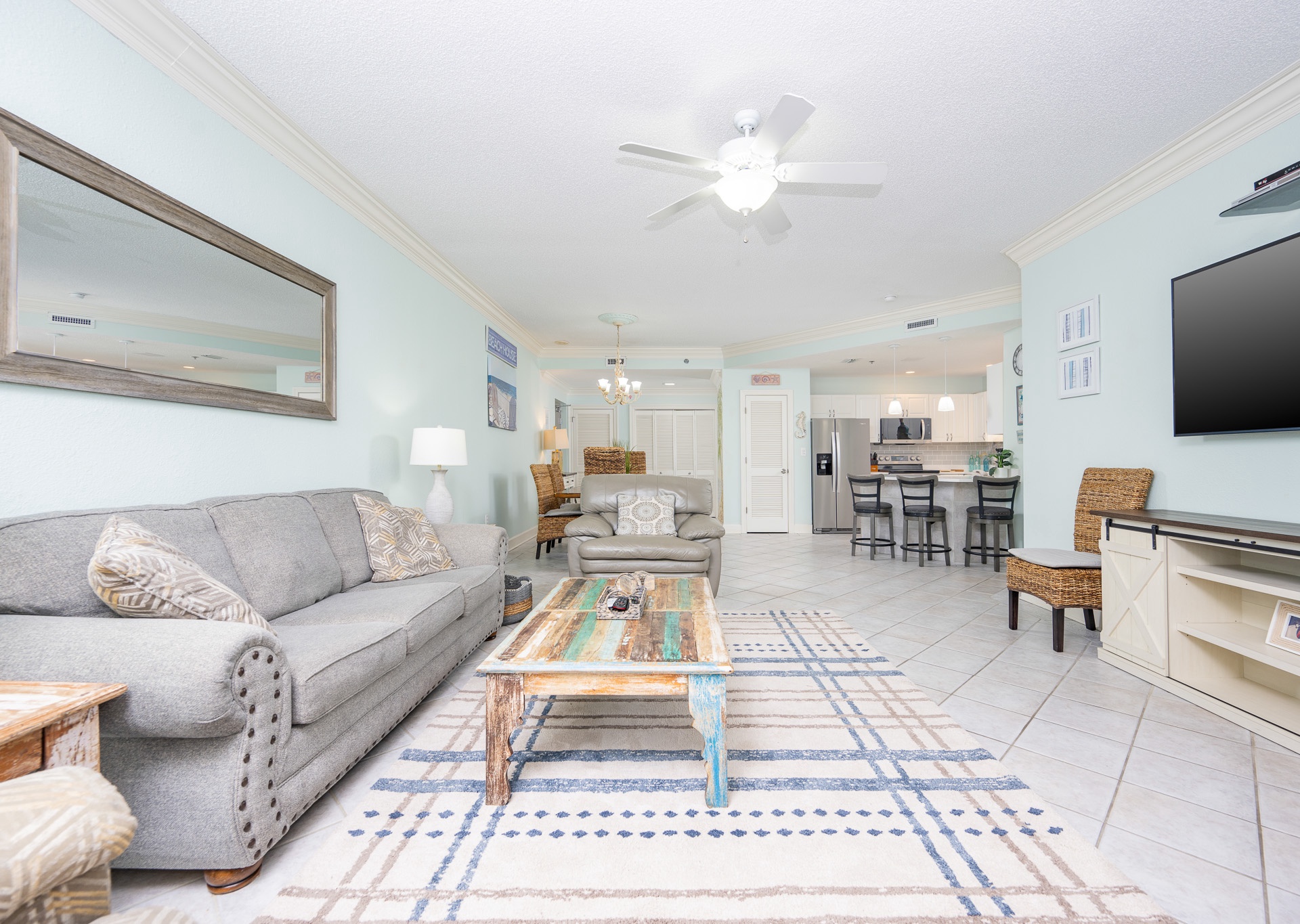 The great room also will not disappoint. The gathering area with nine-foot ceilings, has new premium furniture: a Best Craft pull-out sleeper sofa with excellent support, two Lazy Boy recliners, a comfy, large leather chair, The large wall mounted TV with cable and streaming services has a front mounted audio system. (All four TVs are wall mounted and streaming ready along with 2 DVDs) [And don’t forget the beautiful gulf views right outside. The 11th floor gives an expansive view of the gulf. The deck has new upscale furniture for your outdoor eating or viewing pleasure.