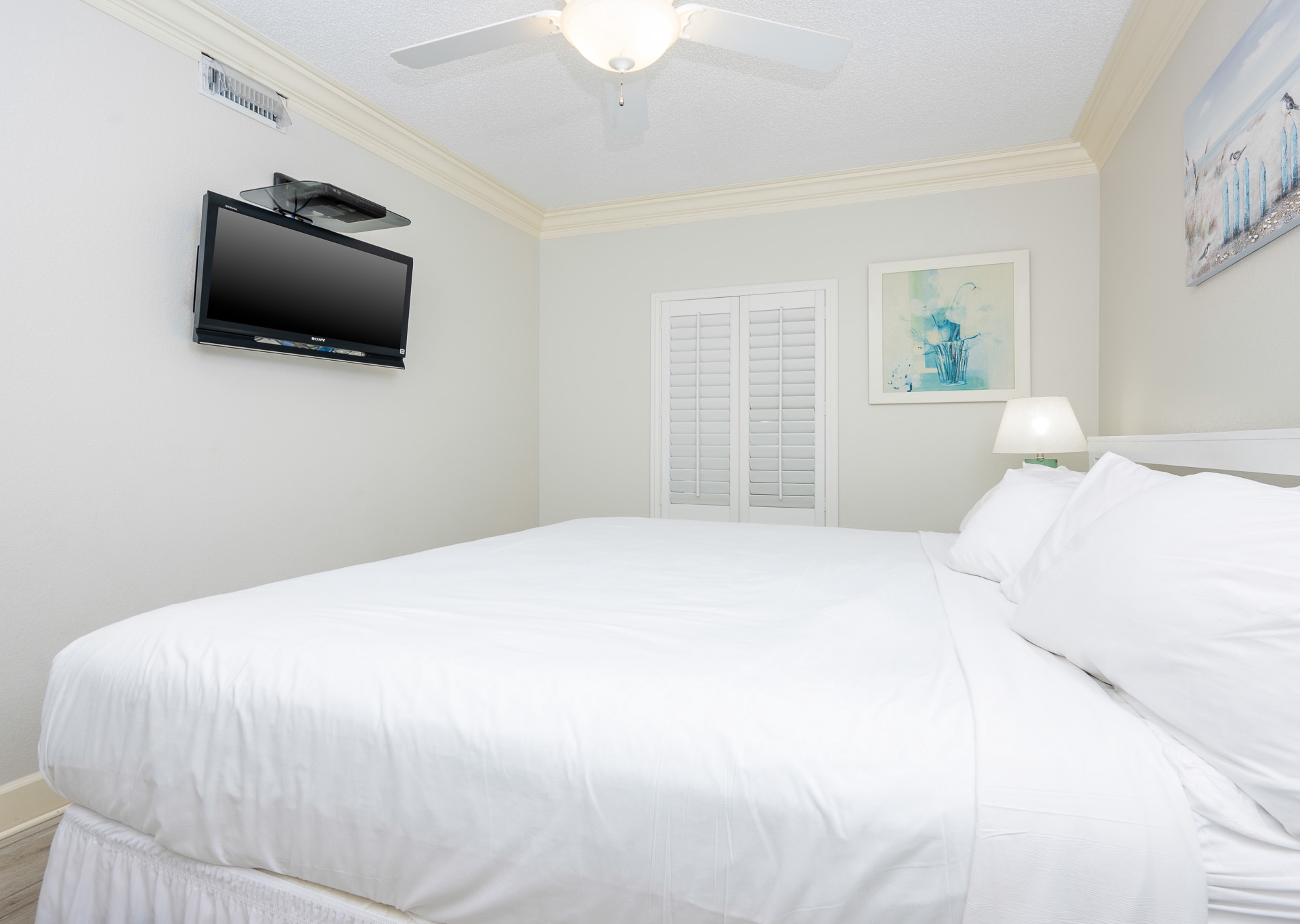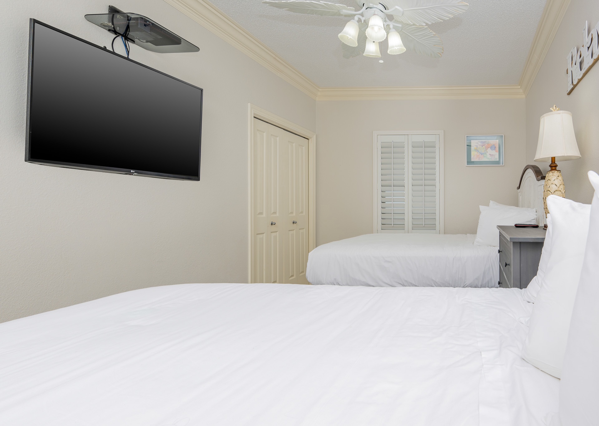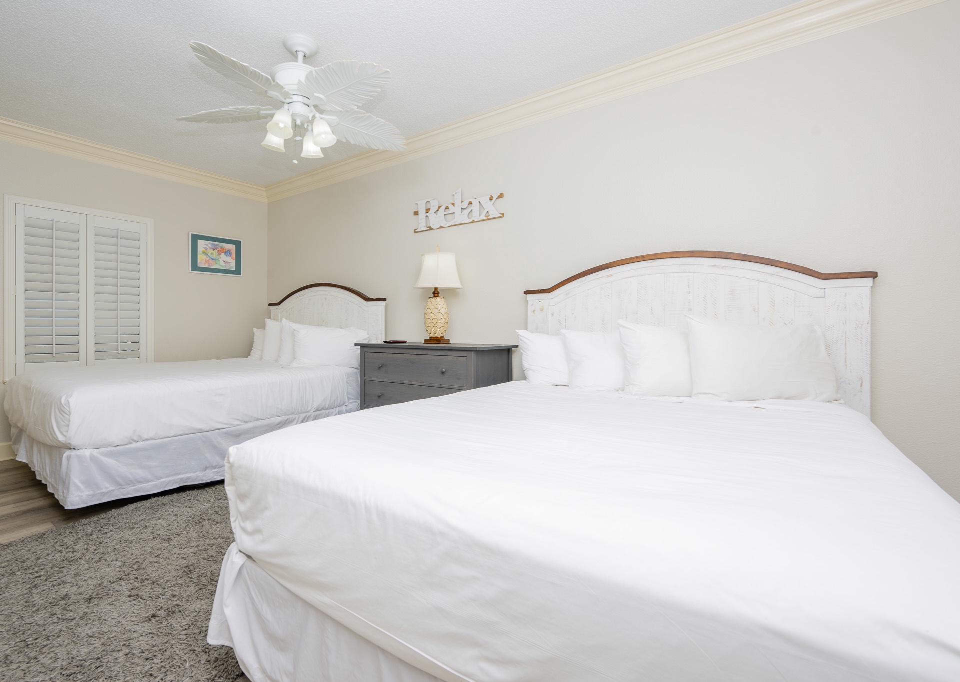 The unit has a laundry closet with full size speed queen washer and dryer. The second bedroom has a full-size new king mattress set and white plantation shutters, as does the whole unit. The third bedroom is quite large and has two double beds, which will sleep four more lucky vacationers. There is a large renovated second bathroom. These bedrooms and bath were professionally painted recently. The whole unit has been painted within the last three years and has taller ceilings than the bottom ten floors, giving you a feeling of spaciousness throughout.