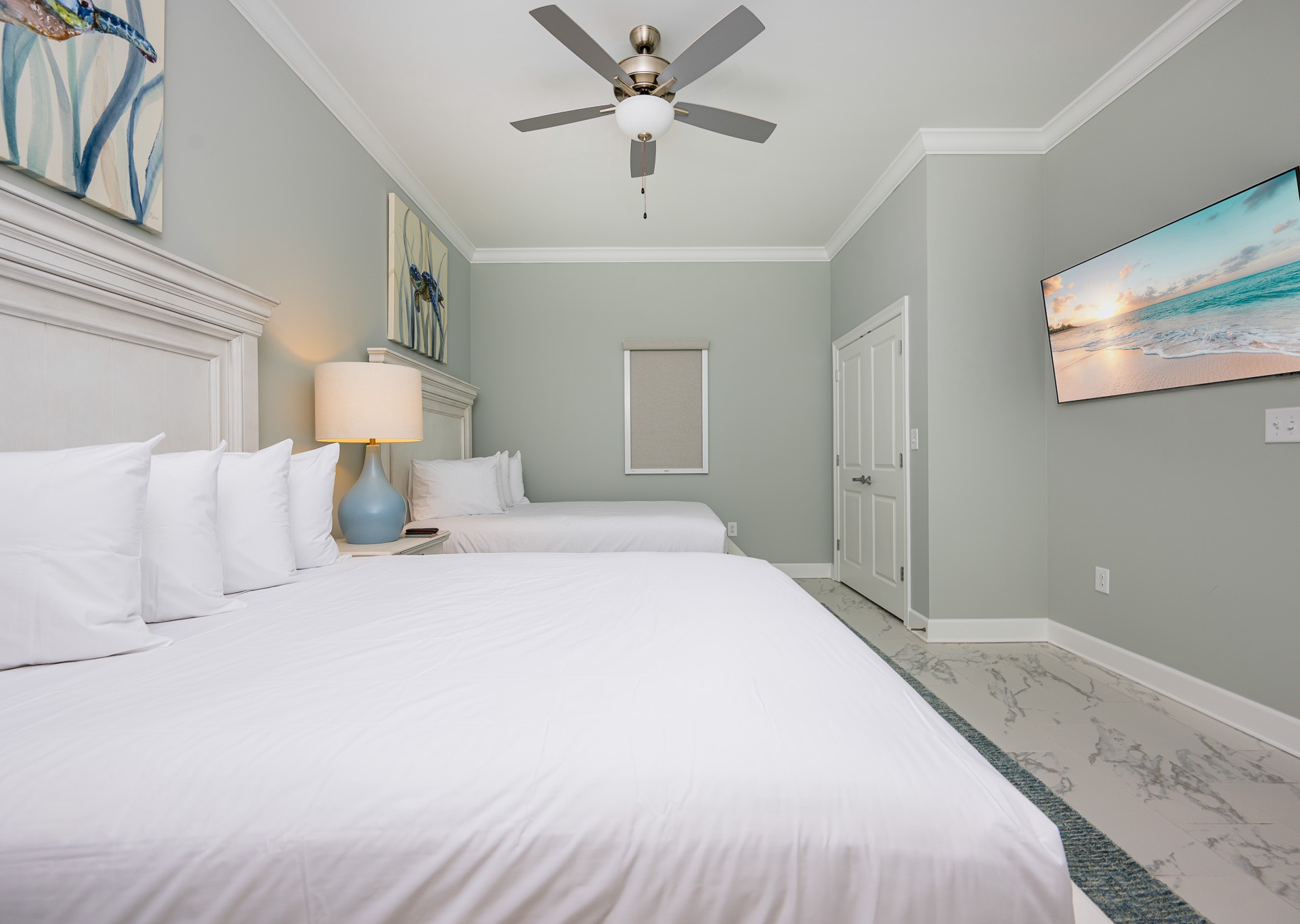 The master bedroom features a luxurious king bed, private balcony access, and floor-to-ceiling windows offering breathtaking views. Both the second and third bedrooms include two queen beds, and the living room is equipped with a queen sleeper sofa, offering plenty of space for everyone.
