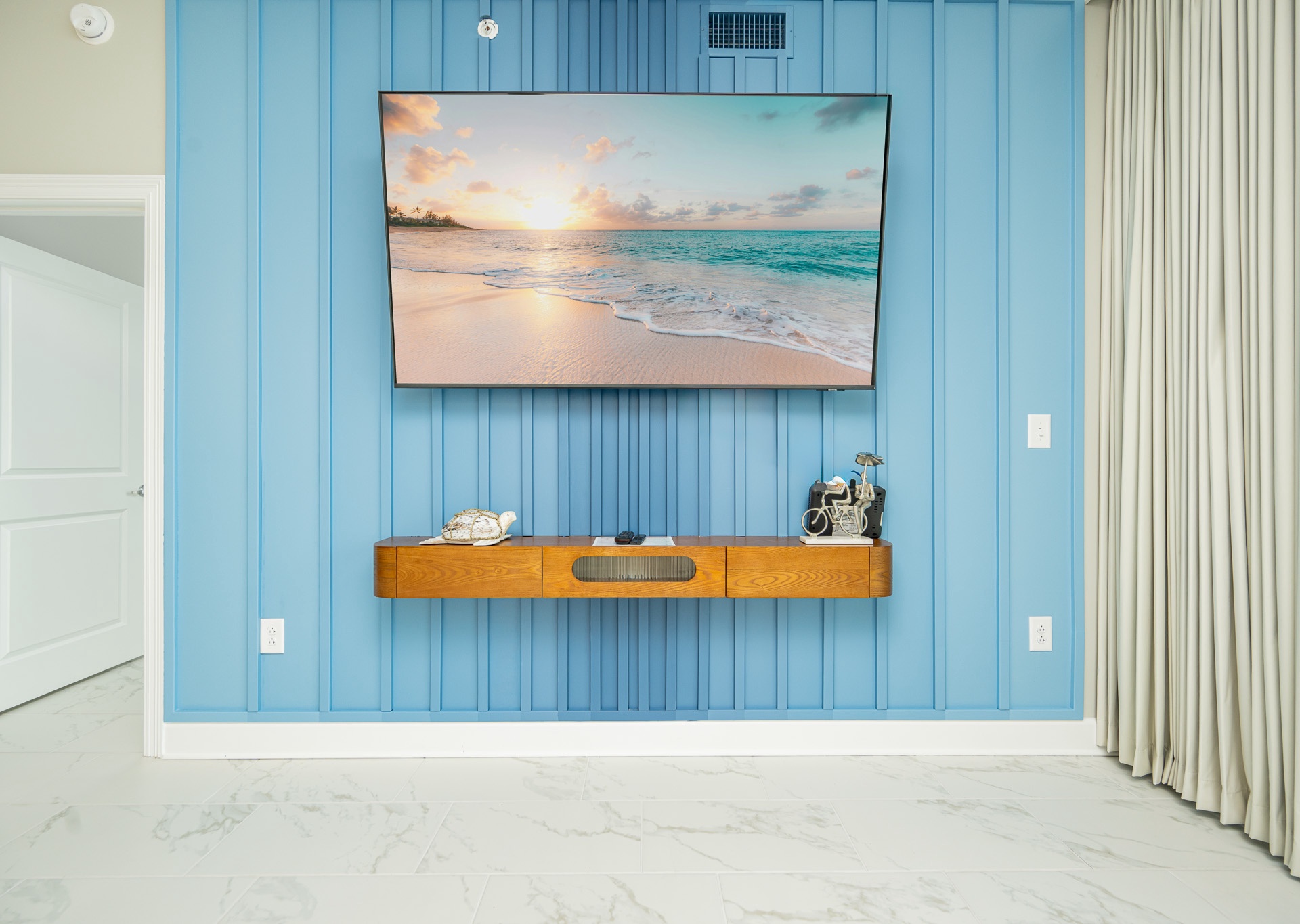 The master suite is a peaceful sanctuary with its own balcony access, an accent wall, flat-screen TV, swivel chair, and blackout drapes. The master bathroom includes a double vanity, Jacuzzi tub, walk-in shower, and a custom closet.