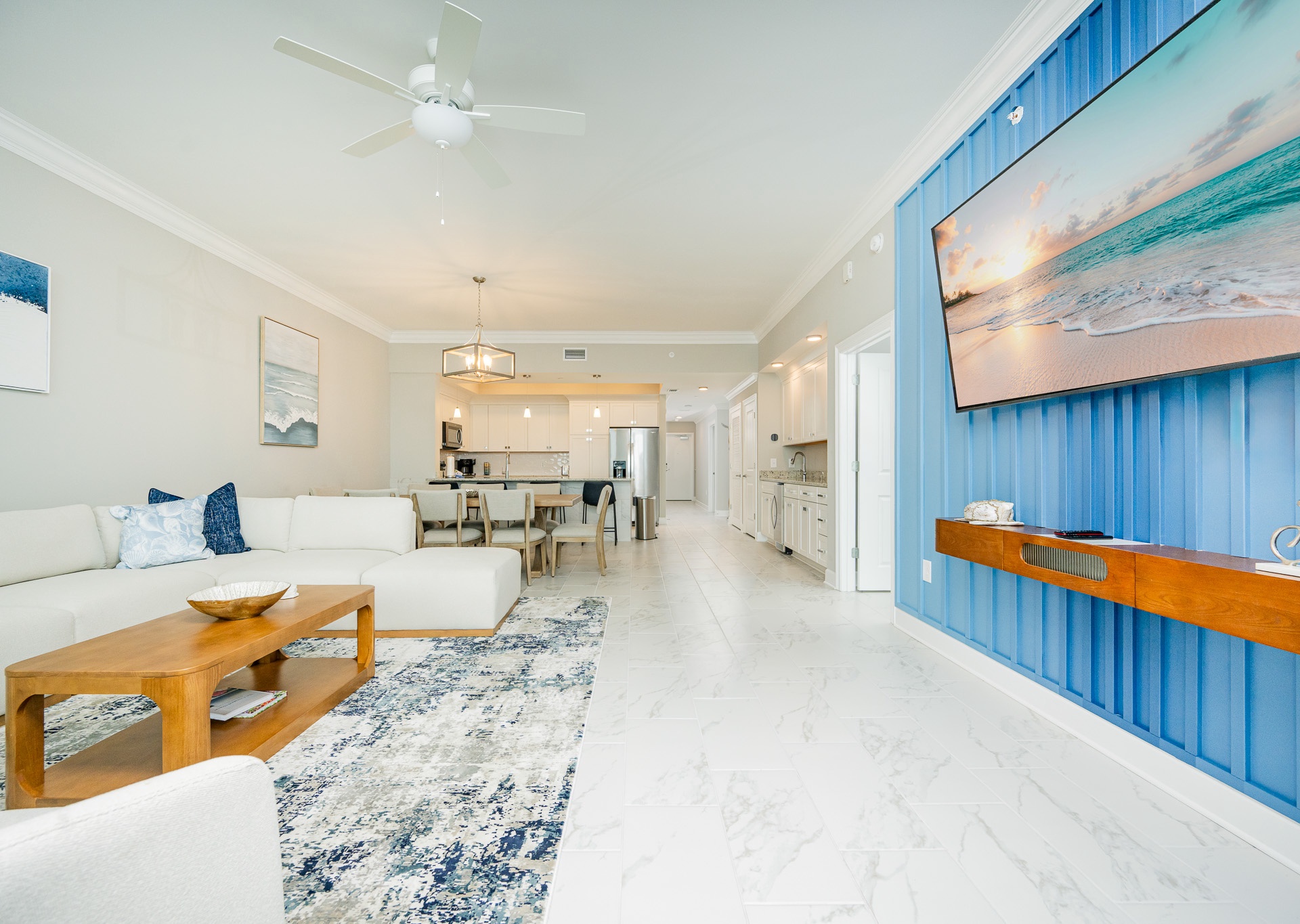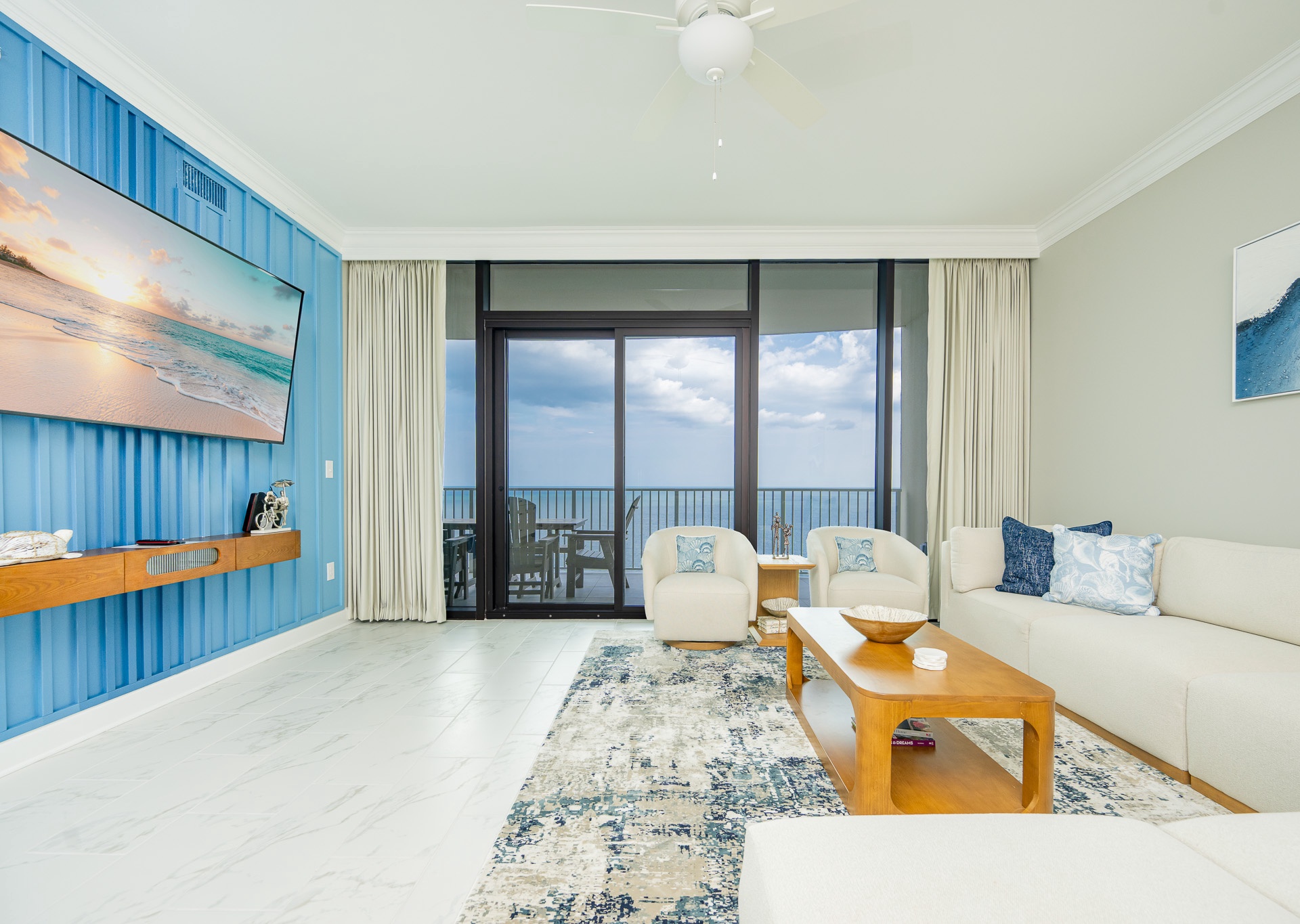 The open-concept living area features floor-to-ceiling windows that showcase breathtaking views of the Gulf. A large plush sectional sofa and two swivel chairs create a cozy gathering spot around a mounted flat-screen TV and chic accent wall. Step onto the expansive private balcony and relax on the premium POLYWOOD patio furniture while taking in those sugar-white sands and emerald waters.