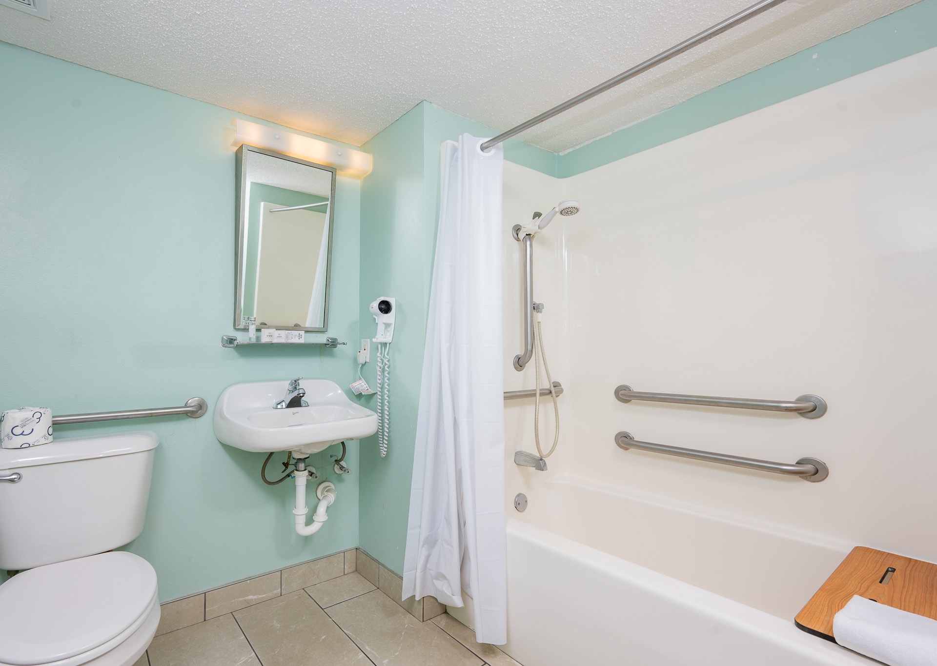 Our handicap accessible bathroom, is designed to provide ease of use and safety for individuals with mobility challenges or disabilities. Some common features of our handicap accessible bathroom may include: Grab Bars, Roll-in Shower, Shower Seat, Lowered Countertops and Sinks, Lever Handles, Wider Doorways, Handheld Showerhead, Accessible Toilet, Adequate Clear Floor Space. Phoenix All Suites aims to make your stay comfortable and hassle-free.