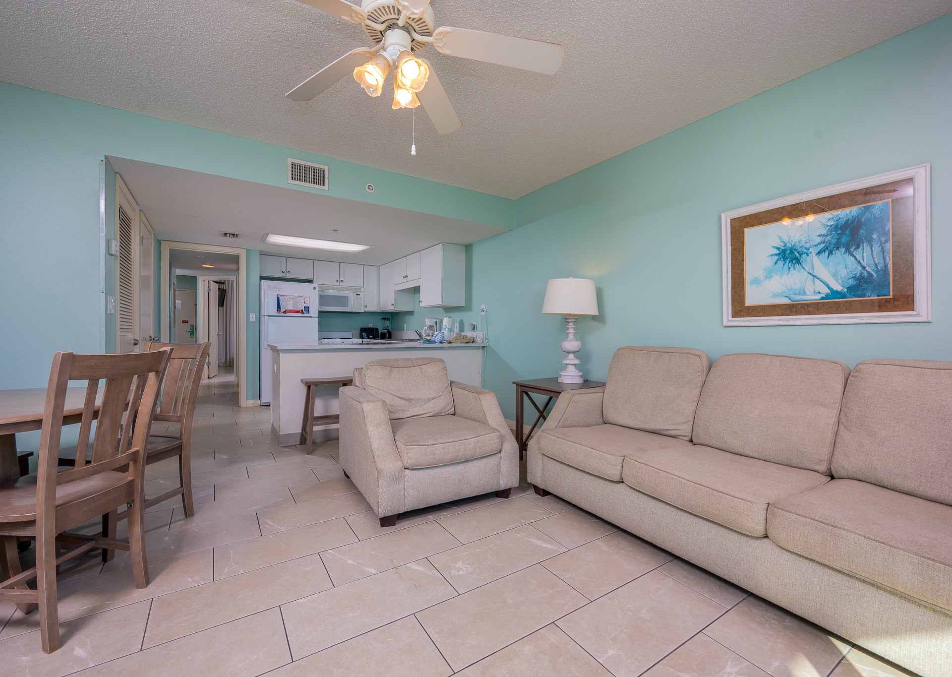 The suite features a full-size kitchen, fully equipped for your cooking needs, and a separate living room to relax after a day of fun in the sun. The private bedroom includes a cozy king-size bed with an en-suite bathroom, while the hallway features built-in bunk beds perfect for small children. An additional half bath adds extra convenience for your stay.