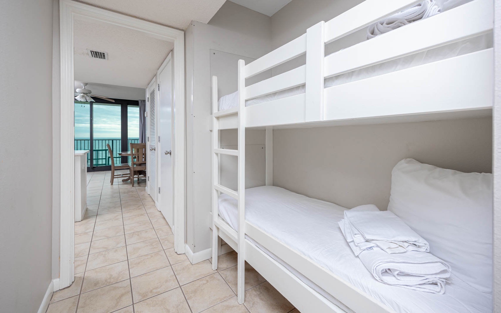 Phoenix All Suites West, situated on the pristine shores of Gulf Shores, Alabama, offers a comfortable and well-appointed one-and-a-half bath hotel suite that sleeps up to six guests. The suite features a spacious king-sized bed in the bedroom, a convenient queen sofa sleeper in the living area, and charming built-in bunk beds in the hallway, perfect for accommodating families or small groups.