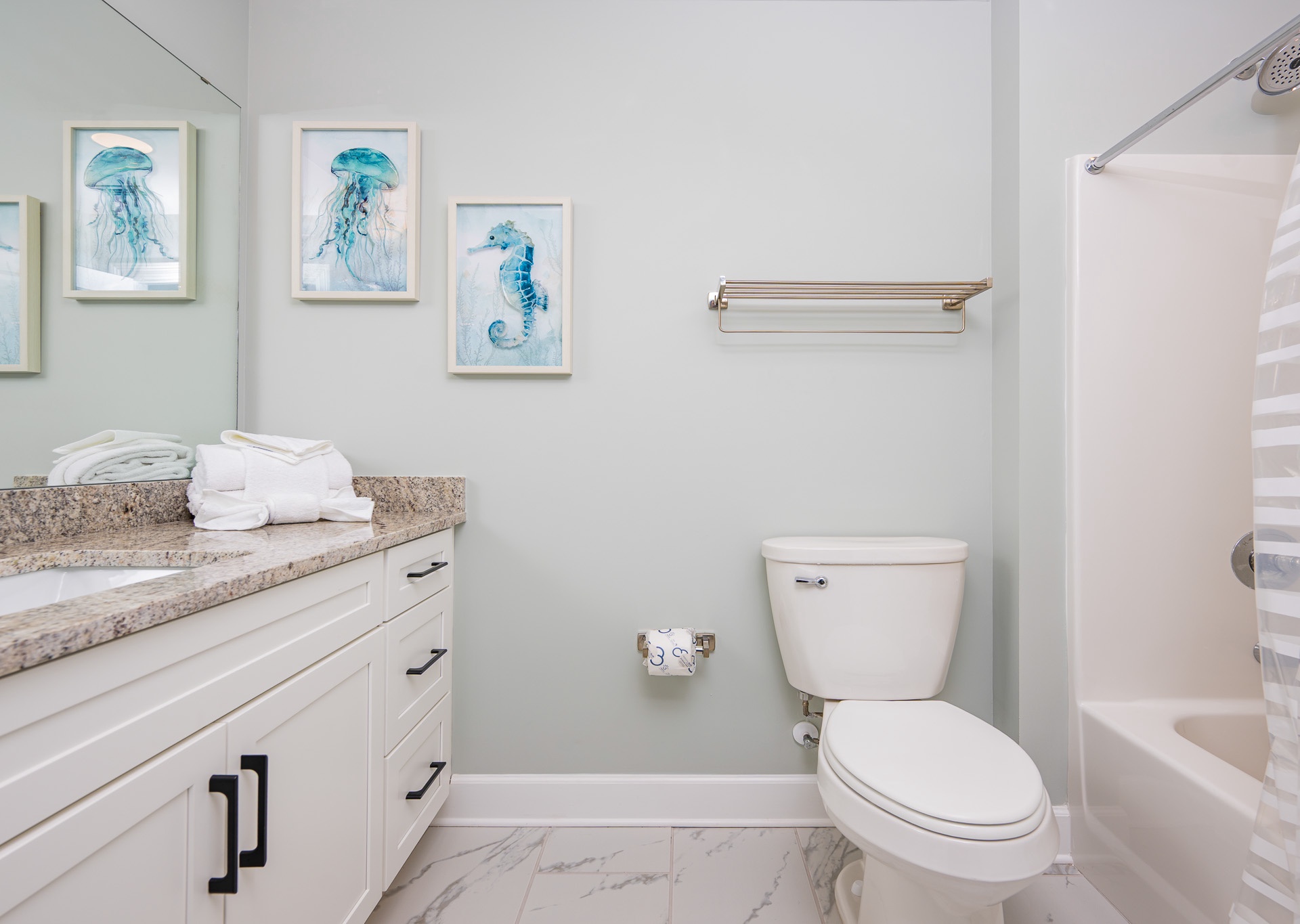• The first bathroom offers a single vanity with a tub/shower combination