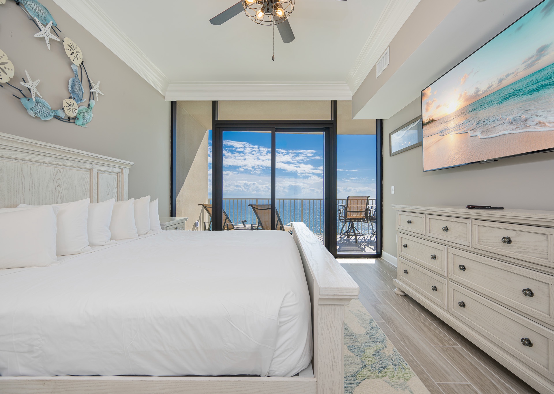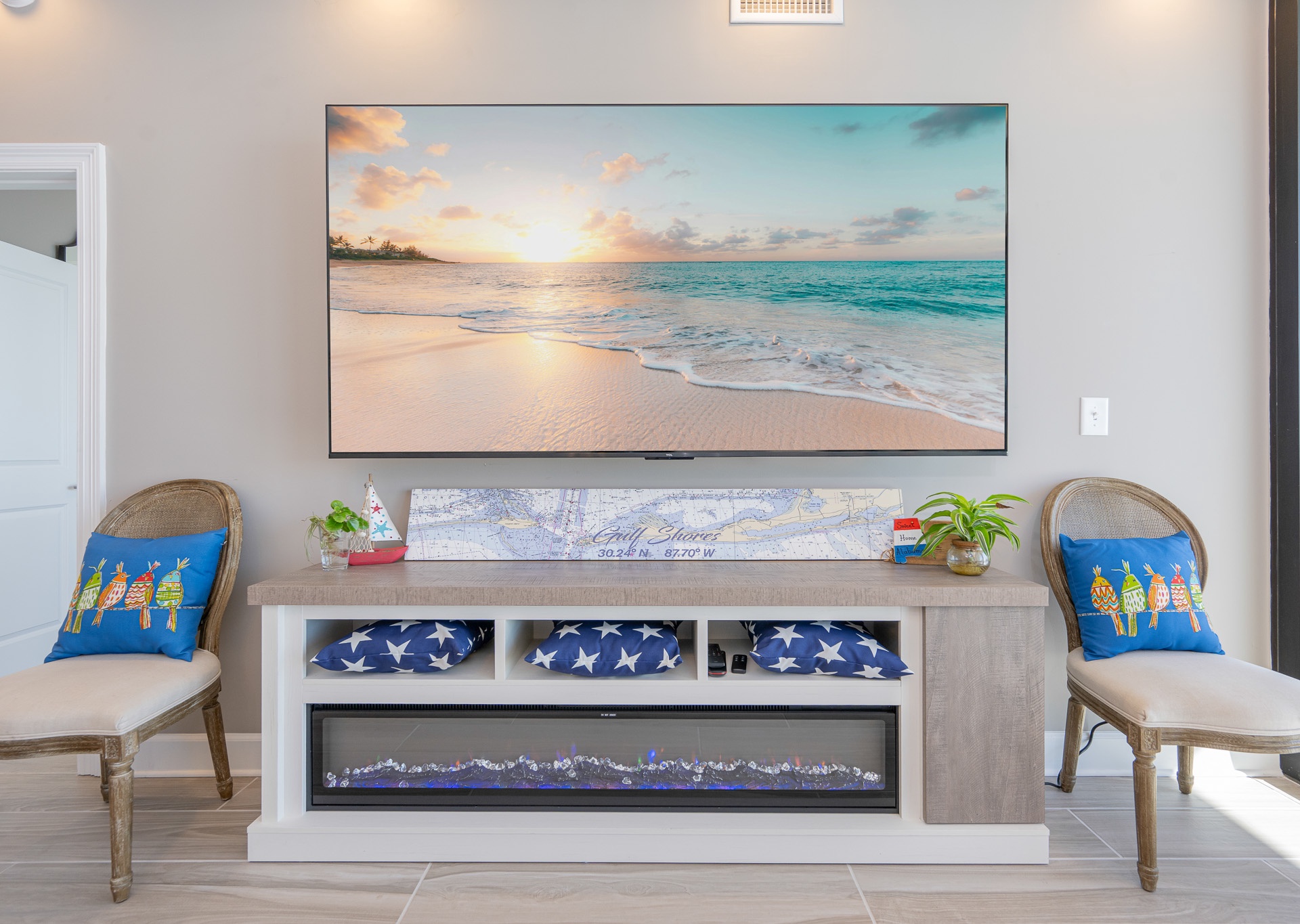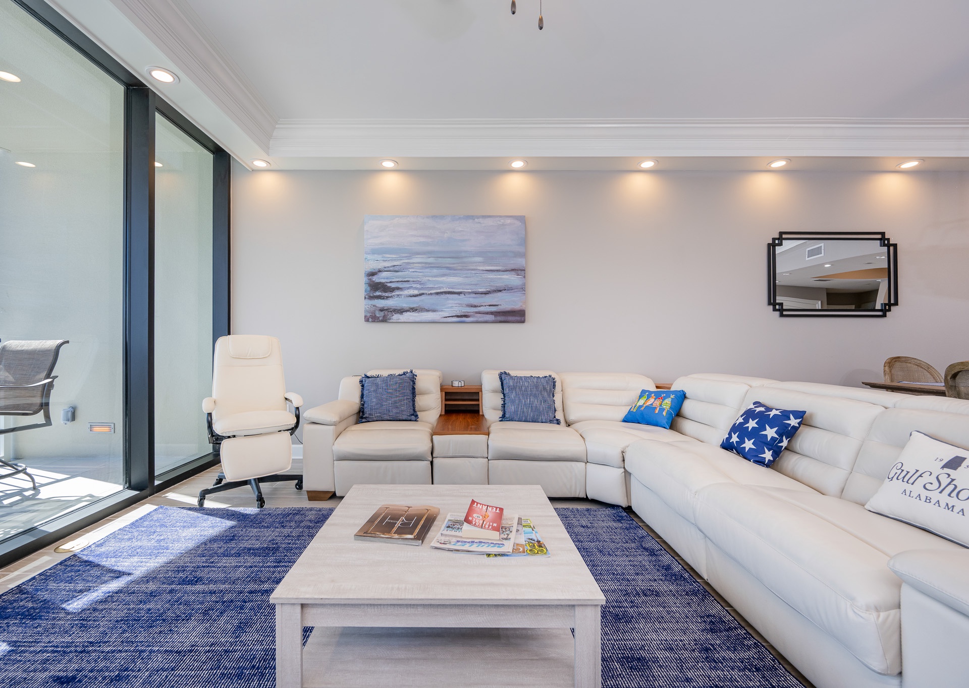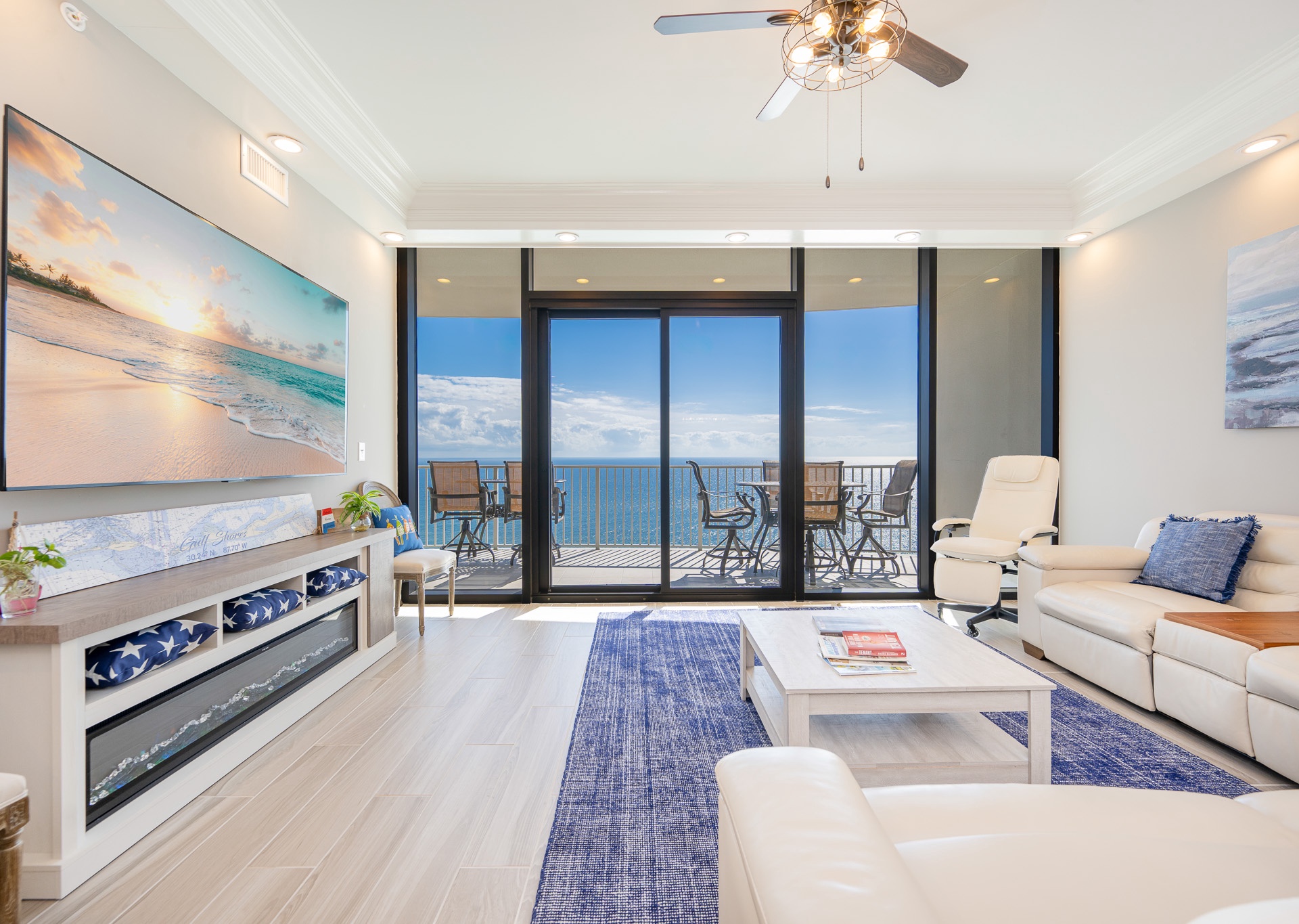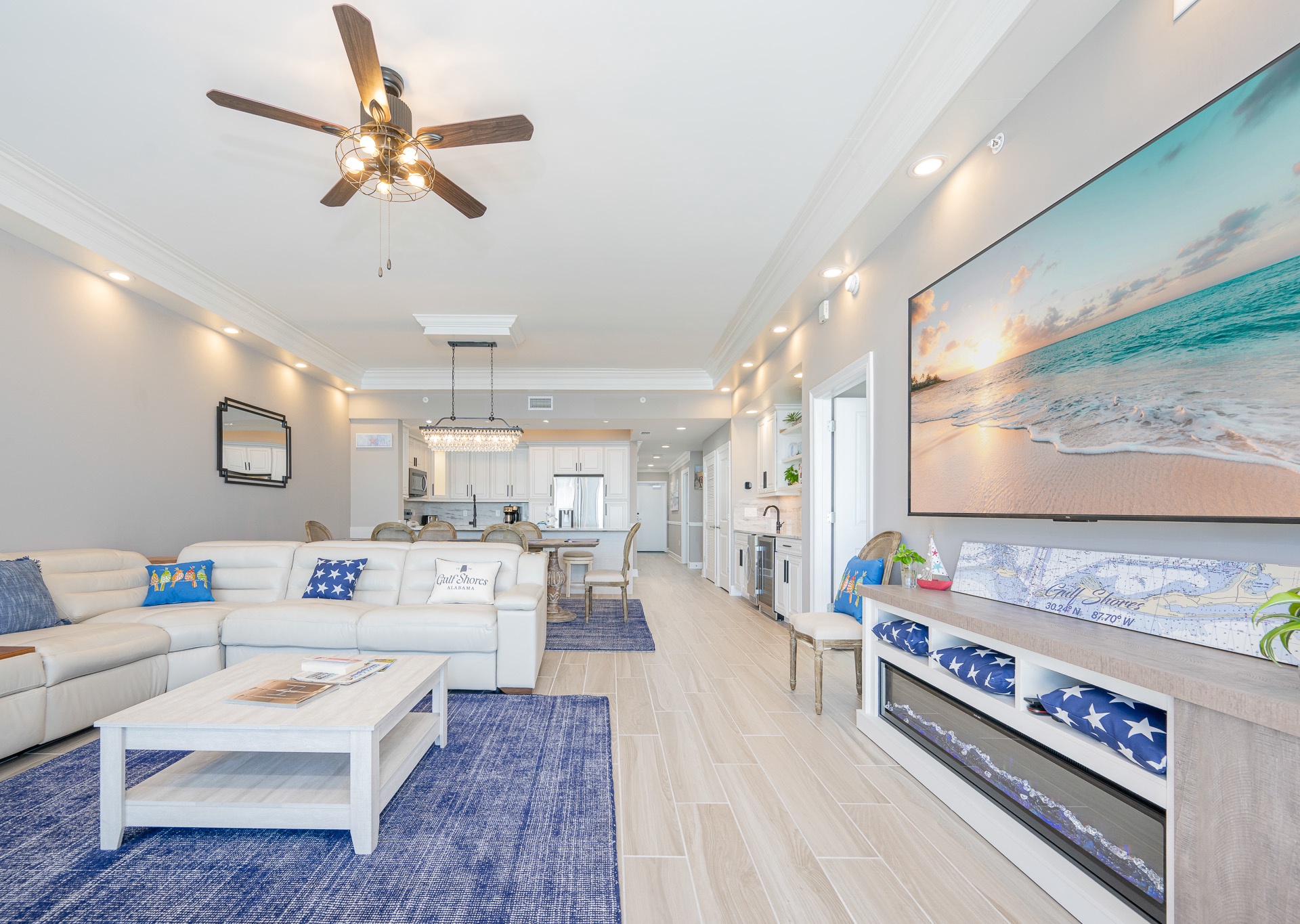 As you step inside, you’re greeted by floor-to-ceiling windows that fill the living area with natural light and showcase the sparkling turquoise waters of the Gulf. The living room features a large sectional sofa with built-in recliners, a flat-screen TV, and a cozy electric fireplace, creating a perfect gathering space to relax after a fun day at the beach.