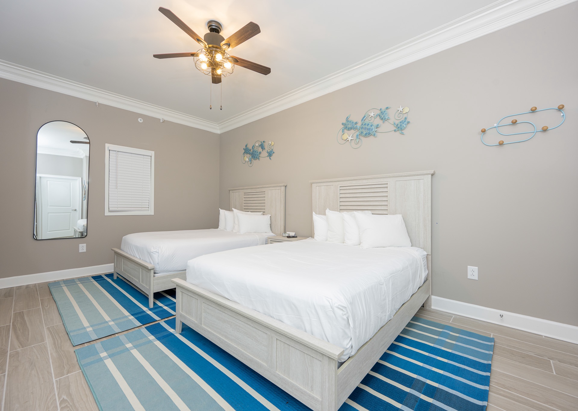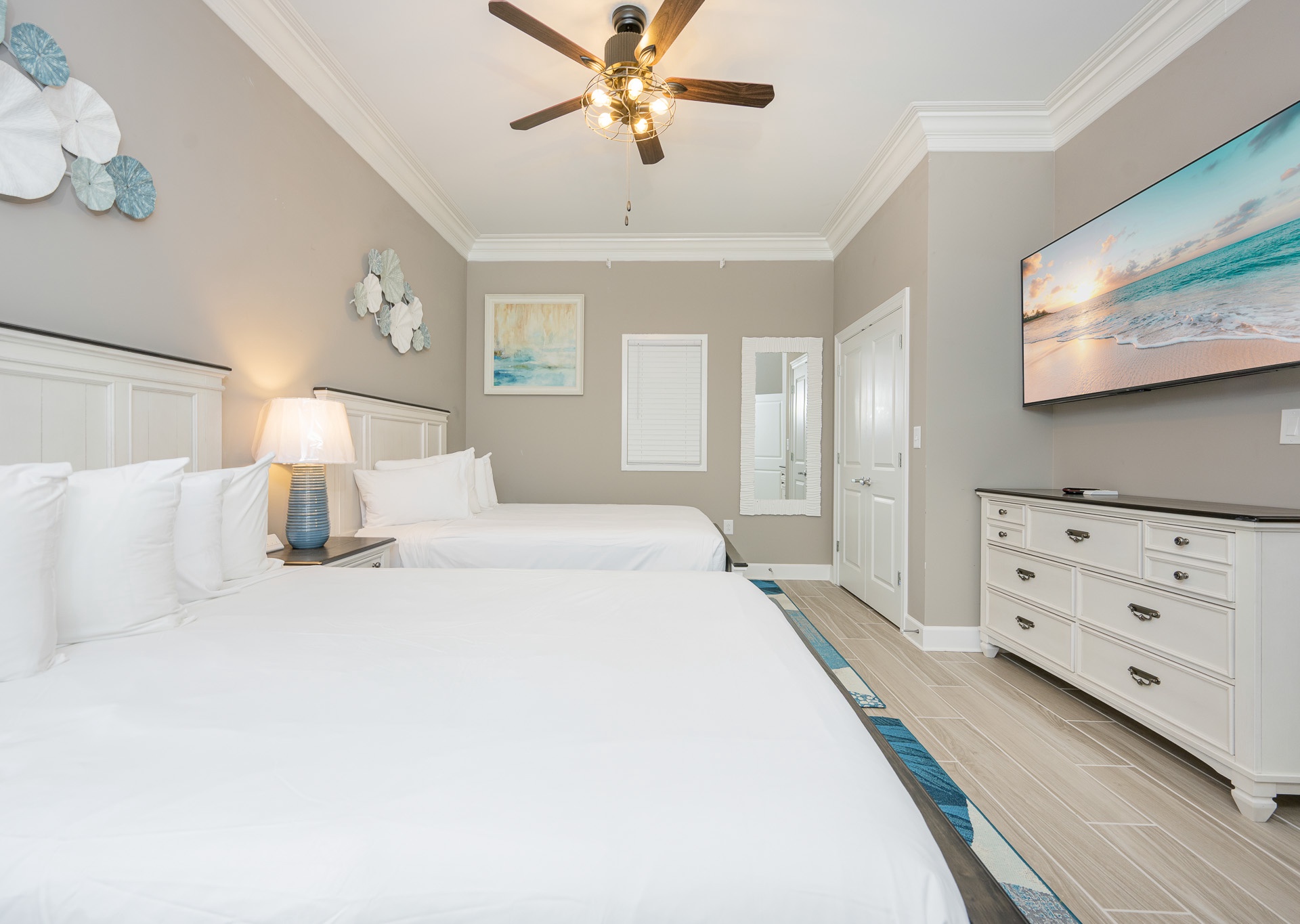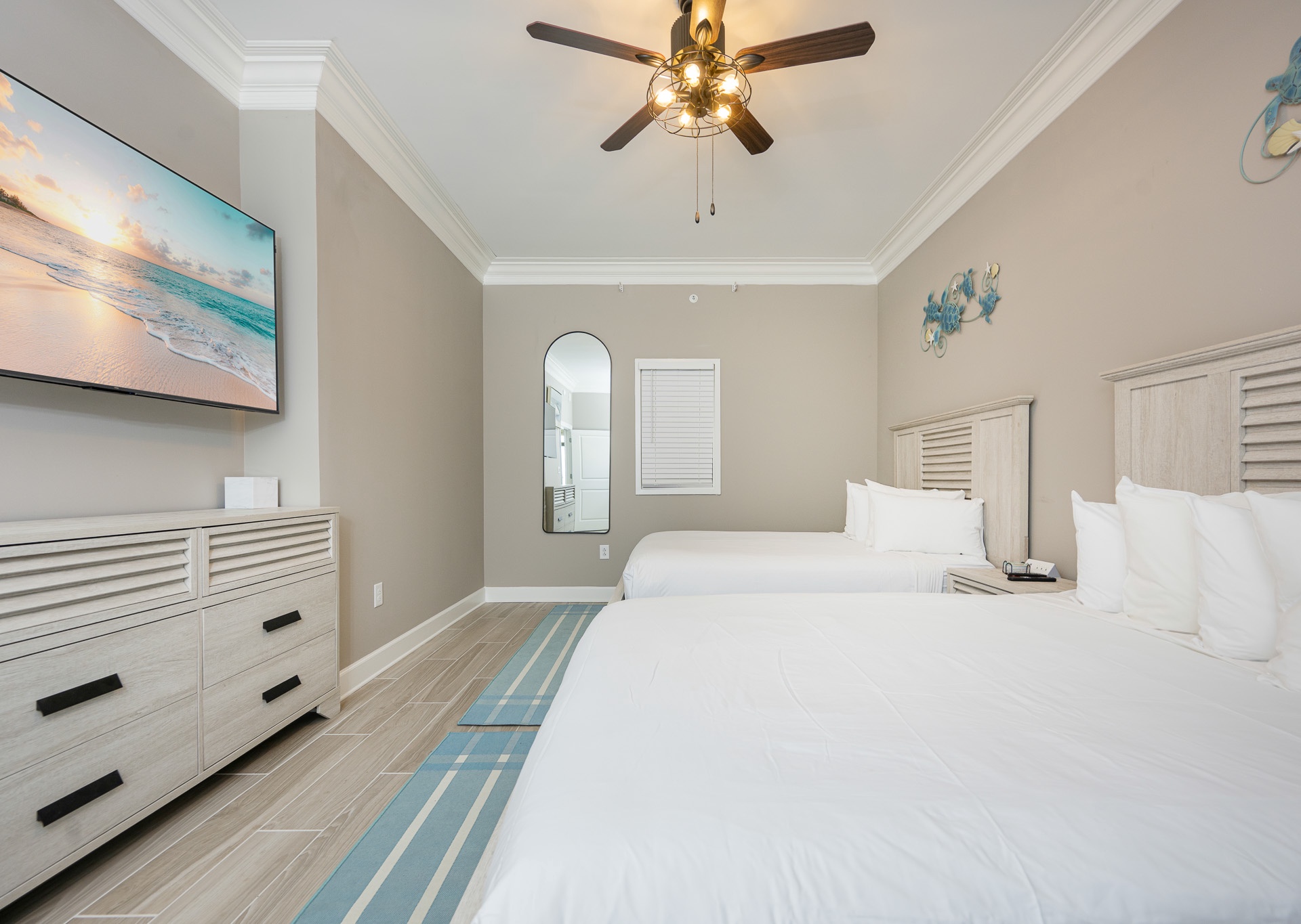 The primary bedroom suite offers private balcony access, a flat-screen TV, ceiling fan, and a luxurious en suite bath with double vanities, a soaking tub, and a glass walk-in shower with a handheld showerhead. Both the second and third bedrooms each feature two queen beds, flat-screen TVs, and ceiling fans, ensuring every guest enjoys their own comfortable retreat.