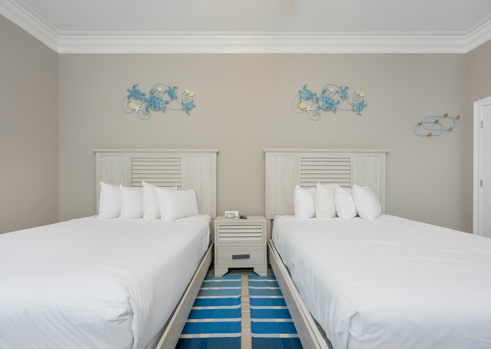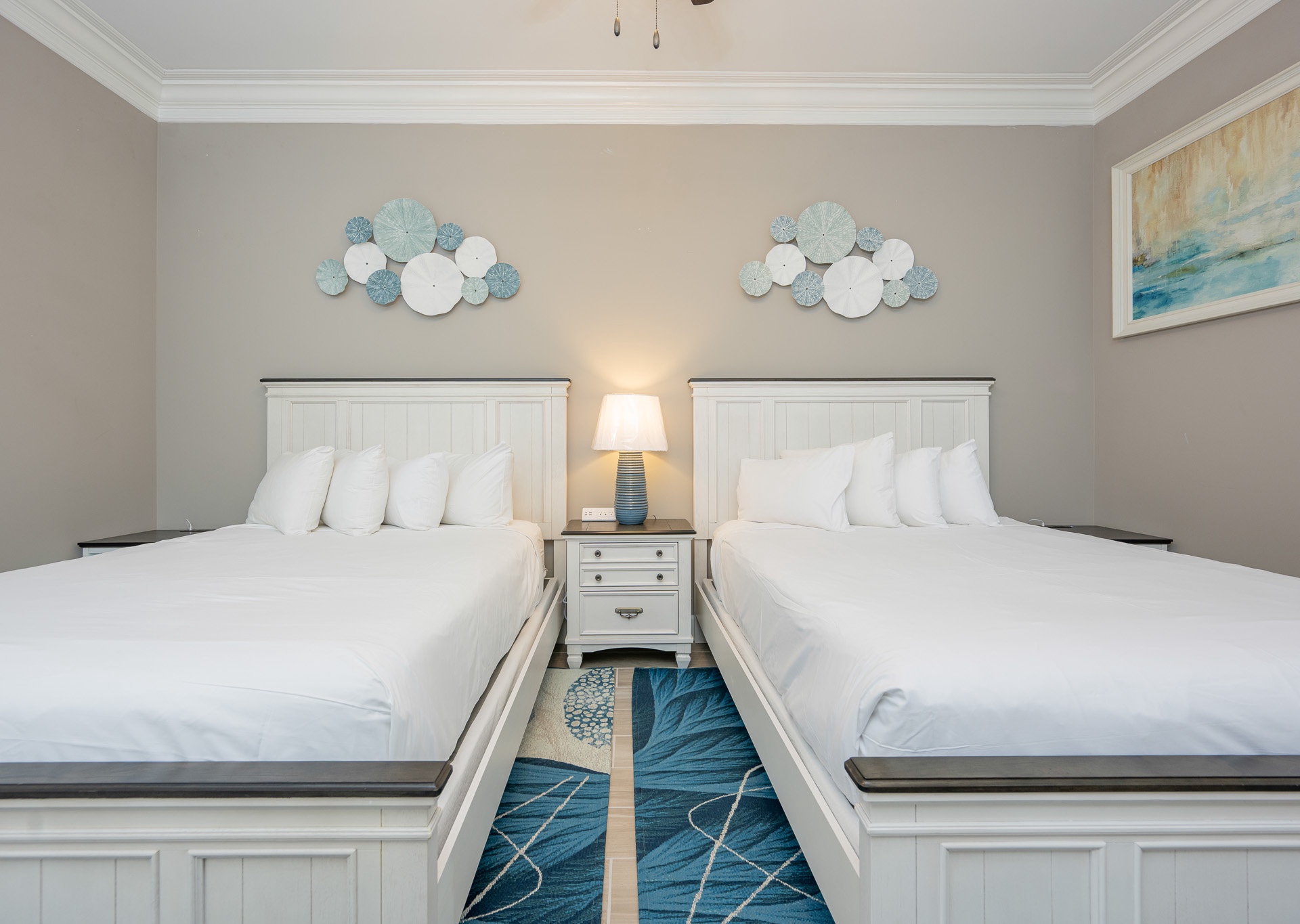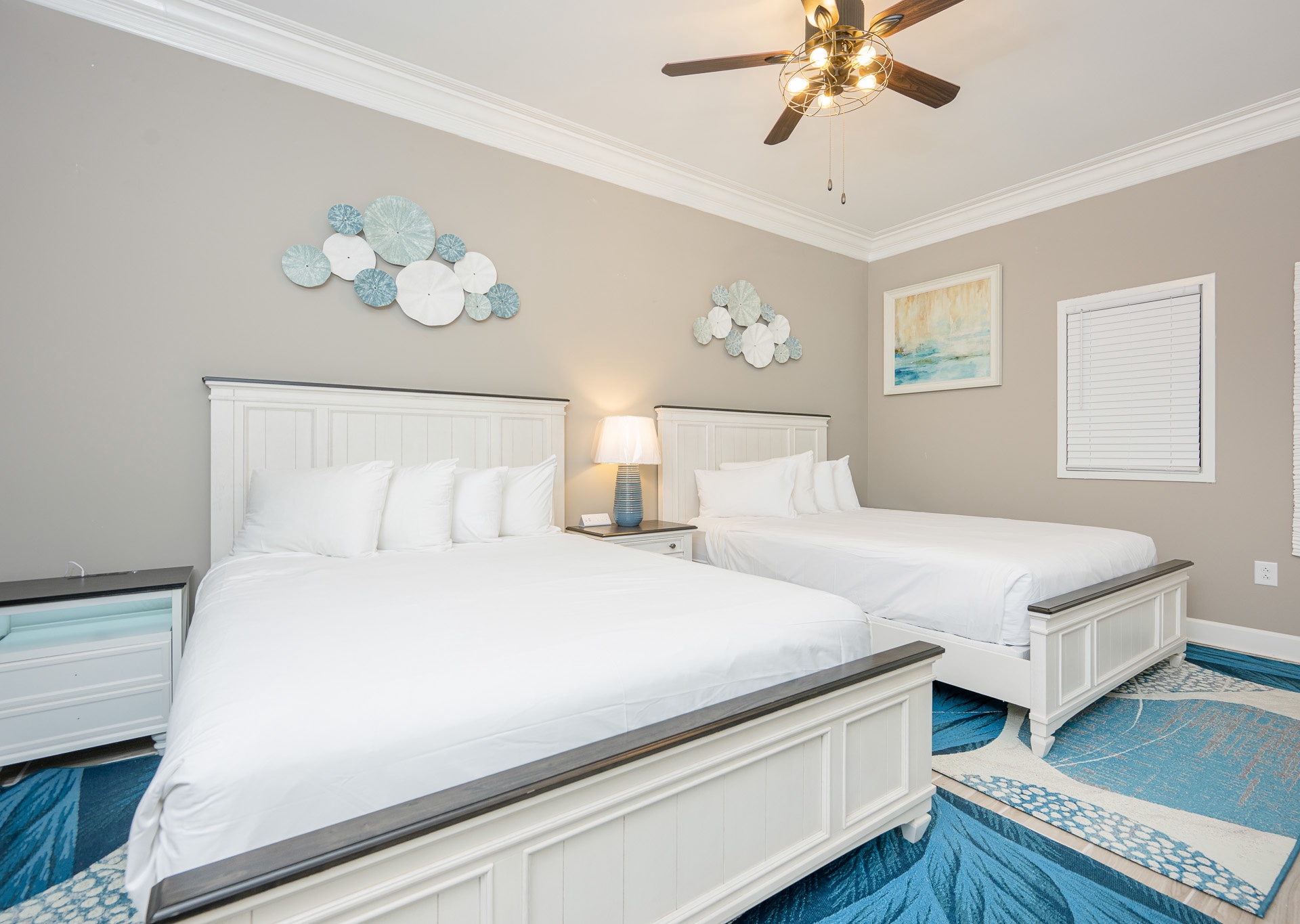 The primary bedroom suite offers private balcony access, a flat-screen TV, ceiling fan, and a luxurious en suite bath with double vanities, a soaking tub, and a glass walk-in shower with a handheld showerhead. Both the second and third bedrooms each feature two queen beds, flat-screen TVs, and ceiling fans, ensuring every guest enjoys their own comfortable retreat.