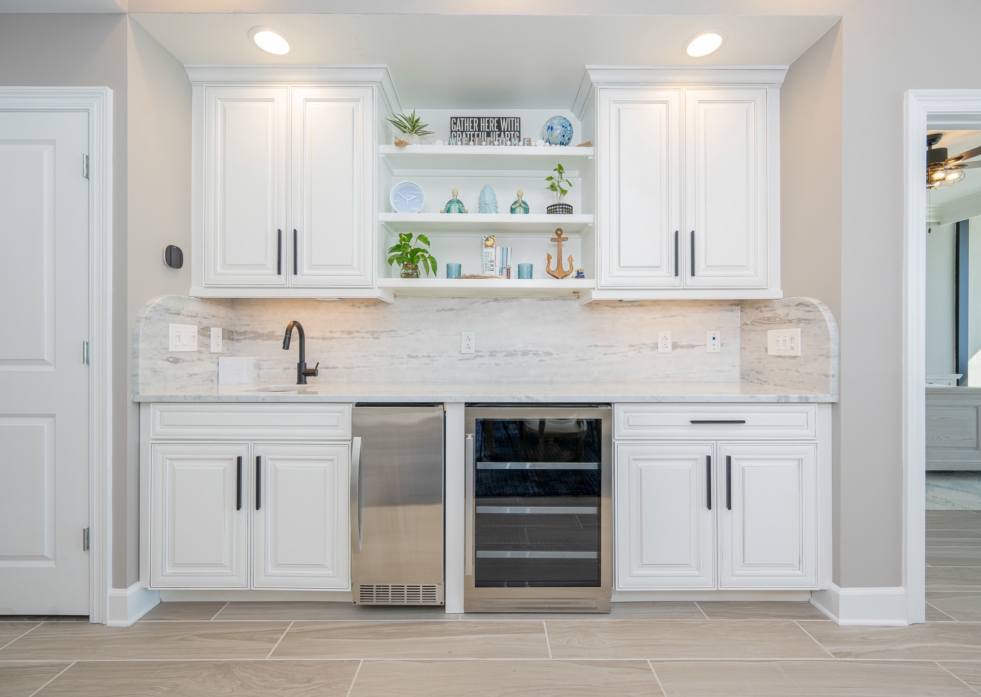 - Kitchens with stainless steel appliances, granite countertops, custom cabinets, a wet bar with an ice maker, and a tile backsplash.