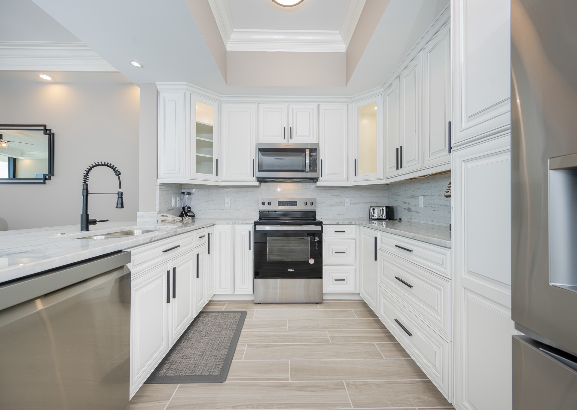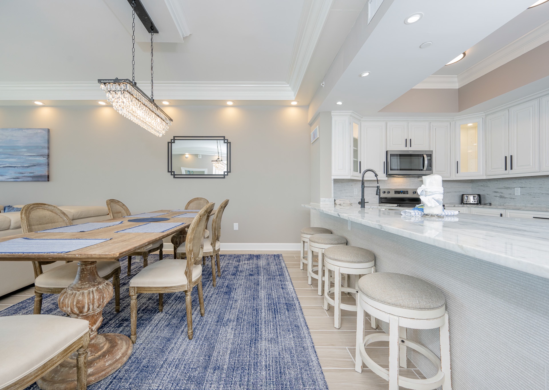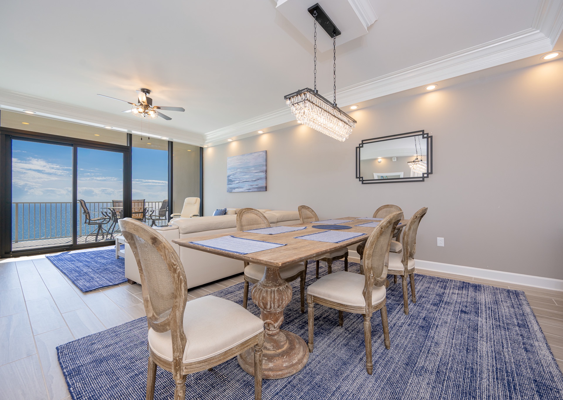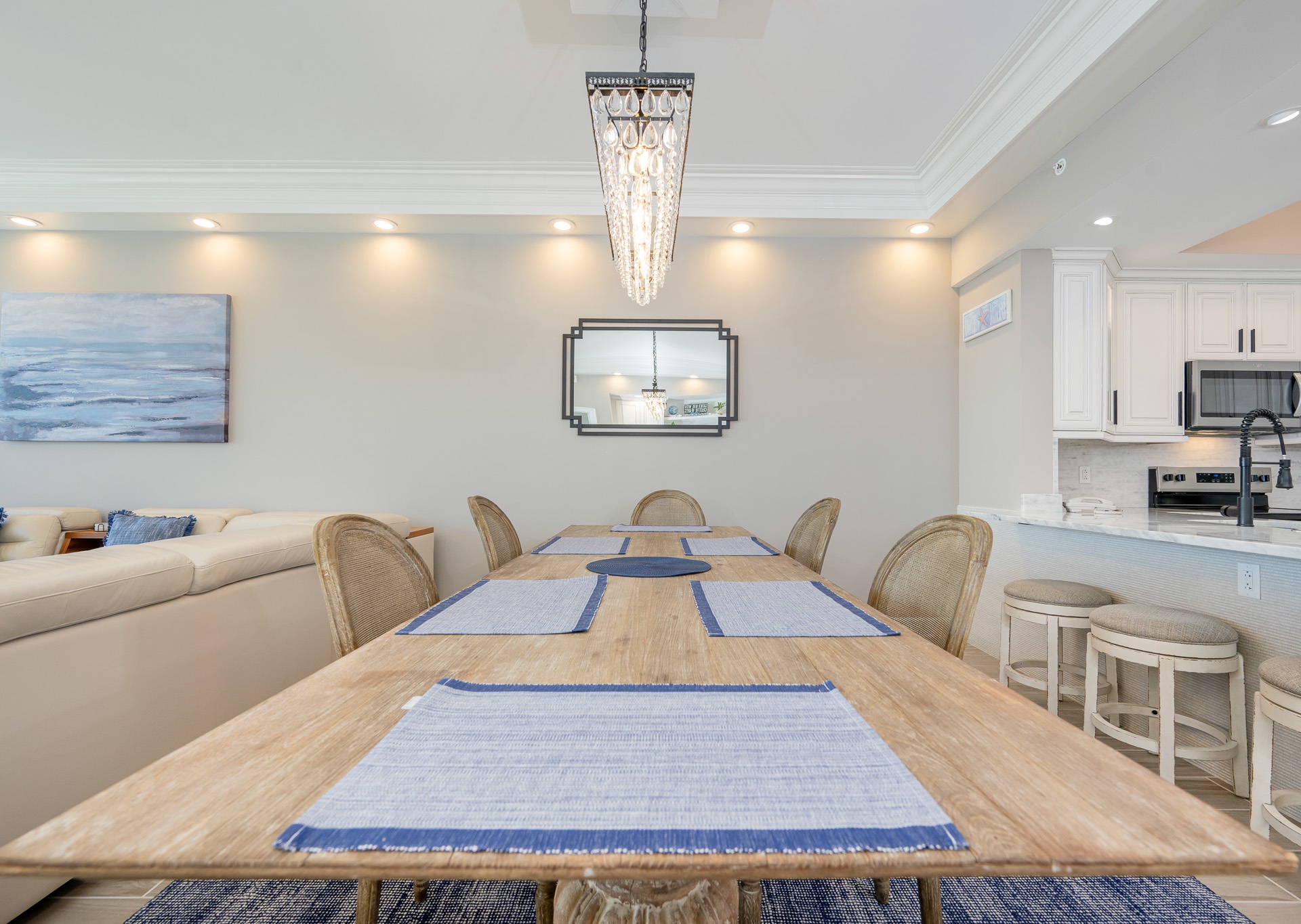 The dining area comfortably seats six and opens to the tiled balcony, where you’ll find plenty of outdoor furniture, including chaise lounges, a table, and chairs—an ideal setting for al fresco dining or watching the sunset over the Gulf.
