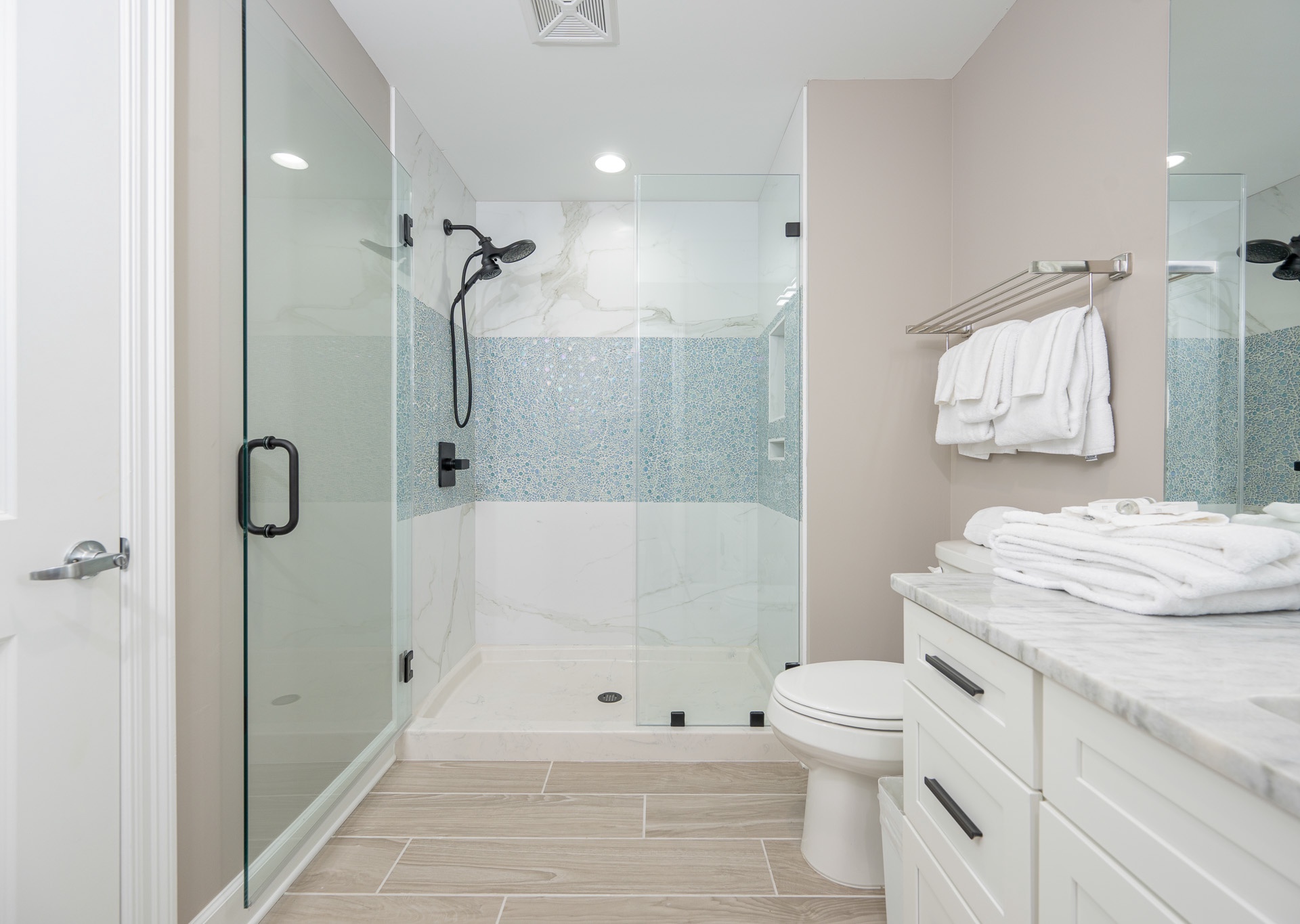The second bathroom includes a tub/shower combination and single vanity, while the third bathroom offers a large tiled walk-in shower with a handheld showerhead and a single vanity.