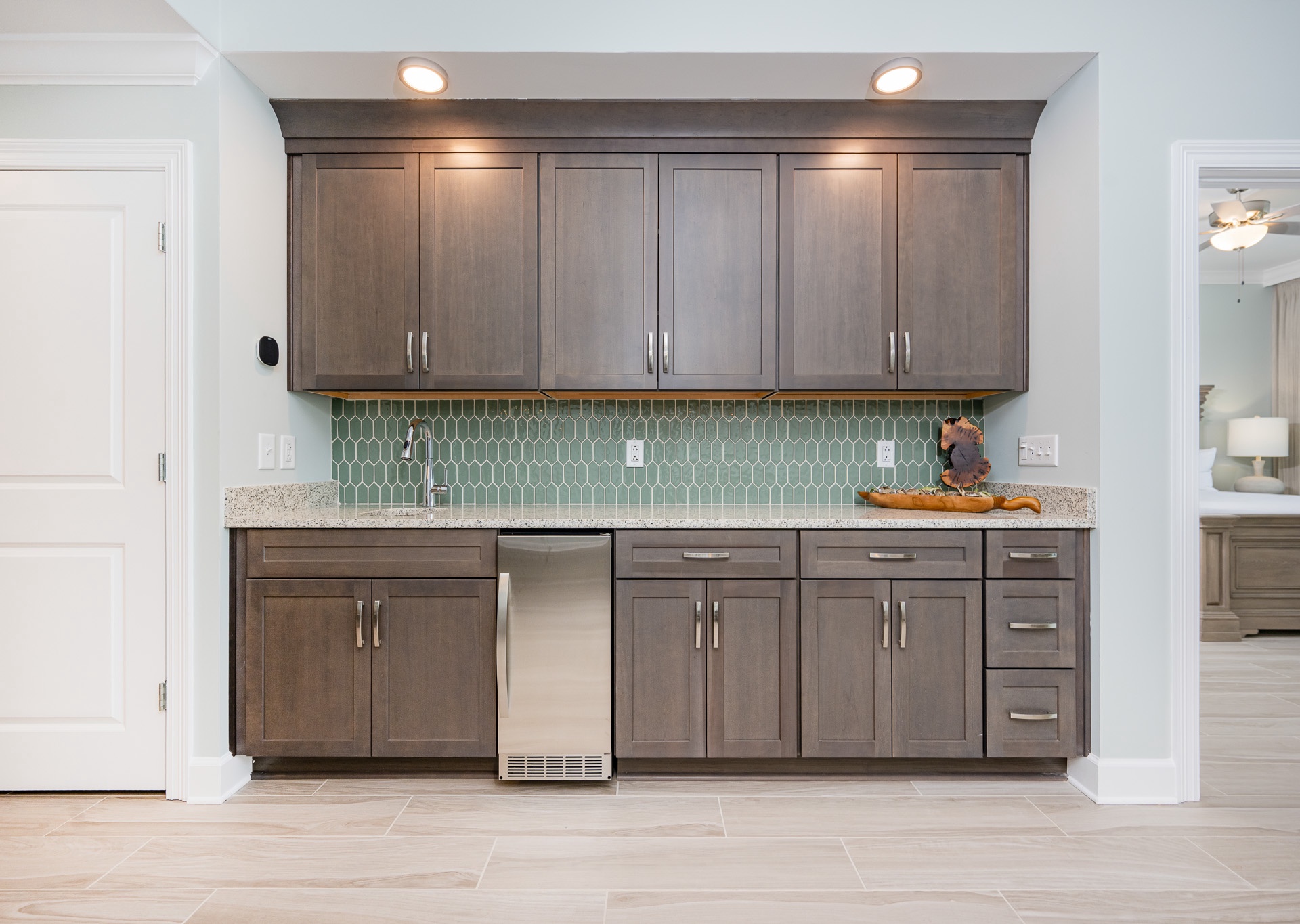 - Kitchens with stainless steel appliances, granite countertops, custom cabinets, a wet bar with an ice maker, and a tile backsplash.