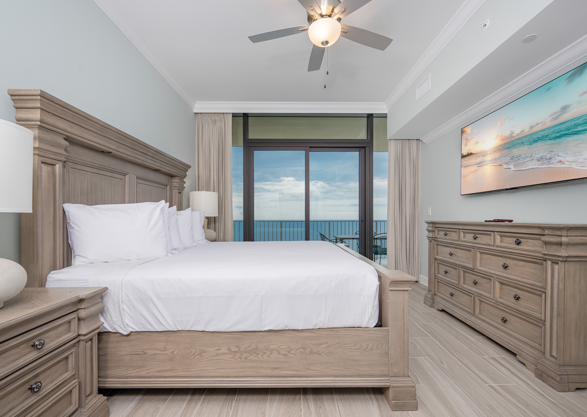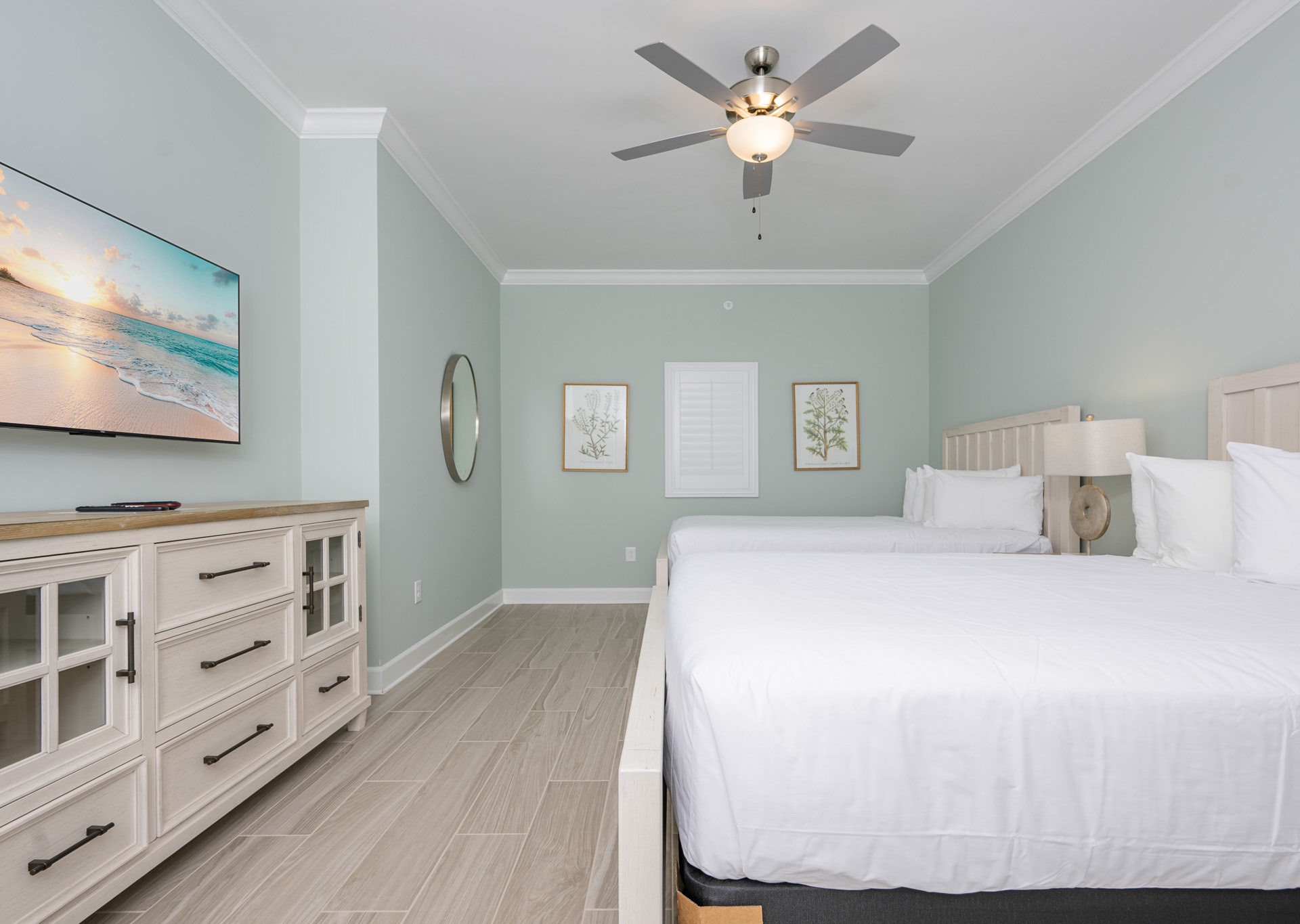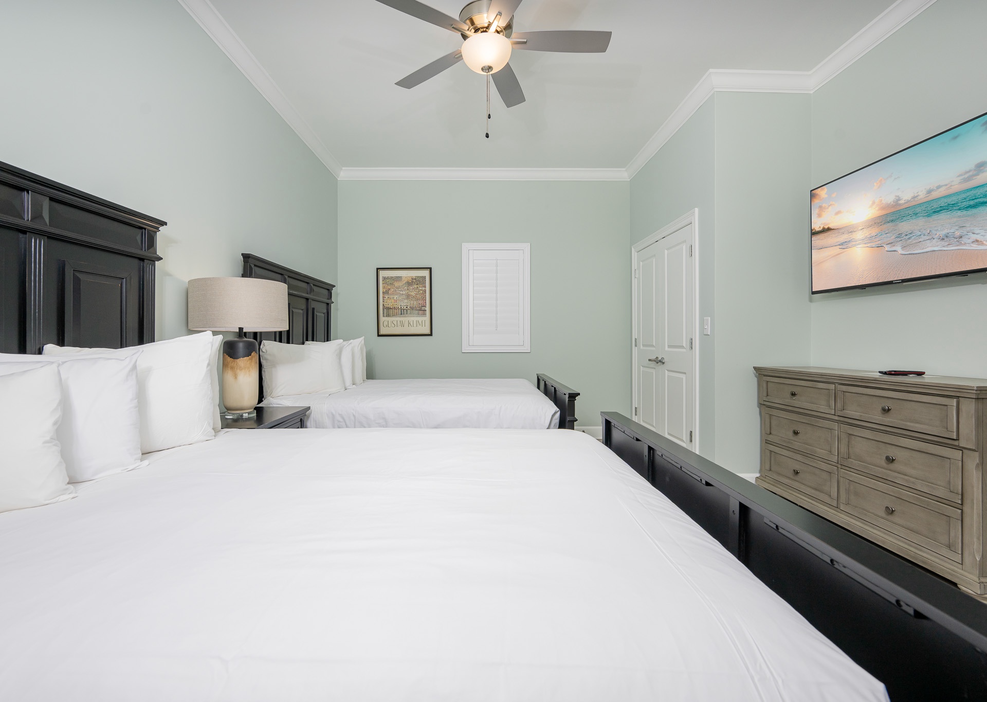 The master suite is a true retreat, featuring a king bed, private balcony access, and an en-suite bathroom with a double vanity, Jacuzzi tub, and walk-in shower. The second and third bedrooms each offer two queen beds and their own bathrooms for ultimate convenience. The second bath includes a tub/shower combo, while the third has a walk-in shower and single vanity, accessible from both the bedroom and hallway.