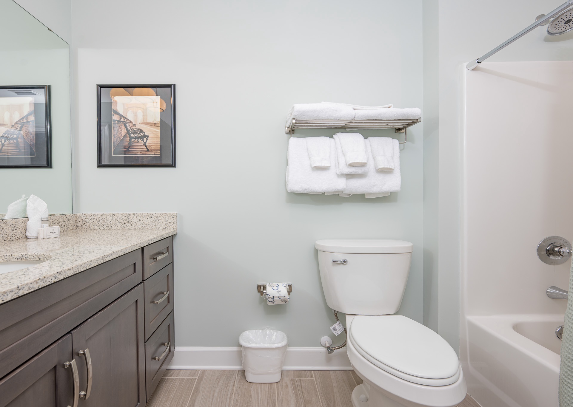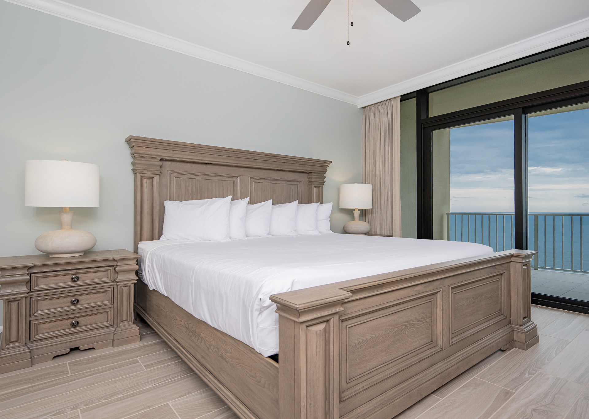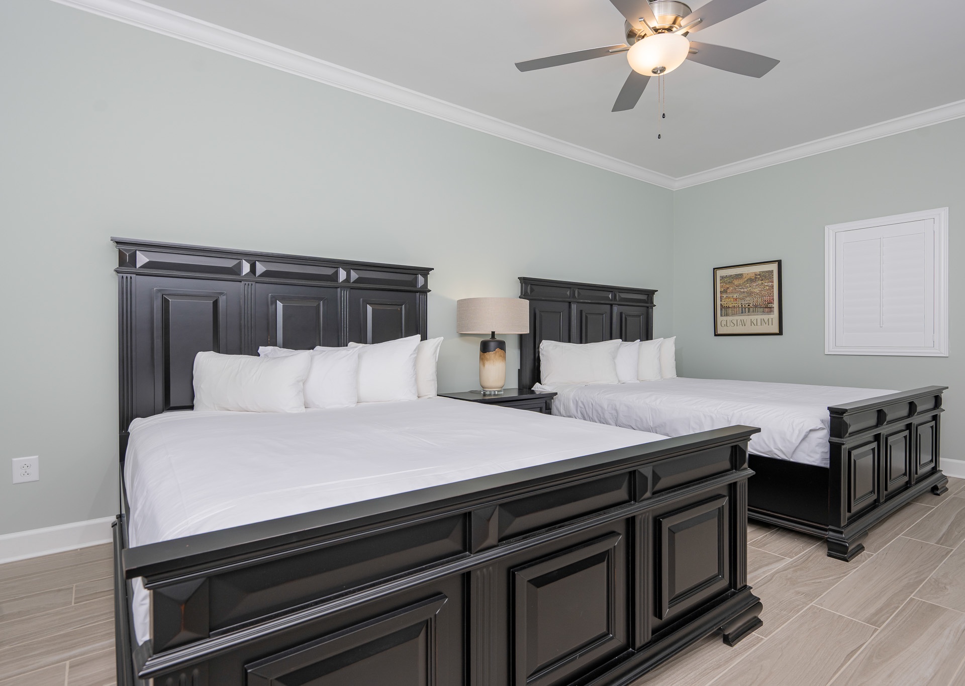 The master suite is a true retreat, featuring a king bed, private balcony access, and an en-suite bathroom with a double vanity, Jacuzzi tub, and walk-in shower. The second and third bedrooms each offer two queen beds and their own bathrooms for ultimate convenience. The second bath includes a tub/shower combo, while the third has a walk-in shower and single vanity, accessible from both the bedroom and hallway.