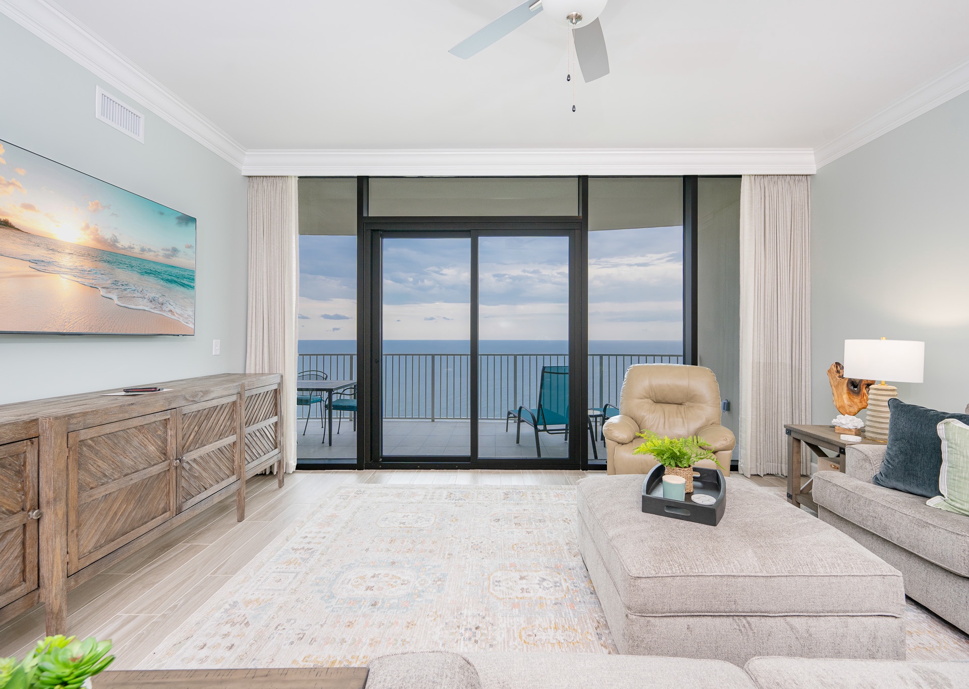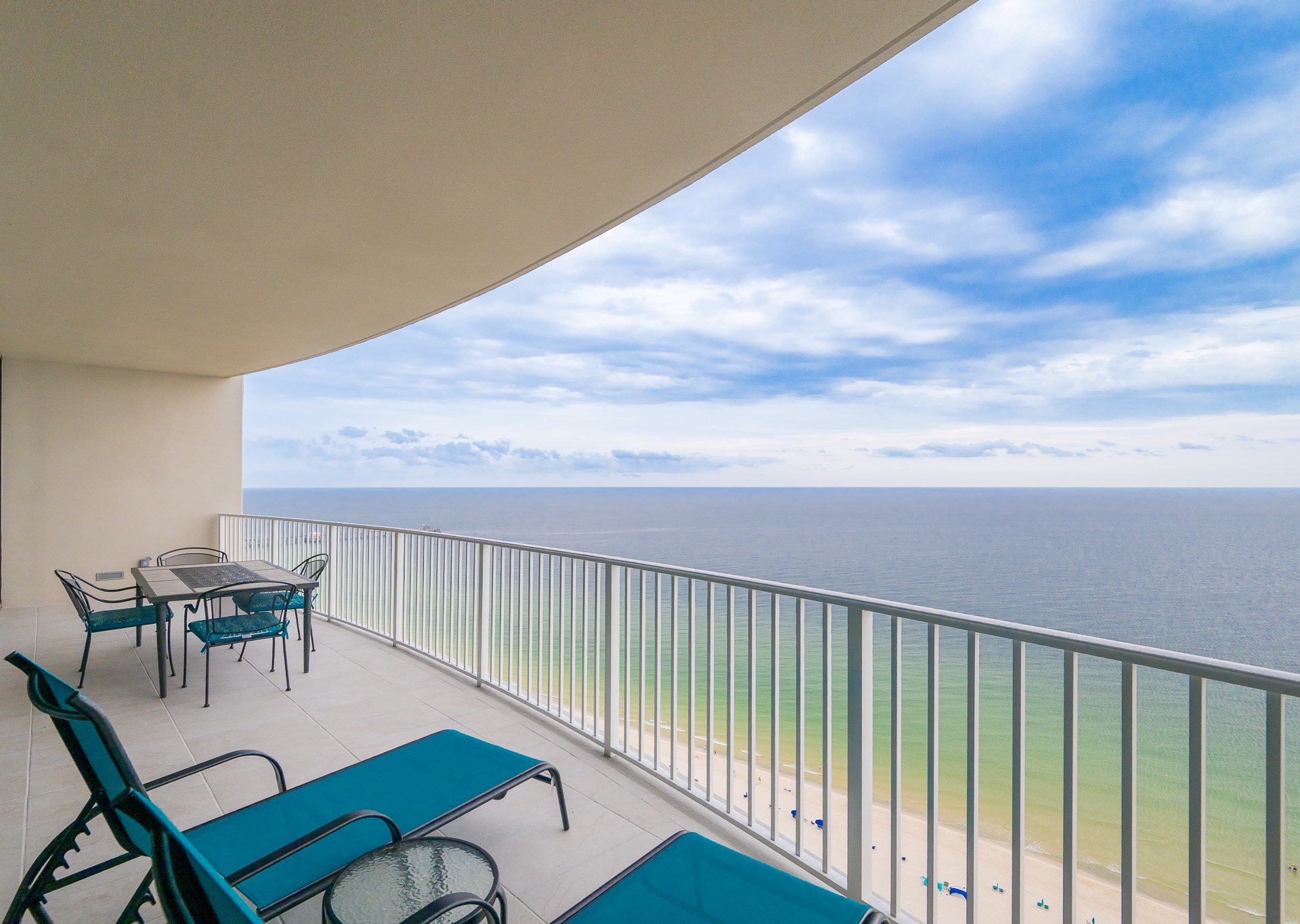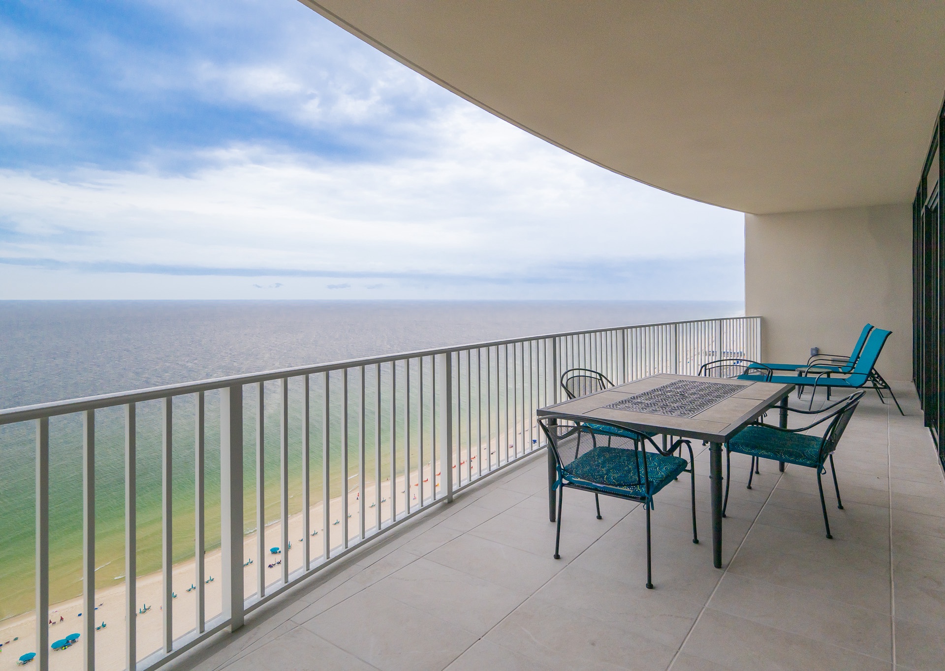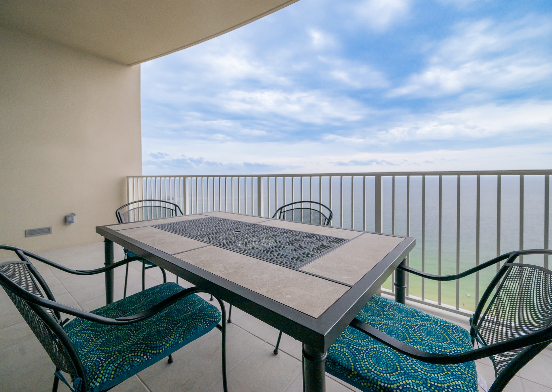 Step outside onto the tiled balcony, complete with a dining table, chairs, and chaise lounges—the perfect place to sip your morning coffee, share a meal al fresco, or simply relax while soaking up the refreshing Gulf breeze and breathtaking views.