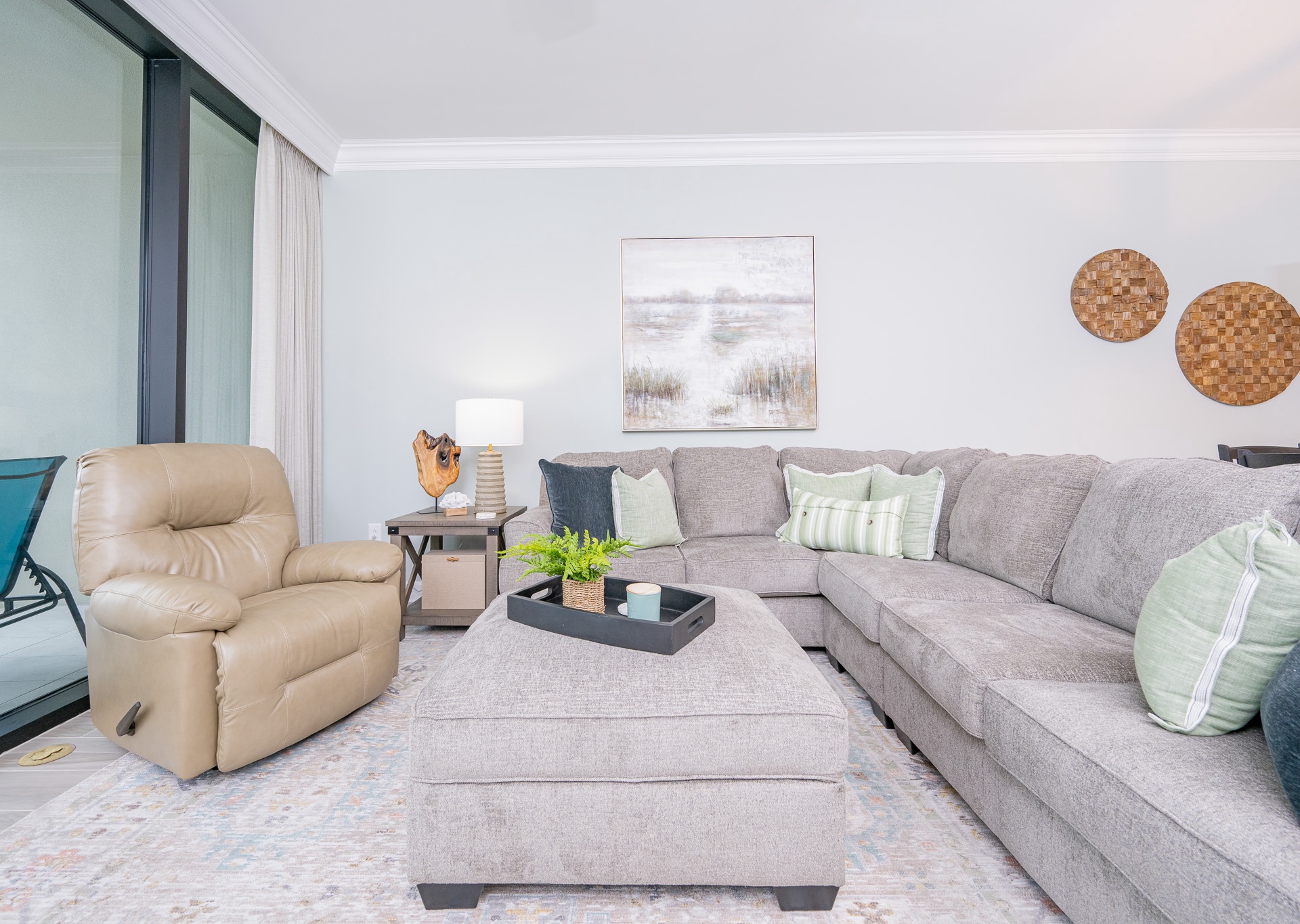 - Living areas with floor-to-ceiling windows, 10-foot smooth ceilings, large tile flooring, and crown molding.