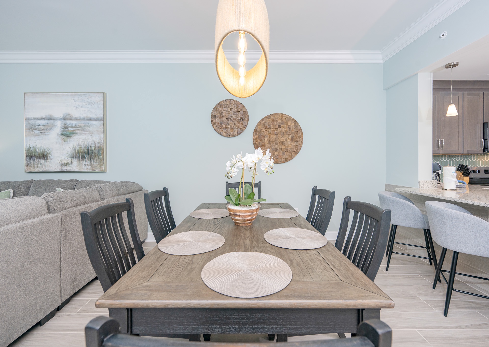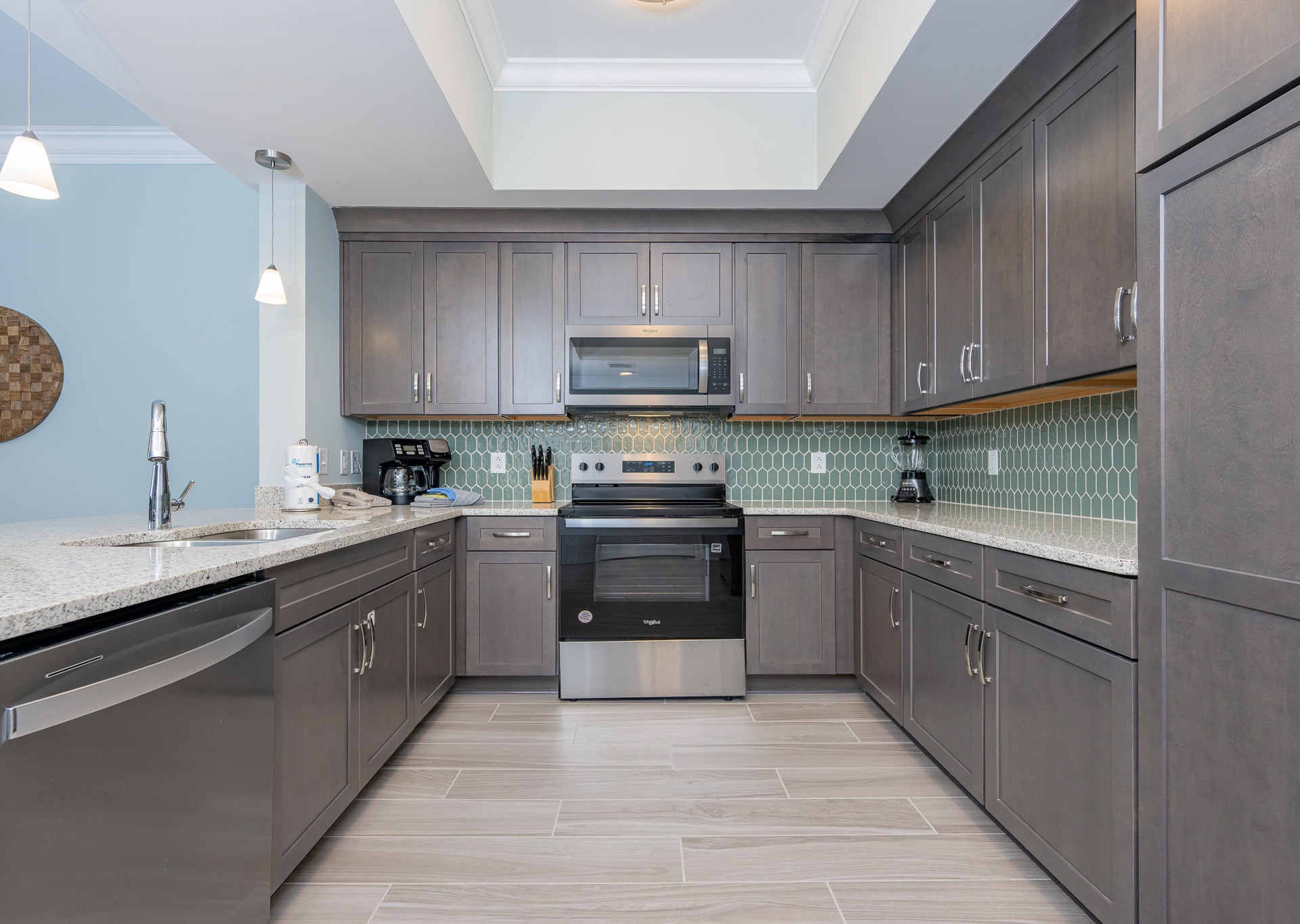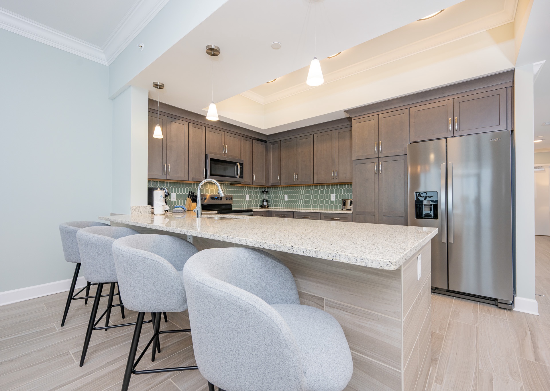 Inside, the open living area invites you to unwind with a large sectional sofa, cozy recliner, and flat-screen TV. The fully equipped kitchen boasts stainless steel appliances, an inset sink, a regular coffee maker, and a Keurig, plus a breakfast bar with seating for four. Gather around the dining table for six, accented by a beautiful chandelier, or entertain at the adjacent wet bar with a tile backsplash, your own ice maker, and a small sink—perfect for mixing cocktails after a day at the beach.
