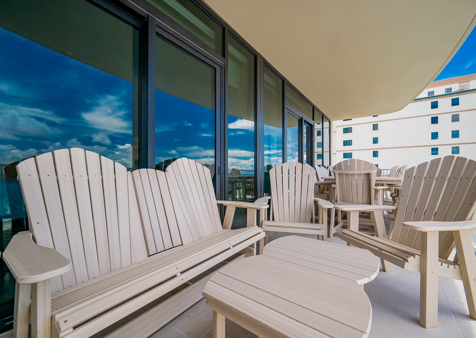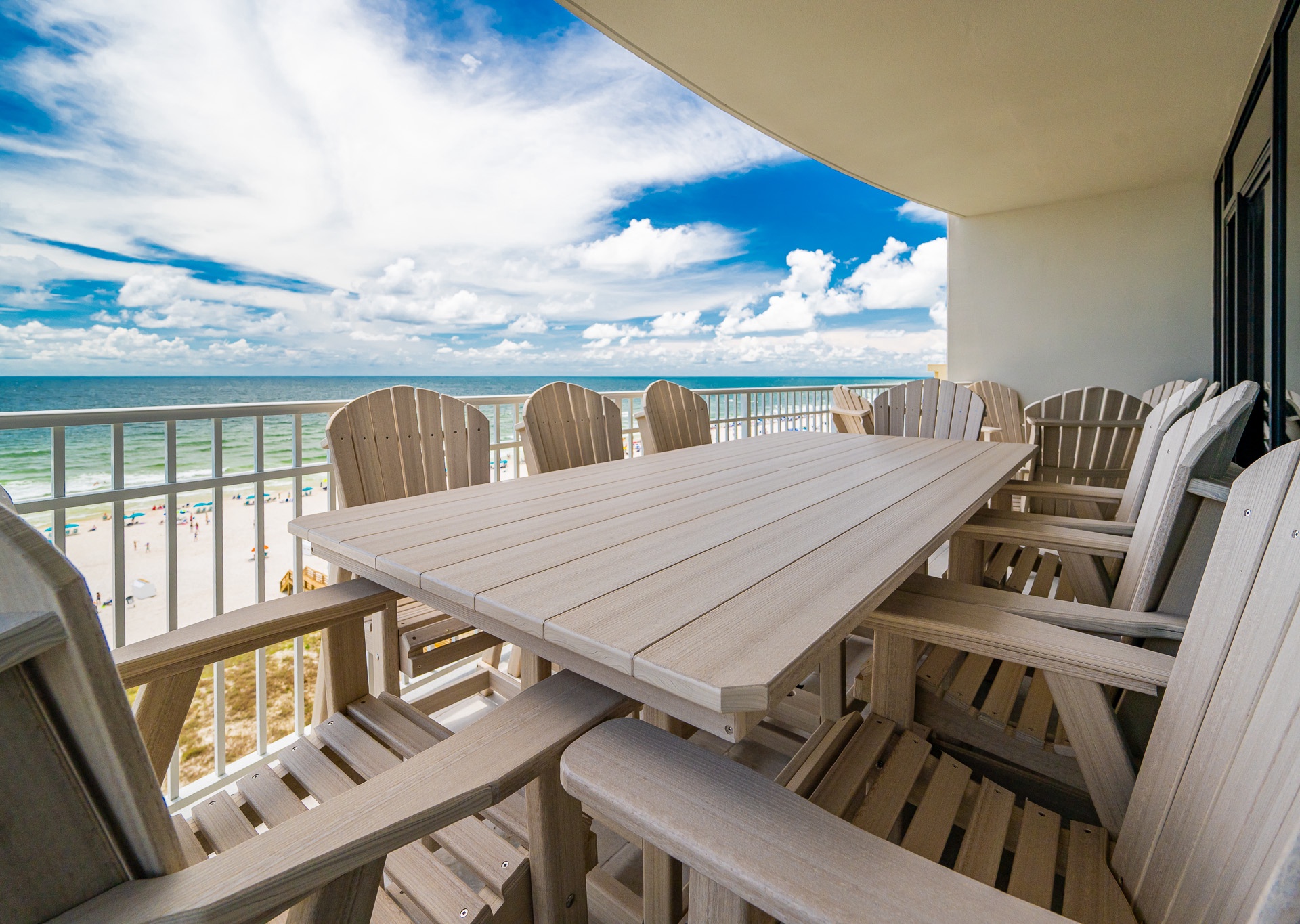 Step outside to the expansive corner balcony, perfectly furnished with high-quality POLYWOOD furniture, including: