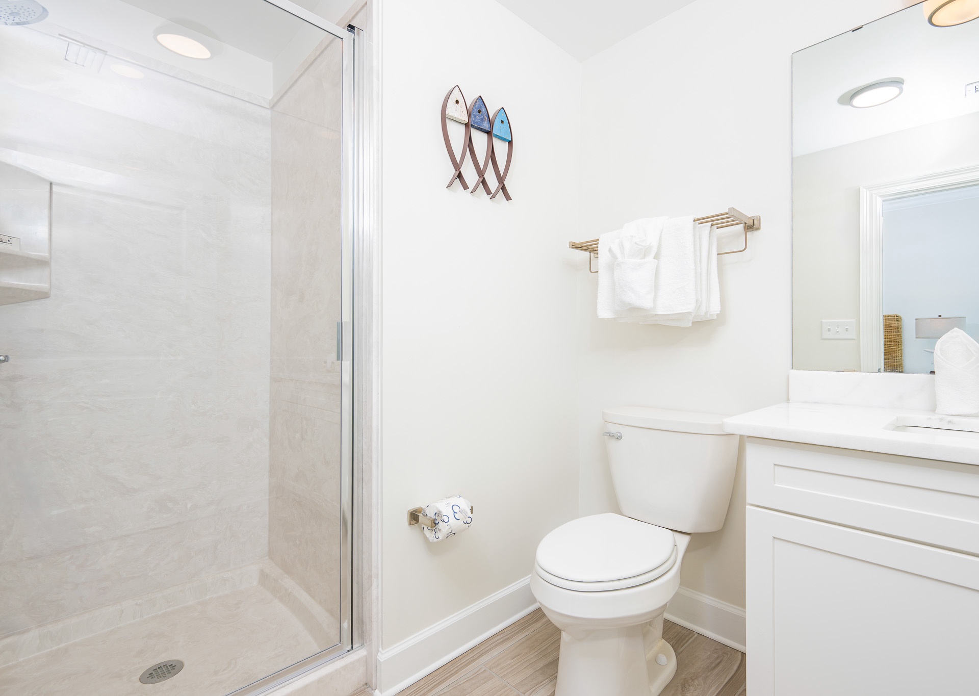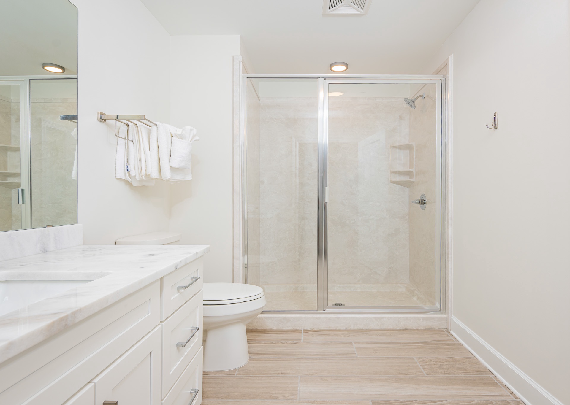 • The second and third guest bathrooms each have walk-in showers and single vanities