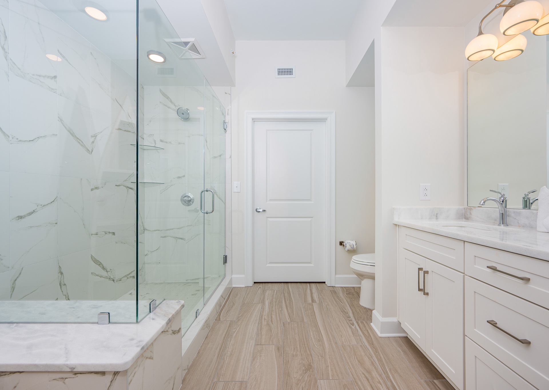 • The master bathroom features a double vanity and a glass walk-in shower, with sleek finishes and great lighting