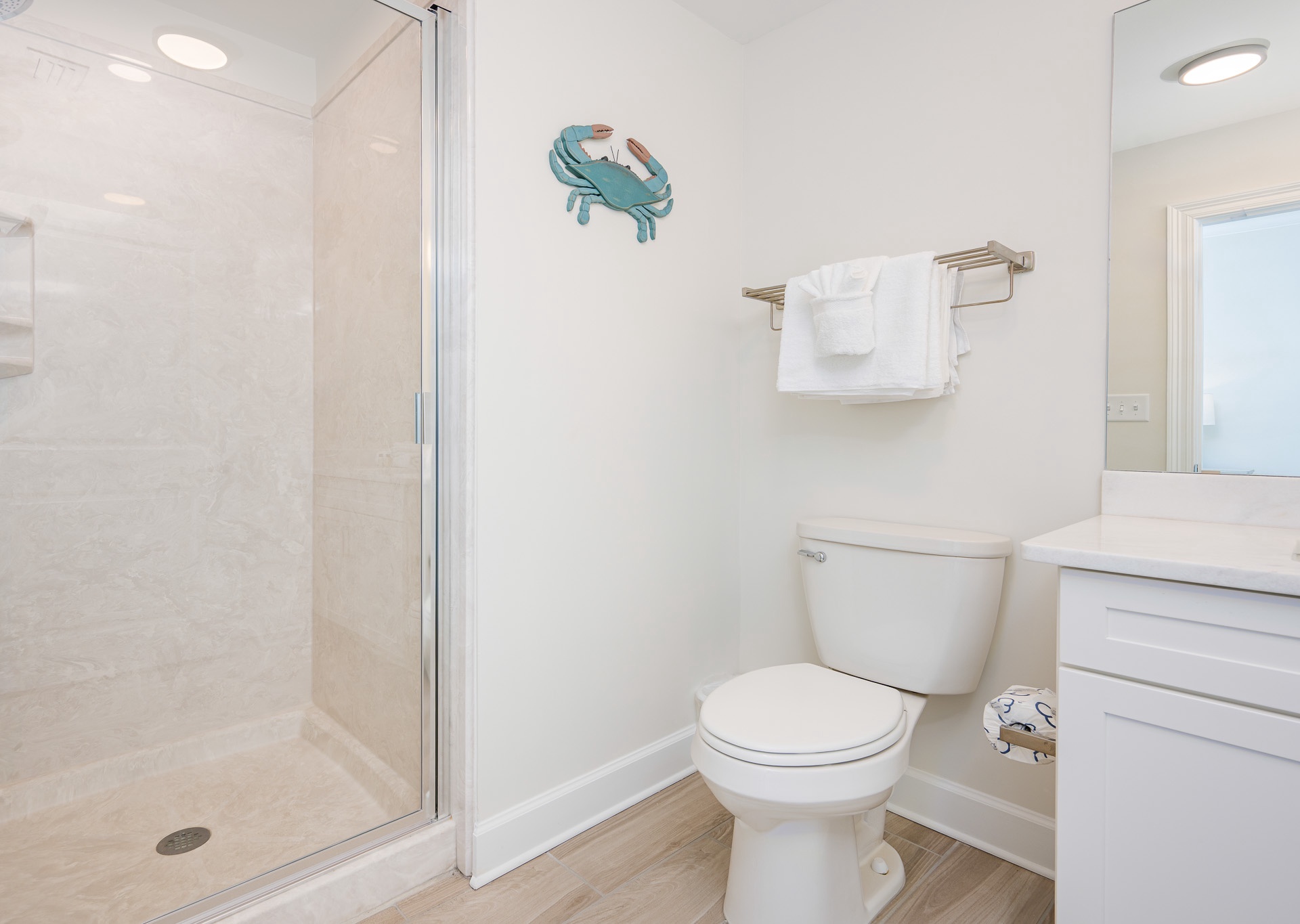 • The bunk bedroom bathroom includes a single vanity and walk-in shower, accessible both from the bedroom and the hallway for shared convenience