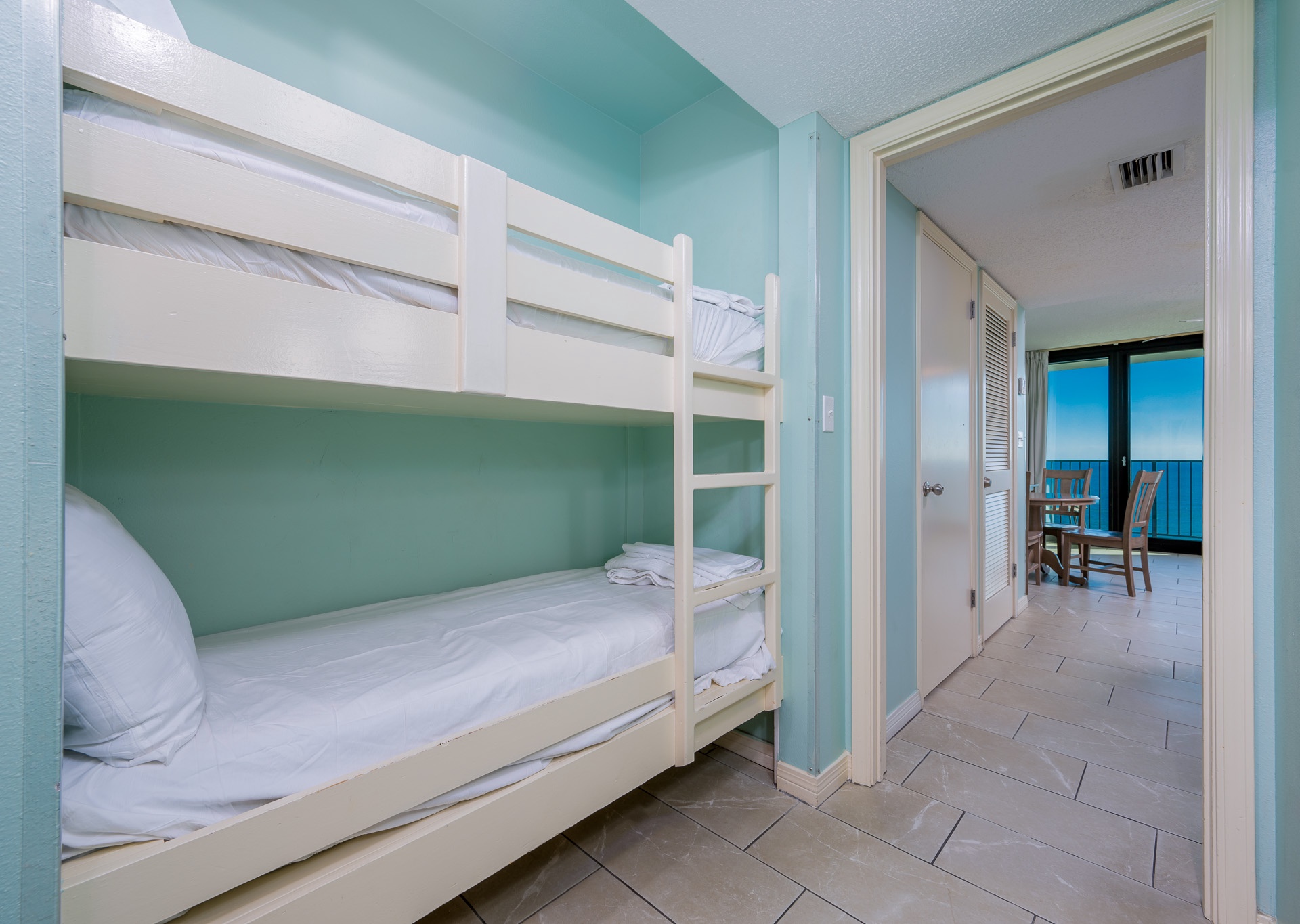 The suite features a full-size kitchen, fully equipped for your cooking needs, and a separate living room to relax after a day of fun in the sun. The private bedroom includes a cozy king-size bed with an en-suite bathroom, while the hallway features built-in bunk beds perfect for small children. An additional half bath adds extra convenience for your stay.