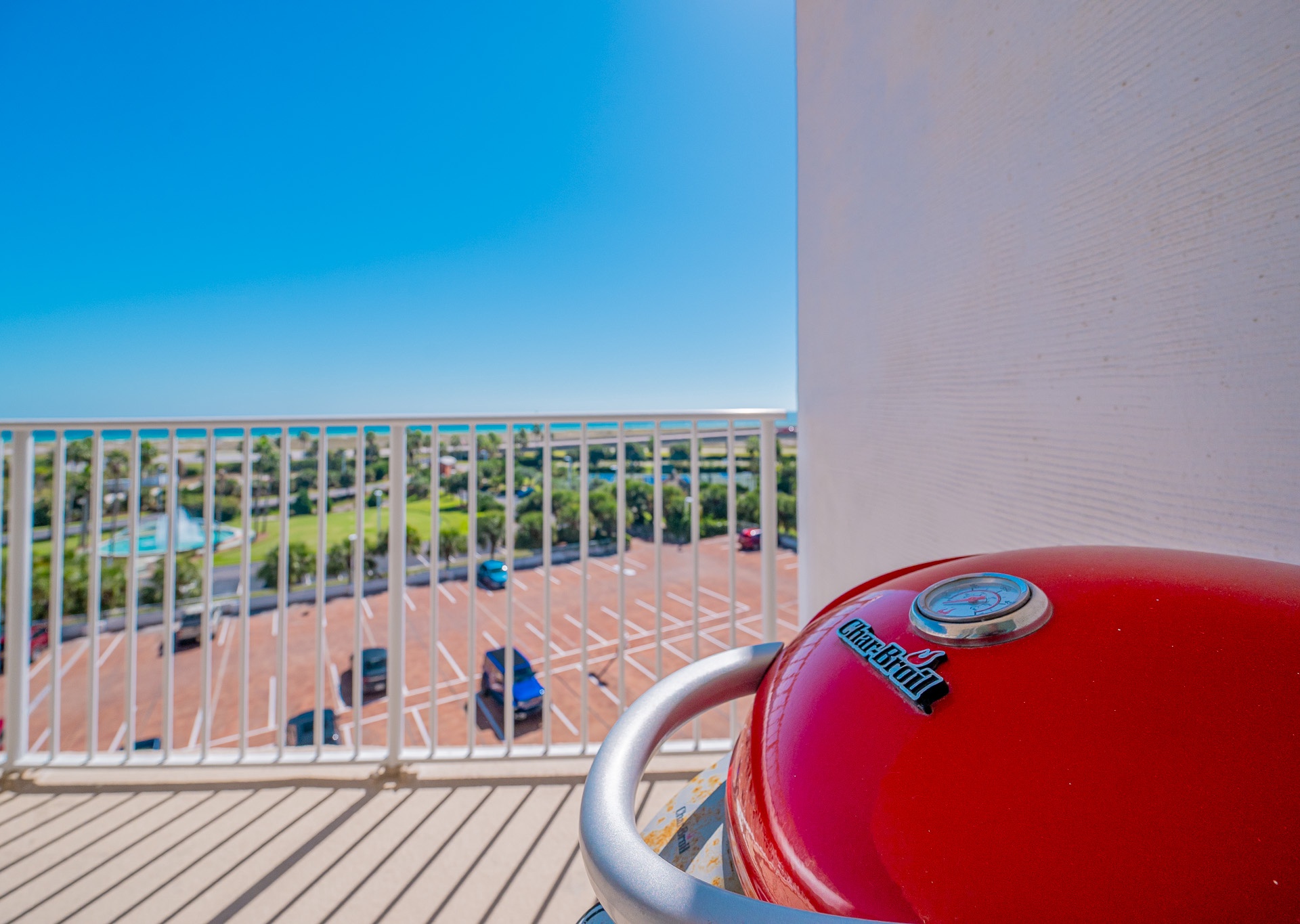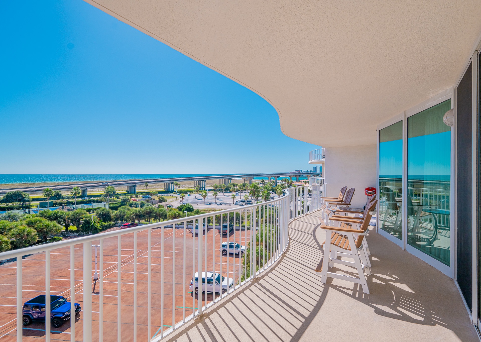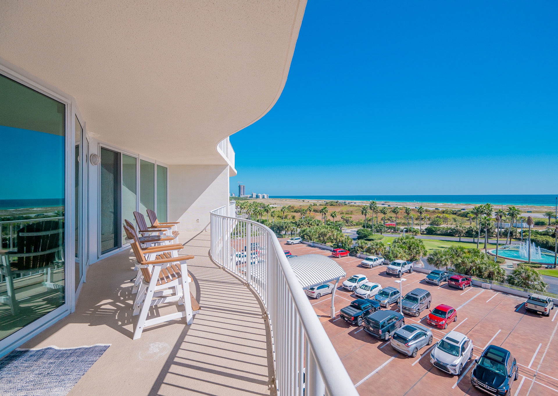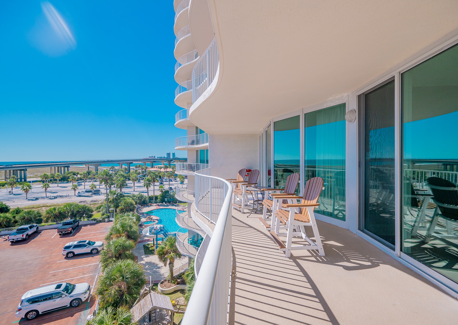 Floor-to-ceiling windows in the living room and master bedroom open onto an expansive balcony furnished with durable Pollywood furniture, perfect for relaxing with your morning coffee or watching the sunset over the resort grounds.