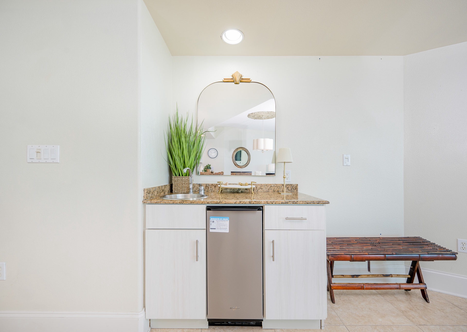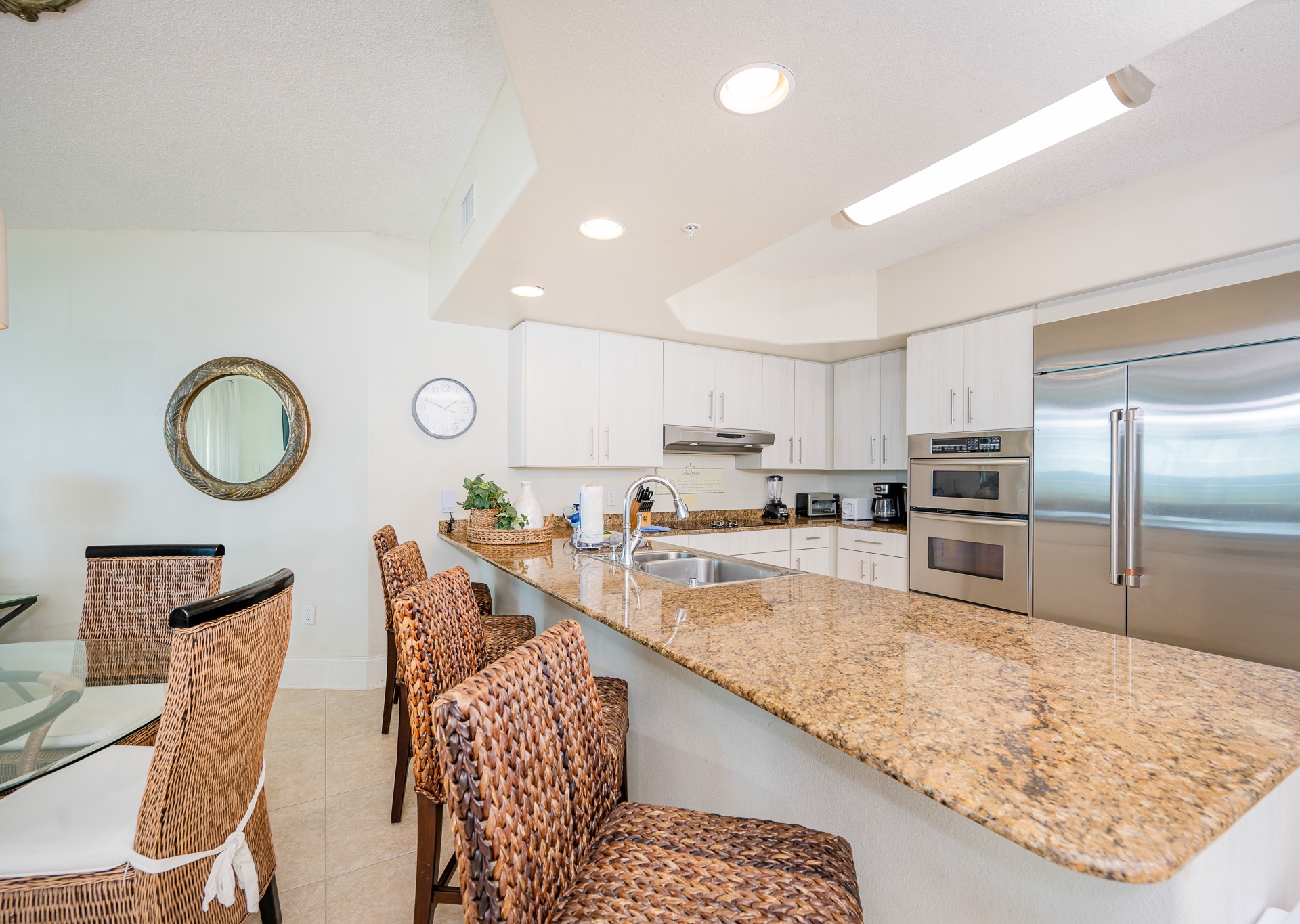 The chef’s dream kitchen is fully equipped with stainless steel appliances, a convection oven, granite countertops, and a large double refrigerator. An adjacent wet bar with a built-in ice maker makes entertaining a breeze.