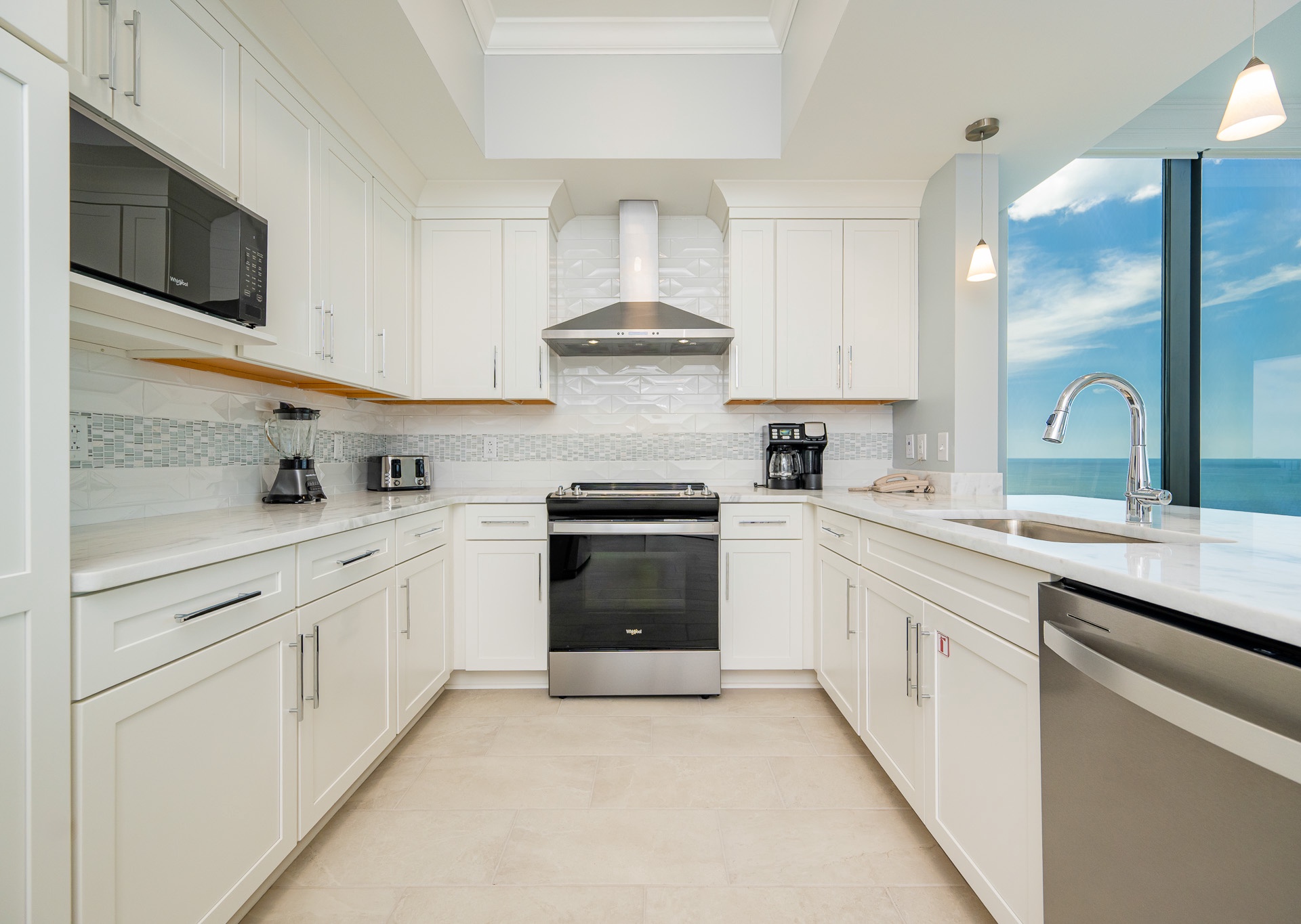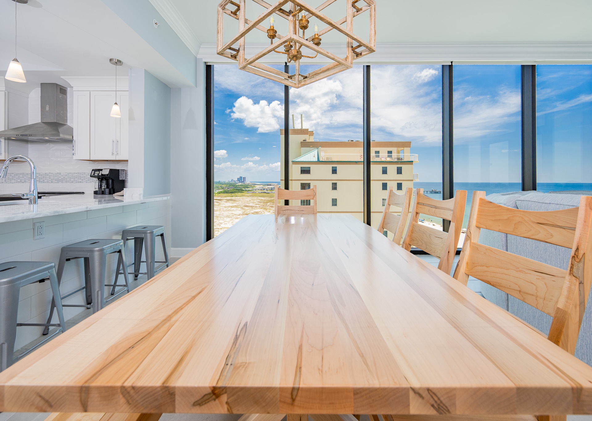 The kitchen is fully stocked and beautifully finished with stainless steel appliances, a Keurig and drip coffee maker, and ample counter space. The breakfast bar seats four, and the dining table offers seating for up to 10 with a mix of chairs and a bench.