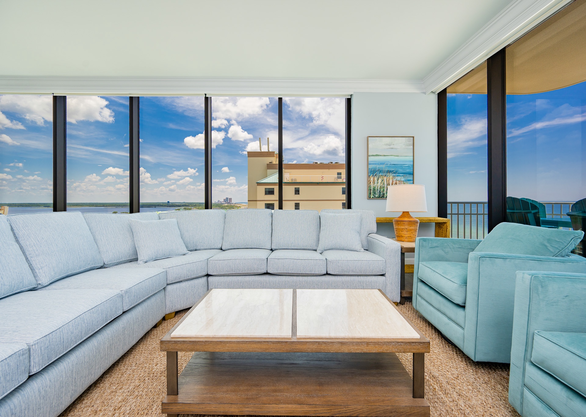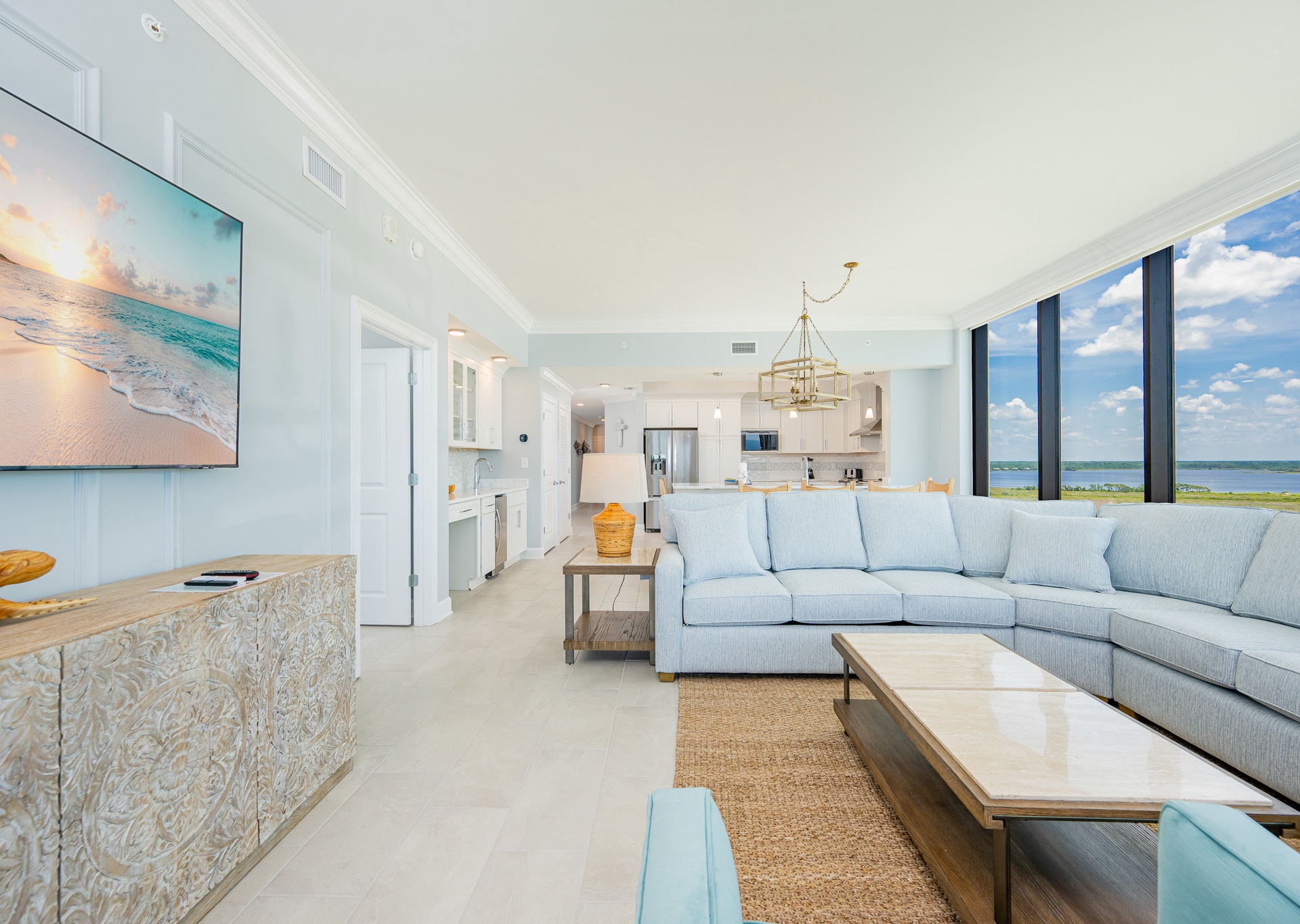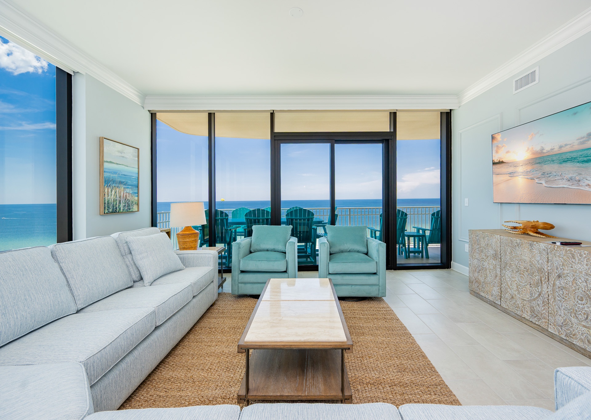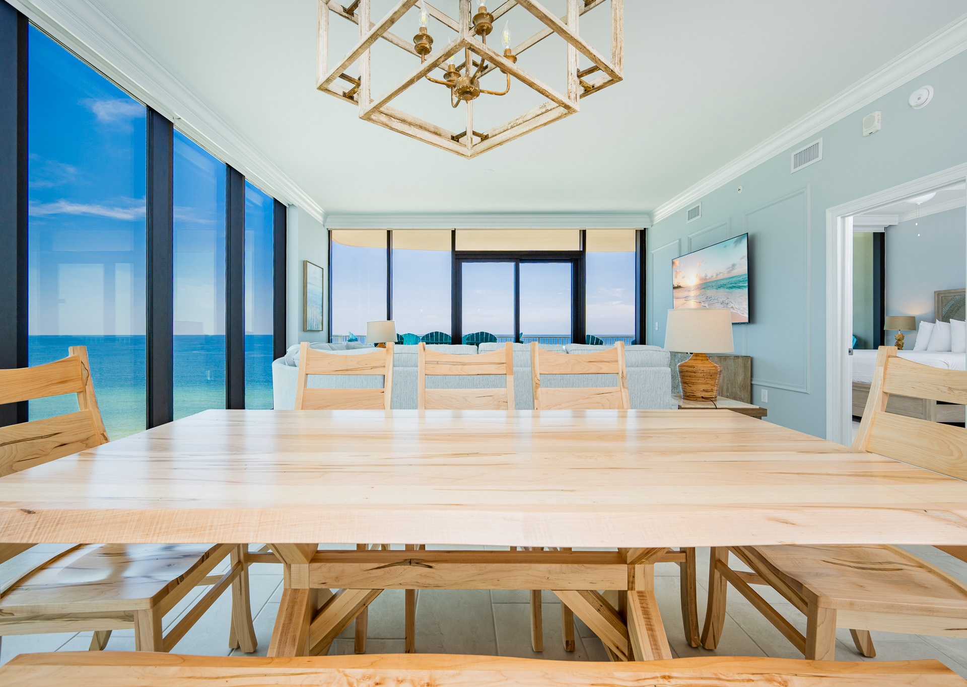 The living area is a showstopper—featuring floor-to-ceiling windows, a huge, comfortable sectional sofa, two swivel chairs, and a wall-mounted flat-screen TV, creating a perfect gathering space for your group. There’s plenty of natural light and room to spread out and enjoy time together.