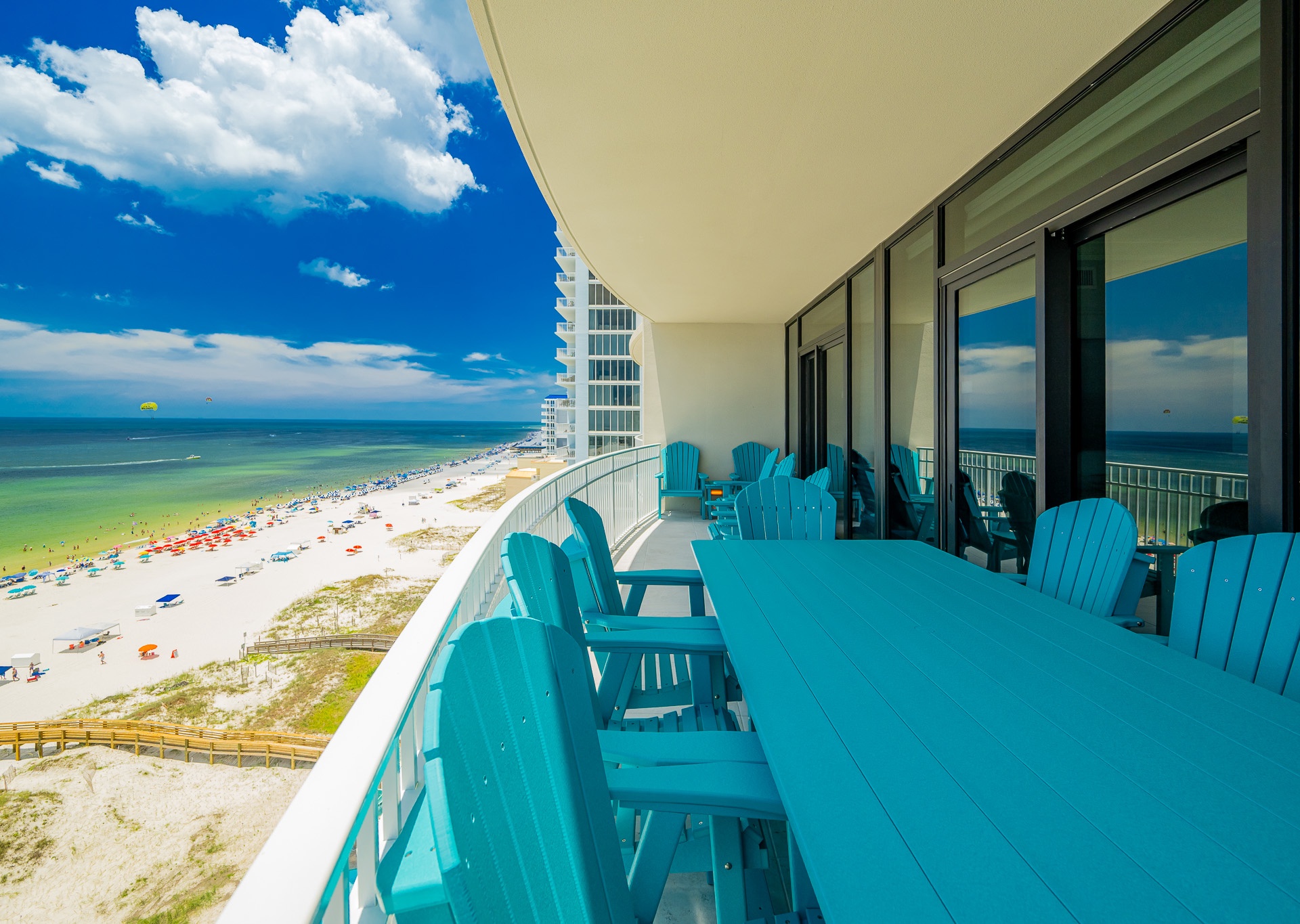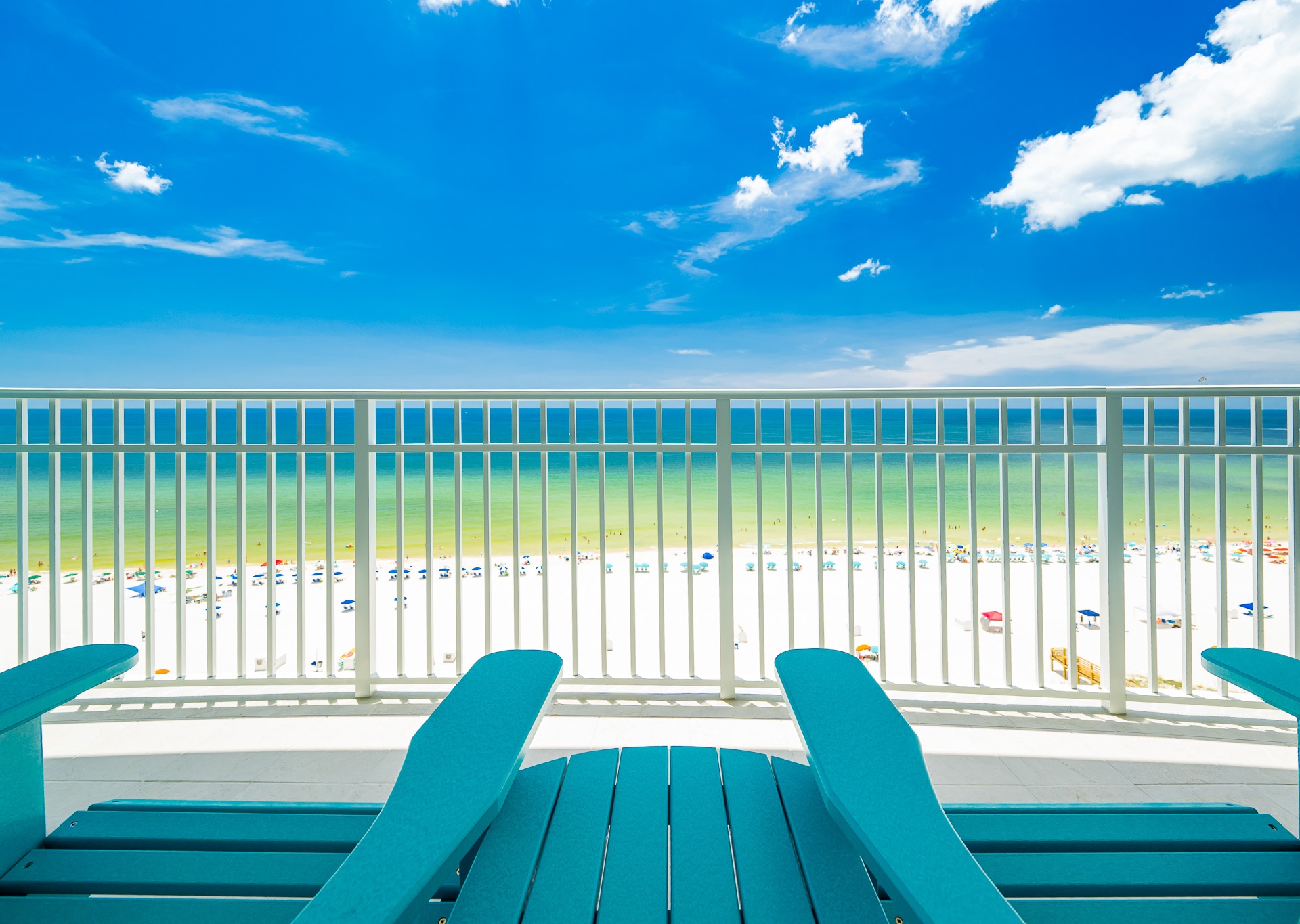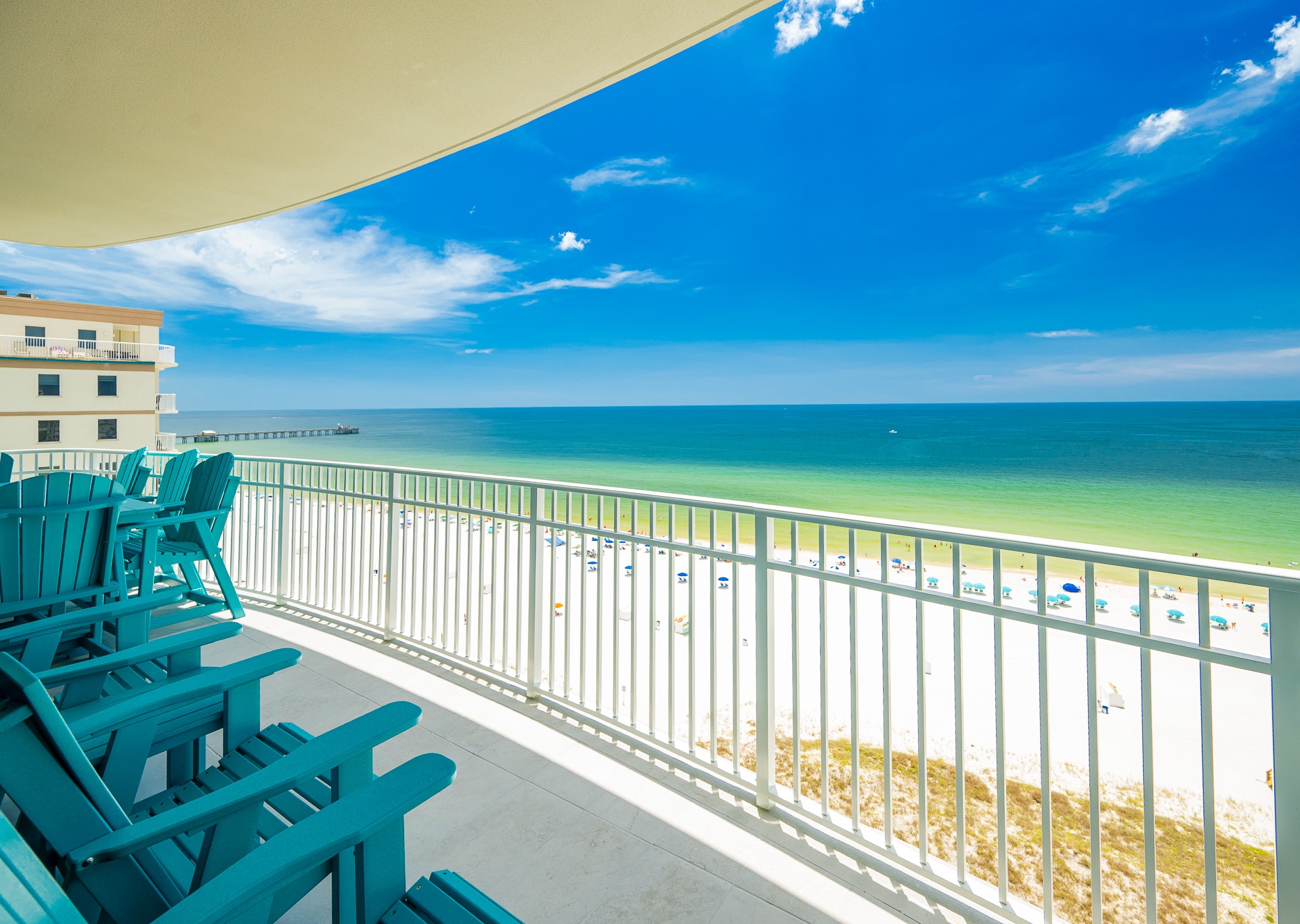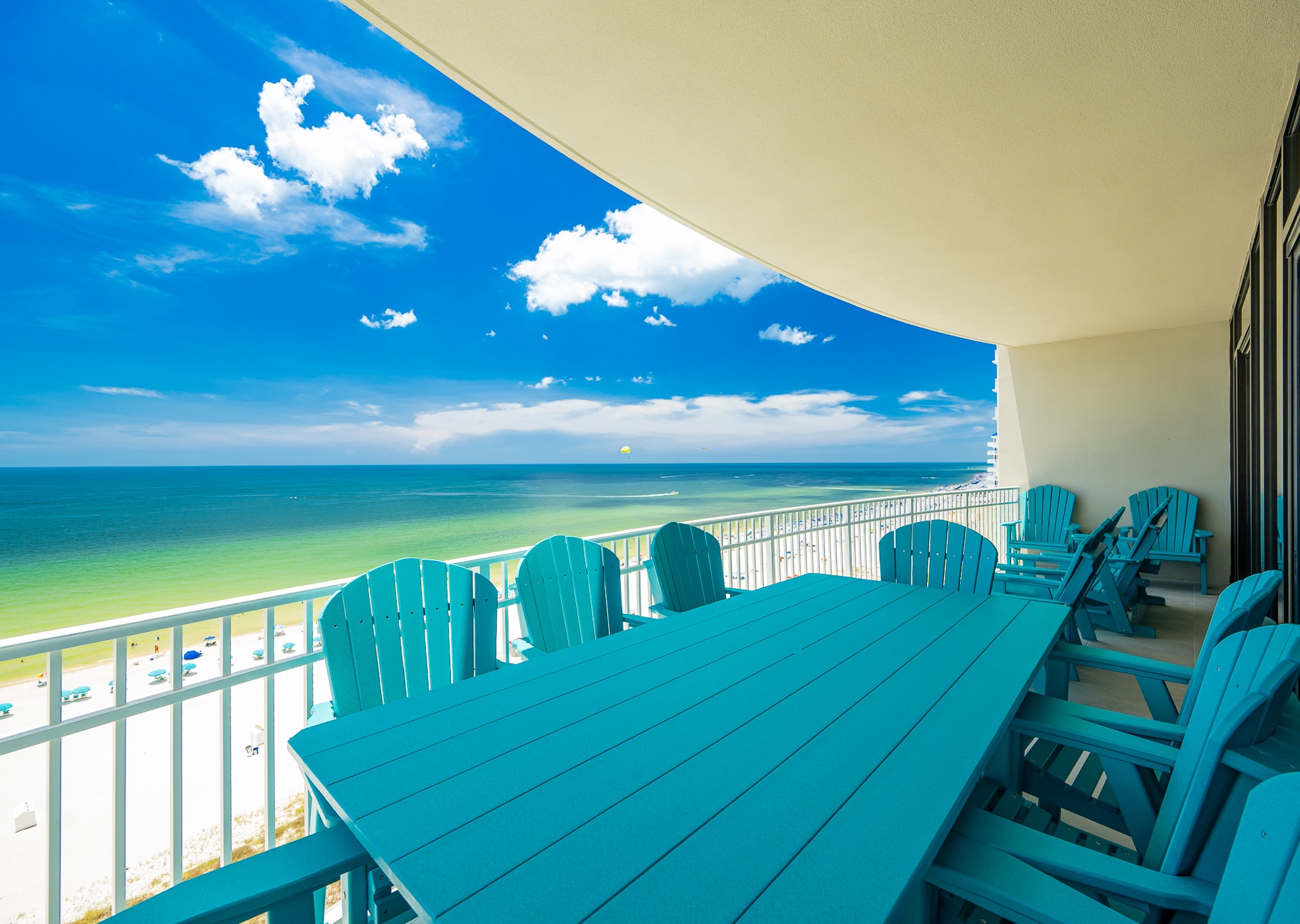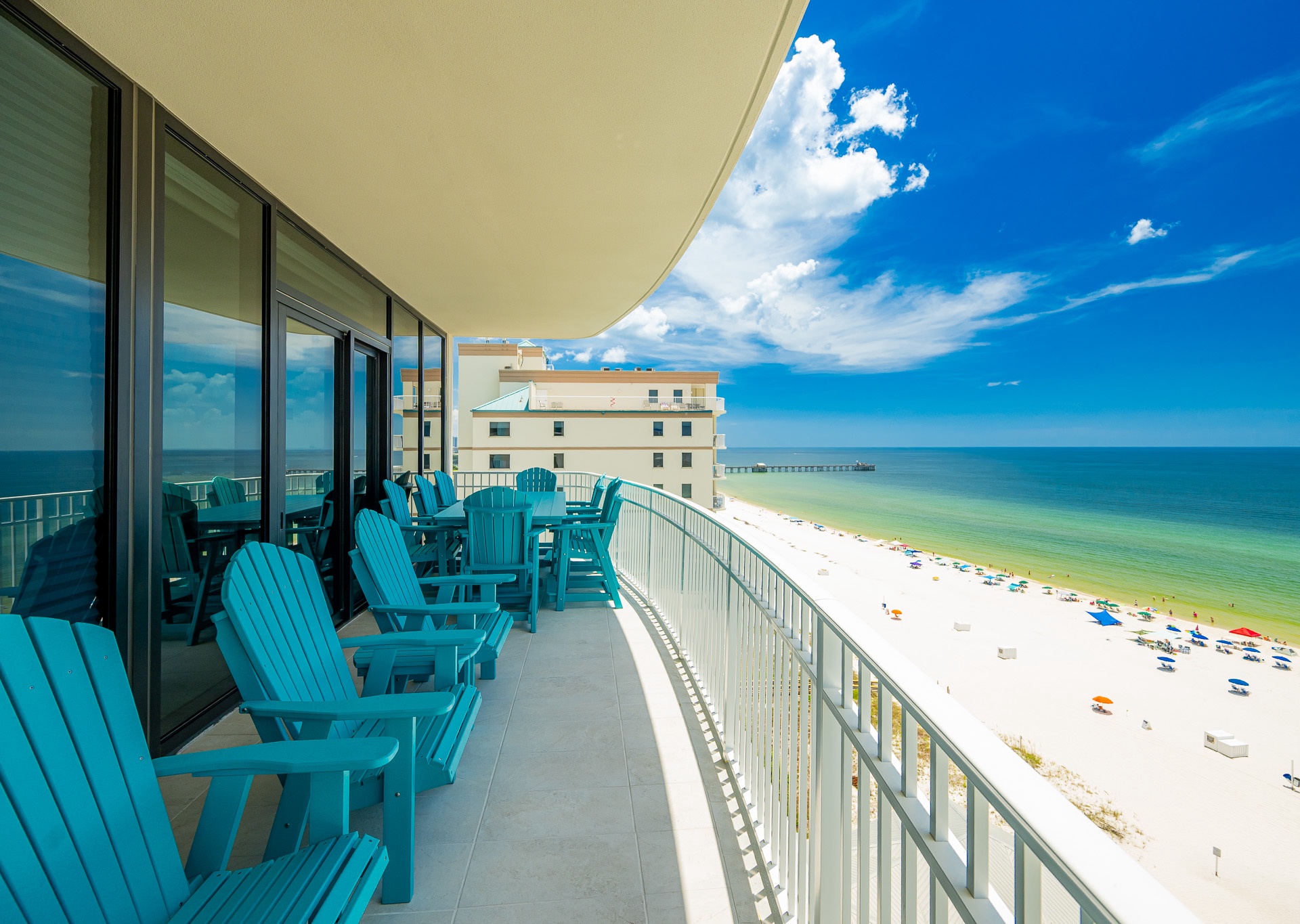 Step outside to the spacious Gulf-front balcony and enjoy the popular Polywood furniture—with plenty of seating for your entire group, including chairs, loungers, and a table for outdoor dining or relaxing. The views are unbeatable, overlooking the white sand beaches, lazy river, waterslide, and sparkling outdoor pool below.
